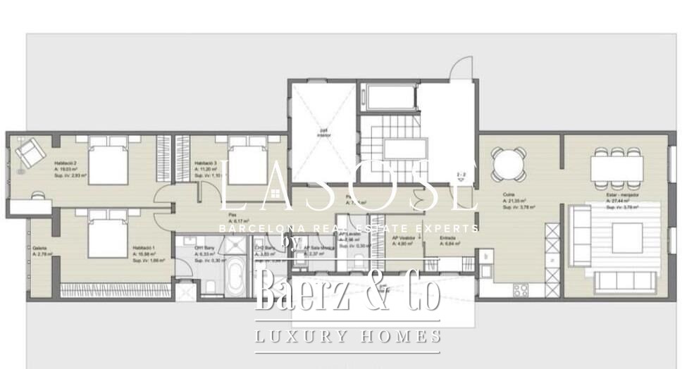 وتشكّل المطبخ المفتوح ومنطقة الطعام مركز المنزل، حيث تم تزويدهما بأجهزة حديثة وينسابان بشكل طبيعي نحو غرفة المعيشة الفسيحة والمضيئة ومساحة الطعام الكبيرة. تسمح النوافذ الواسعة لضوء برشلونة الطبيعي بأن يغمر الشقة، ليخلق أجواء هادئة فوق صخب المدينة. يوفّر التدفئة المركزية، وتكييف الهواء، وغرفة للغسيل سهولة وظيفية، مع تعزيزها بخزائن ملابس، ومصعد، وإمكانية الوصول إلى الشرفة لإطلالة متجددة وهواء نقي وأفق المدينة.