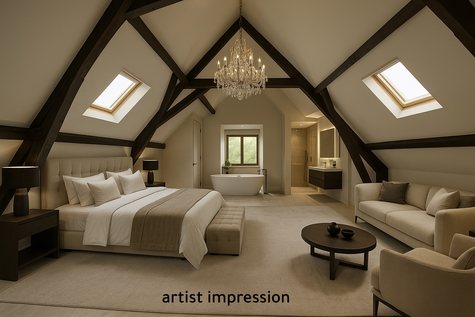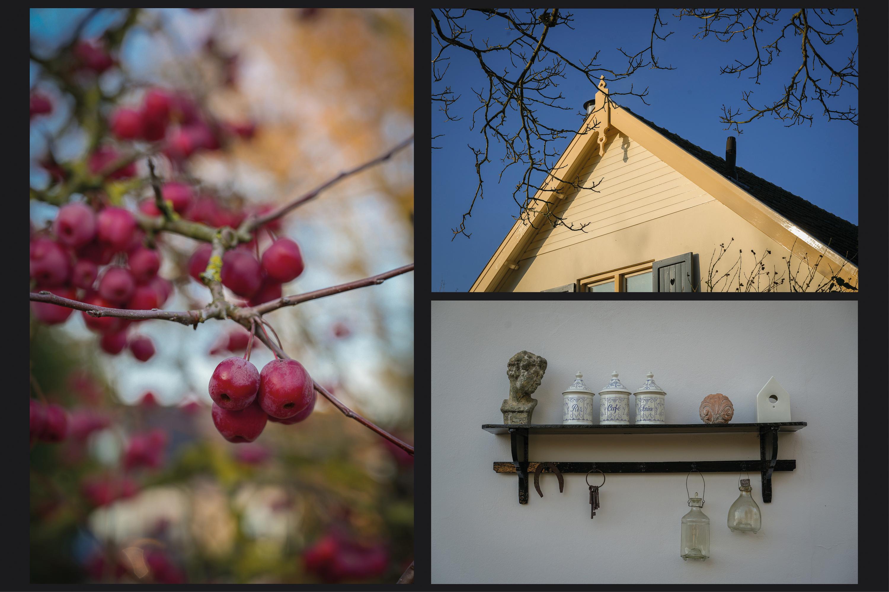 أما خارج المنزل، فالمساحات مصممة بعناية لتوفير الخصوصية والحفاظ على البيئة: حدائق زهور، وأشجار صفصاف ناضجة، وبستان يحتوي على تفاح وكمثرى وبرقوق وسفرجل، وبركة طبيعية تحيط بها الأشجار، تمنح المكان طابع المنتزه وتستقطب الحياة البرية. وتضيف البناية المعزولة، بموقد الحطب وأبواب فرنسية، آفاقًا إضافية متعددة، سواءً كمرسم أو مكان للضيوف أو مكتب هادئ.