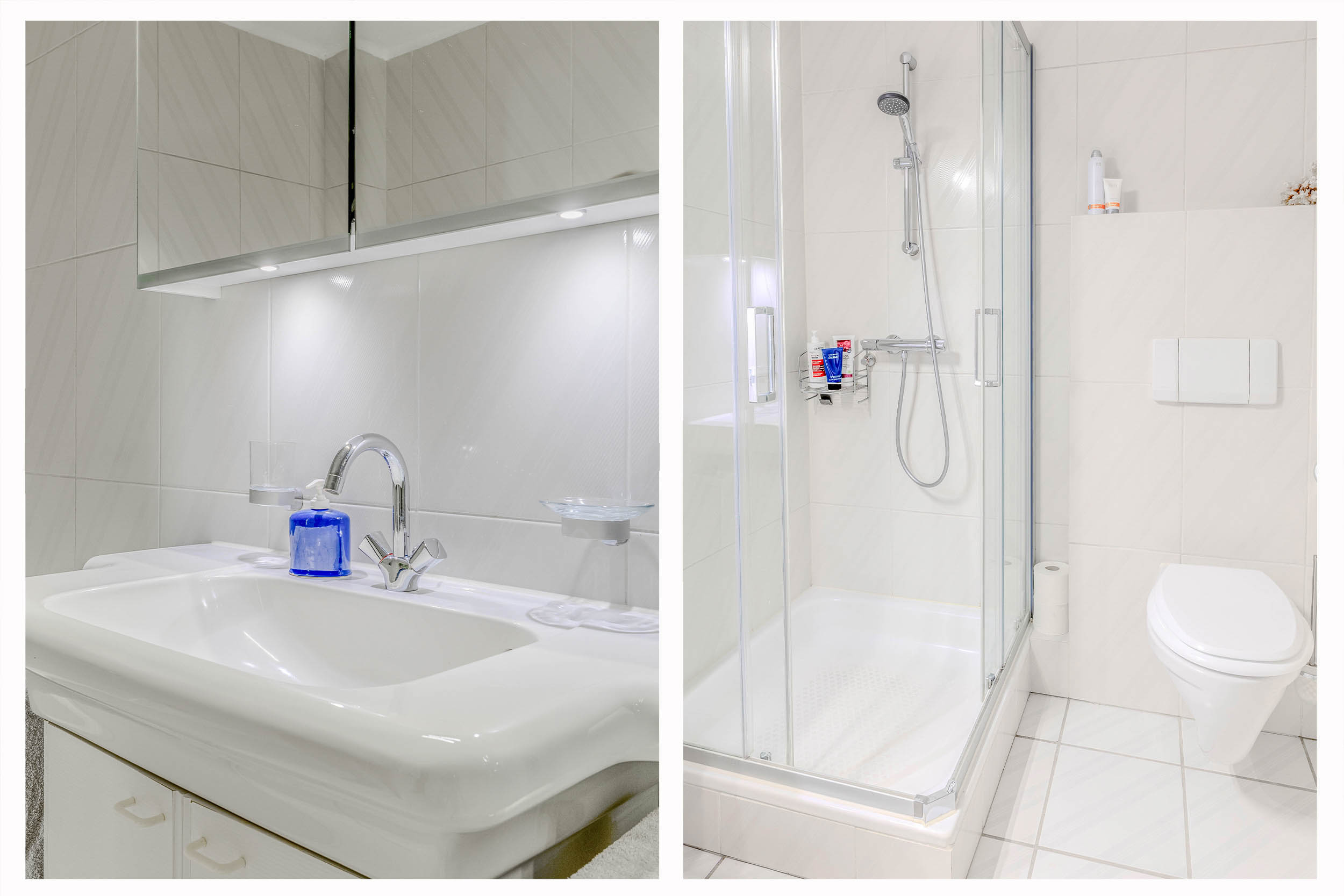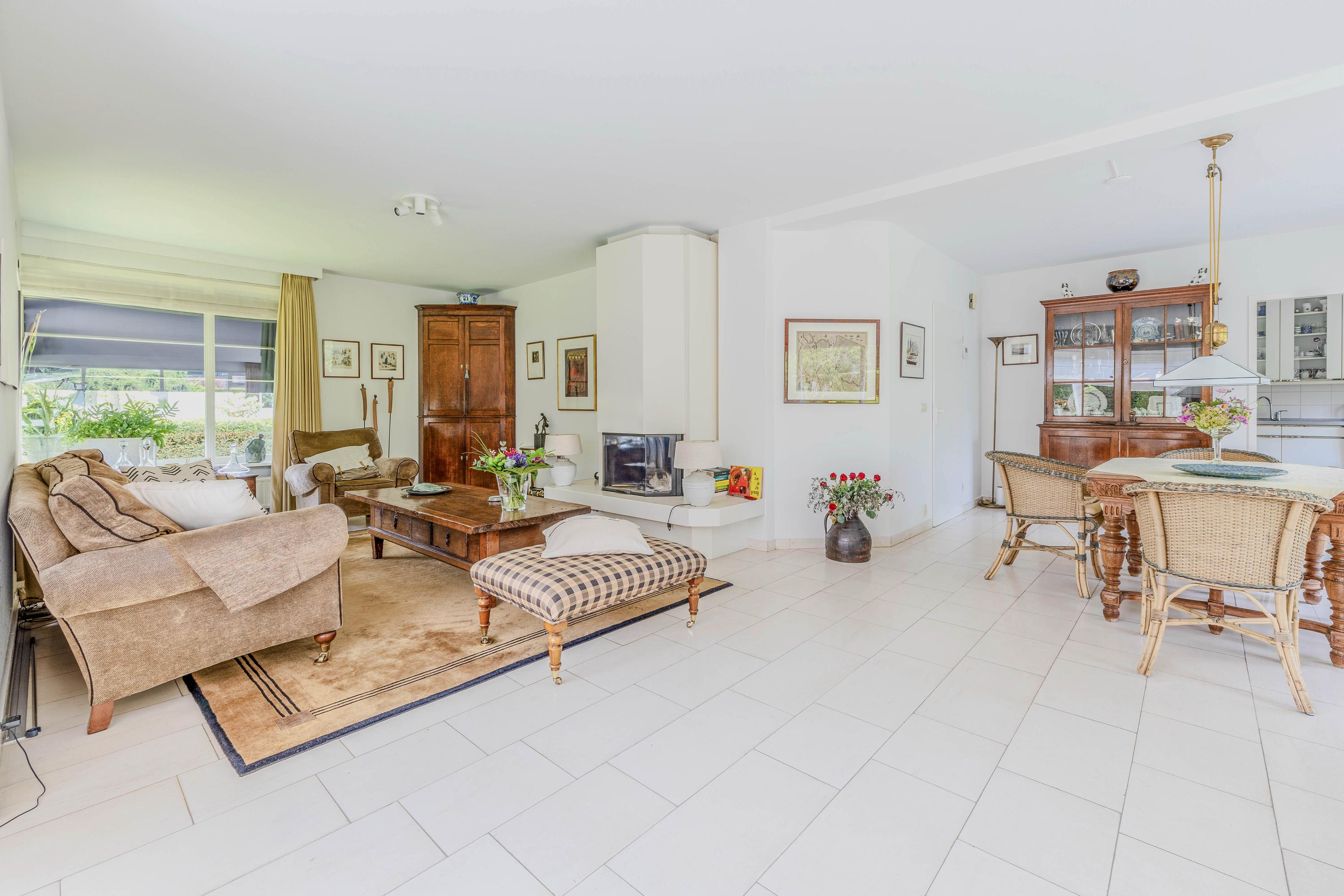 تُضيء نافذة الزاوية الرئيسية مساحة المعيشة البالغة 62 م²، وتحتوي على مدفأة ونافذة سقفية وأبواب منزلقة تفتح مباشرة إلى حديقة خاصة منسقة داخل قطعة أرض بمساحة 754 م². توفر المطبخ المجاور وغرفة الخدمات رفاهية عملية، بينما تخفف المظلات الشمسية الآلية من حدة الضوء. تقريبًا جميع الطابق الأرضي مزود بتدفئة وتبريد أرضي. الجناح الرئيسي في هذا المستوى، بمساحة 16 م²، يستفيد من حمام خاص لضمان الخصوصية وسهولة الوصول.