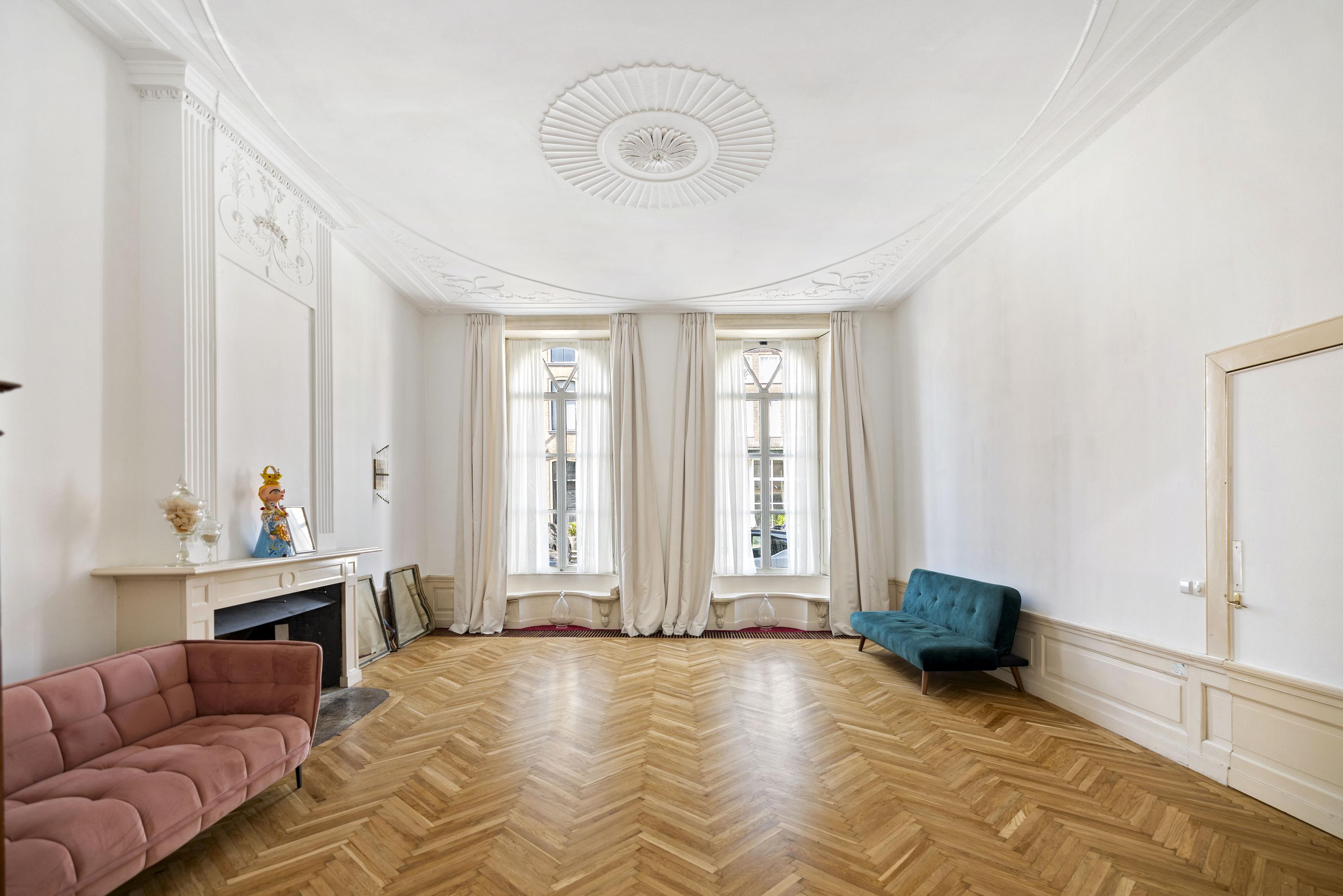 بعد المرور عبر المدخلين الكلاسيكيين، يستقبلك دهليز بأرضية من الرخام وإضاءة طبيعية وافرة. وتتوسط الطابق الرئيسي غرفة معيشة ومطبخ بمساحة تقارب 100 م². غرفة المعيشة التي تبلغ مساحتها 43 م² تتميز بمقاعد النوافذ الأصلية ومدفأة تاريخية، بينما تضفي أرضية الباركيه شيفرون من خشب البلوط دفئاً وإيقاعاً أنيقاً. المطبخ مجهز بخزائن بيضاء بلا مقابض وأجهزة عالية المواصفات تشمل موقد حثي مع شفاط متكامل وثلاجة وفريزر كبيرين.