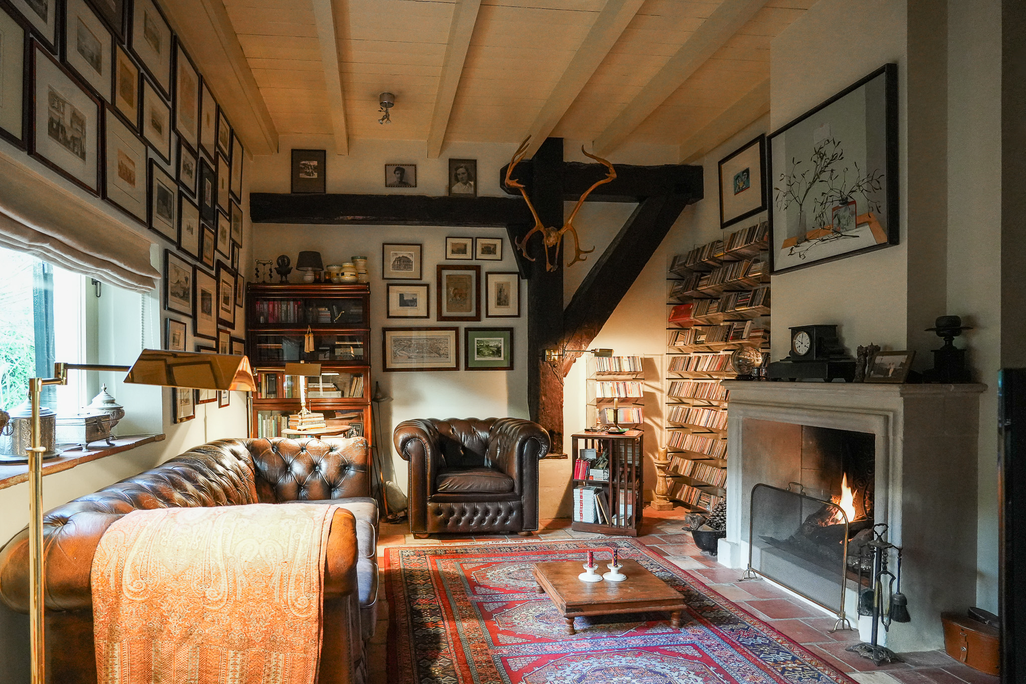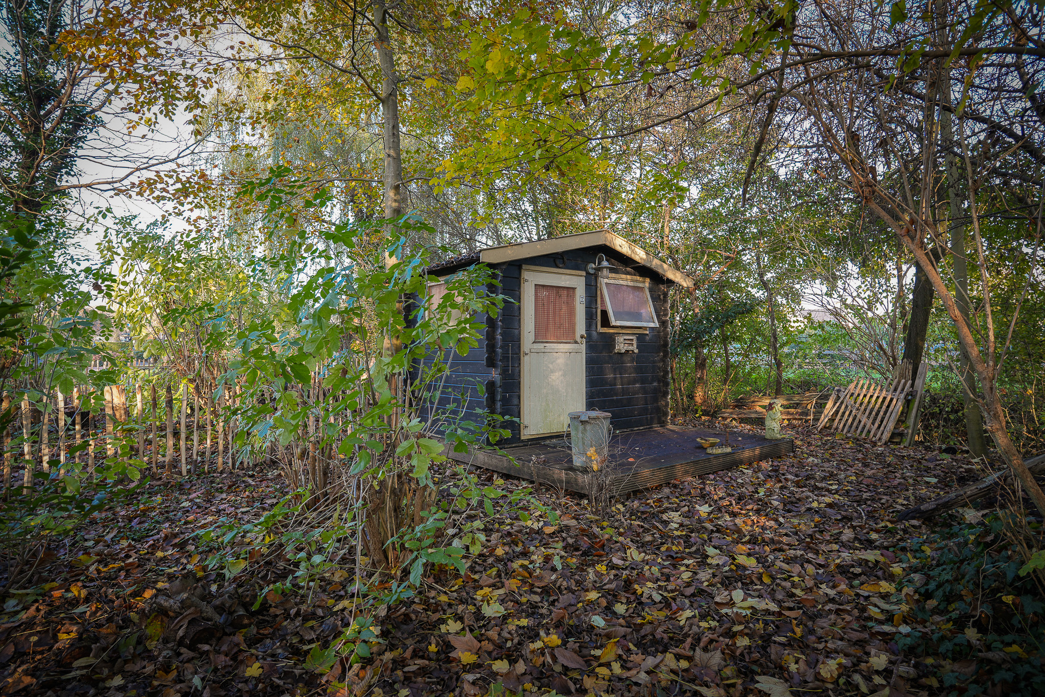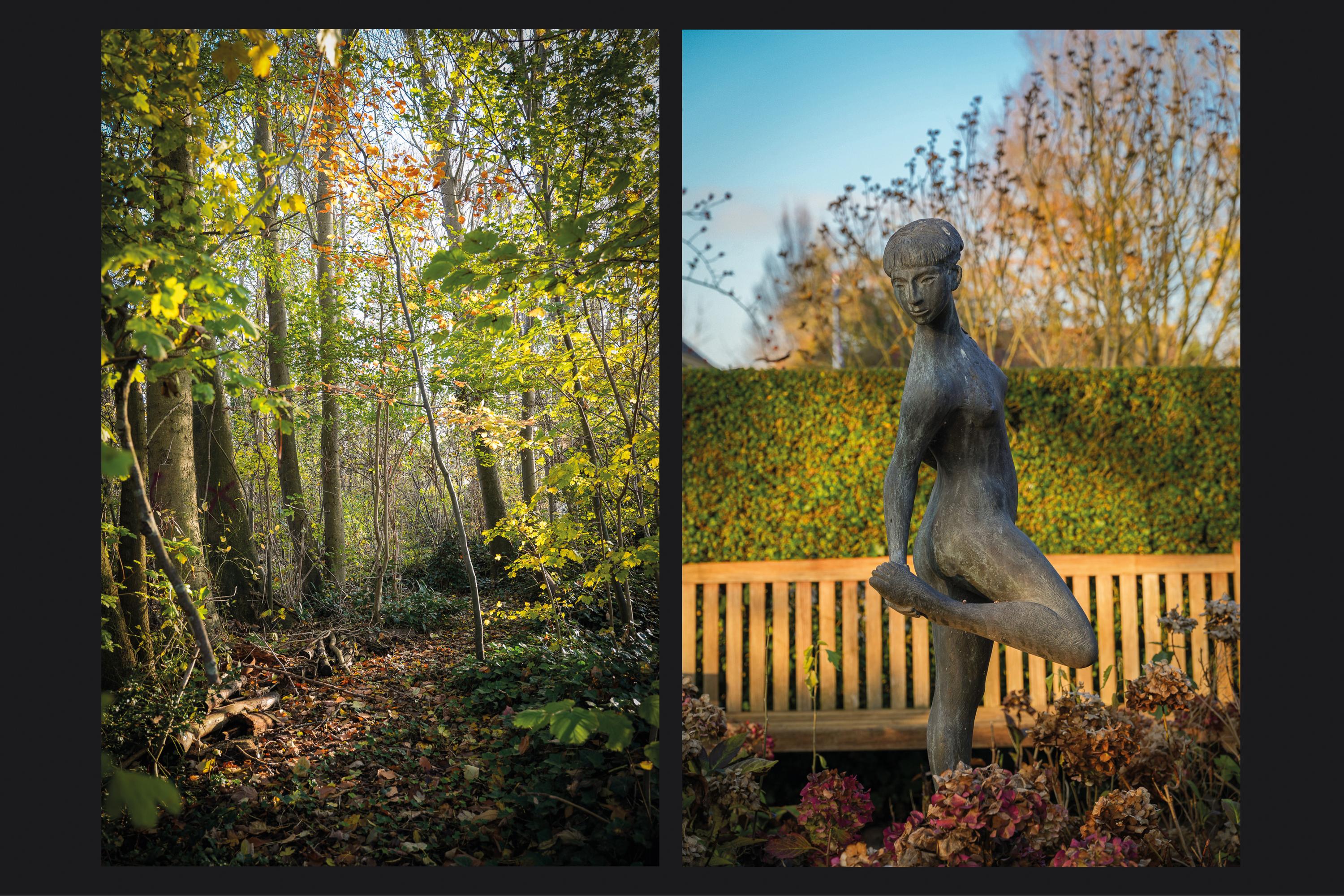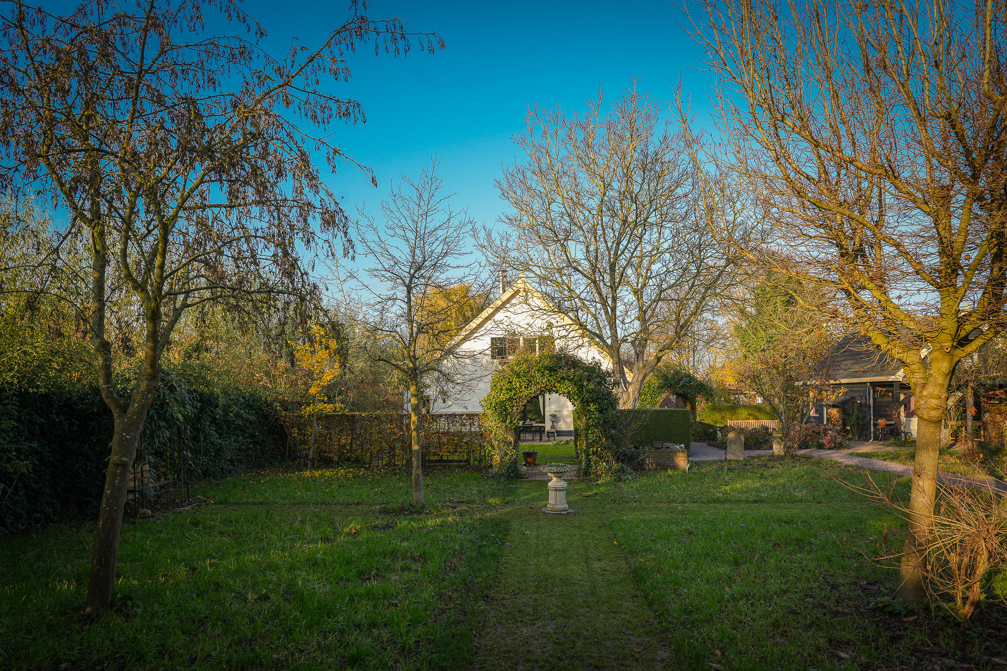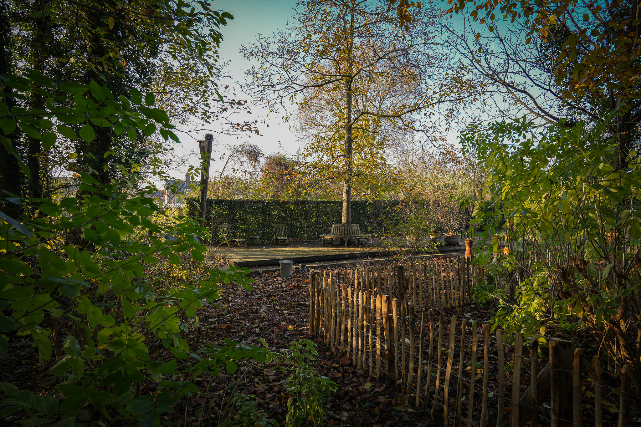 Auch das Grundstück selbst ist auf Diskretion und Ökologie ausgelegt: Blumenbeete, alte Weiden, ein Obstgarten mit Äpfeln, Birnen, Pflaumen und Quitten sowie ein Teich im Gehölz schaffen ein parkähnliches Rückzugsgebiet, das von heimischer Tierwelt besucht wird. Das isolierte Nebengebäude mit Holzofen und französischen Türen erweitert den Nutzungsspielraum – als Atelier, Gästehaus oder ruhiges Büro.