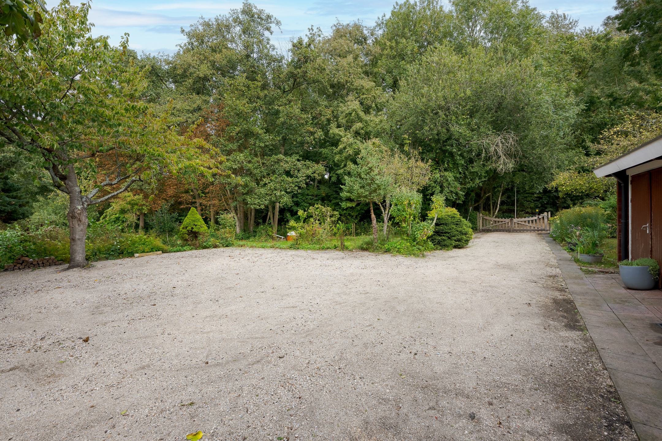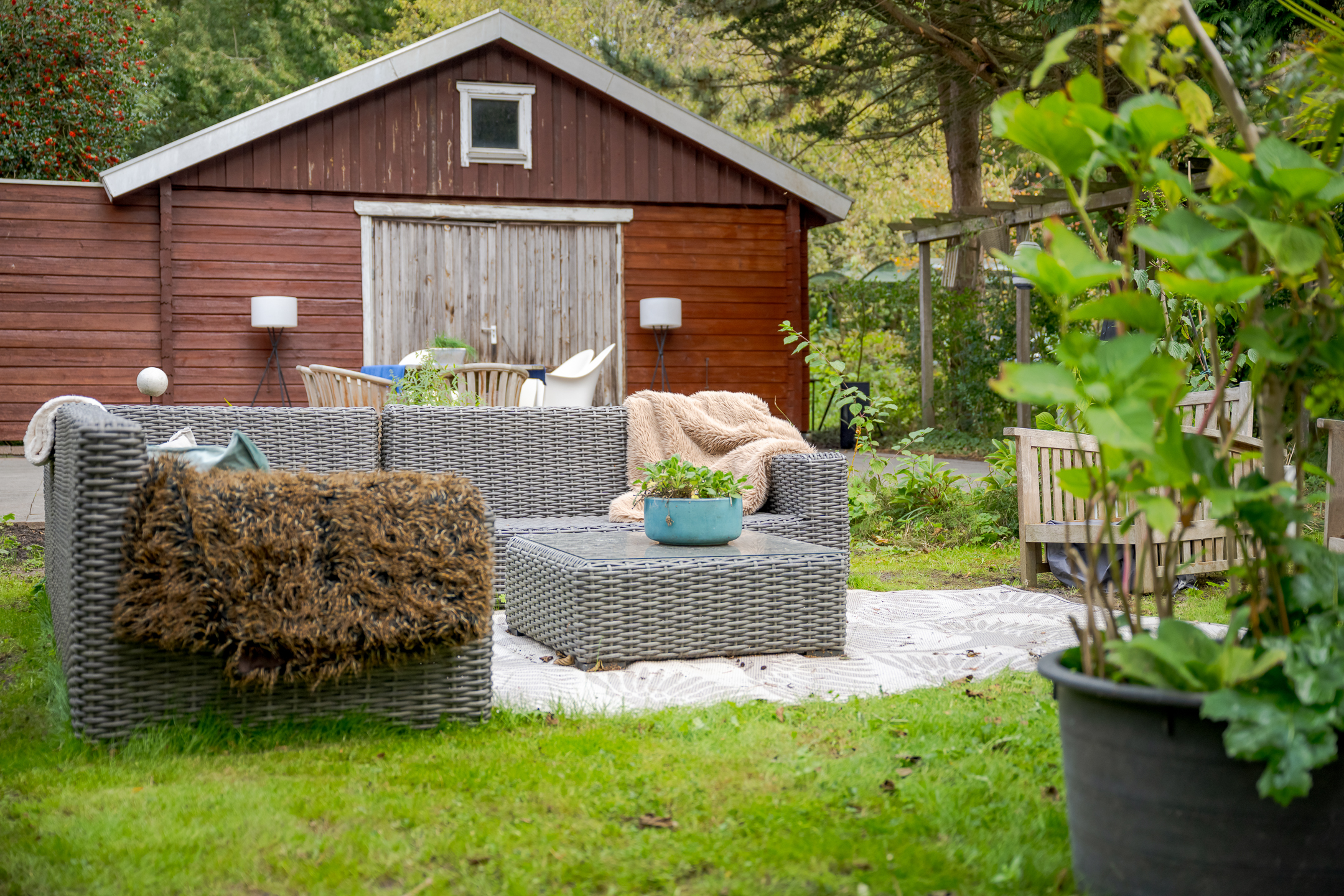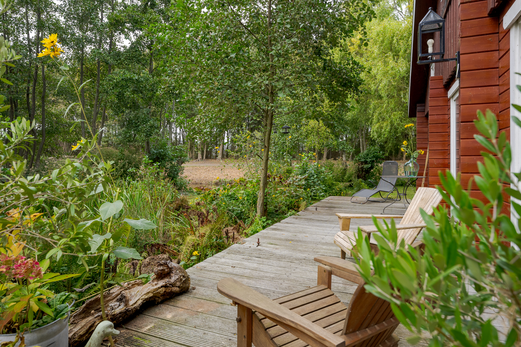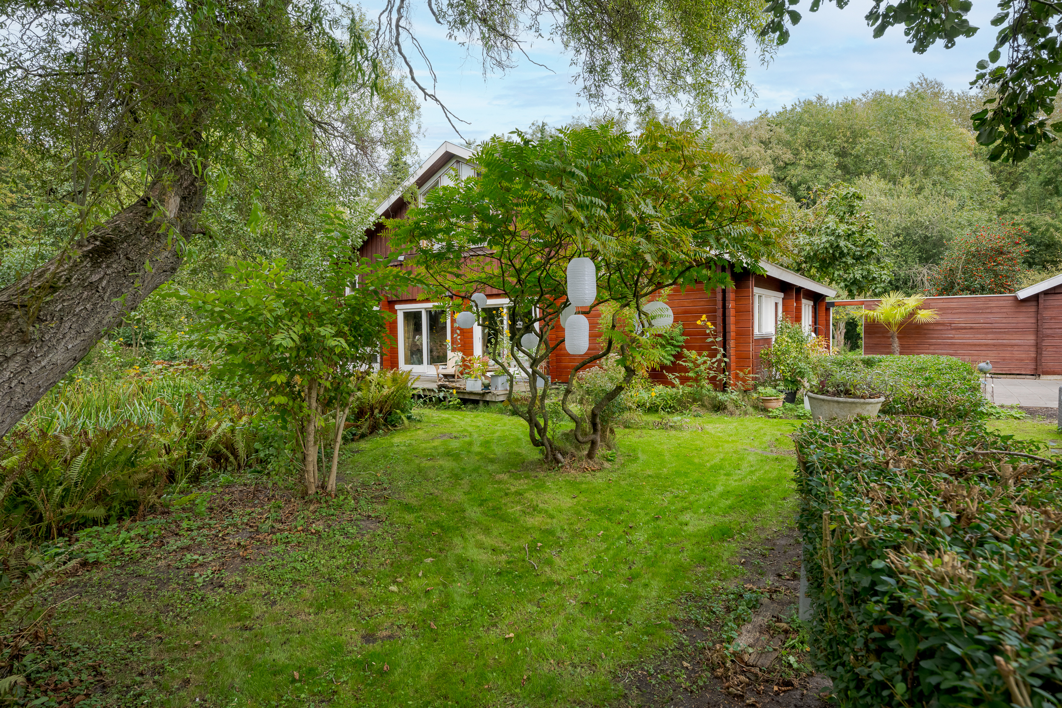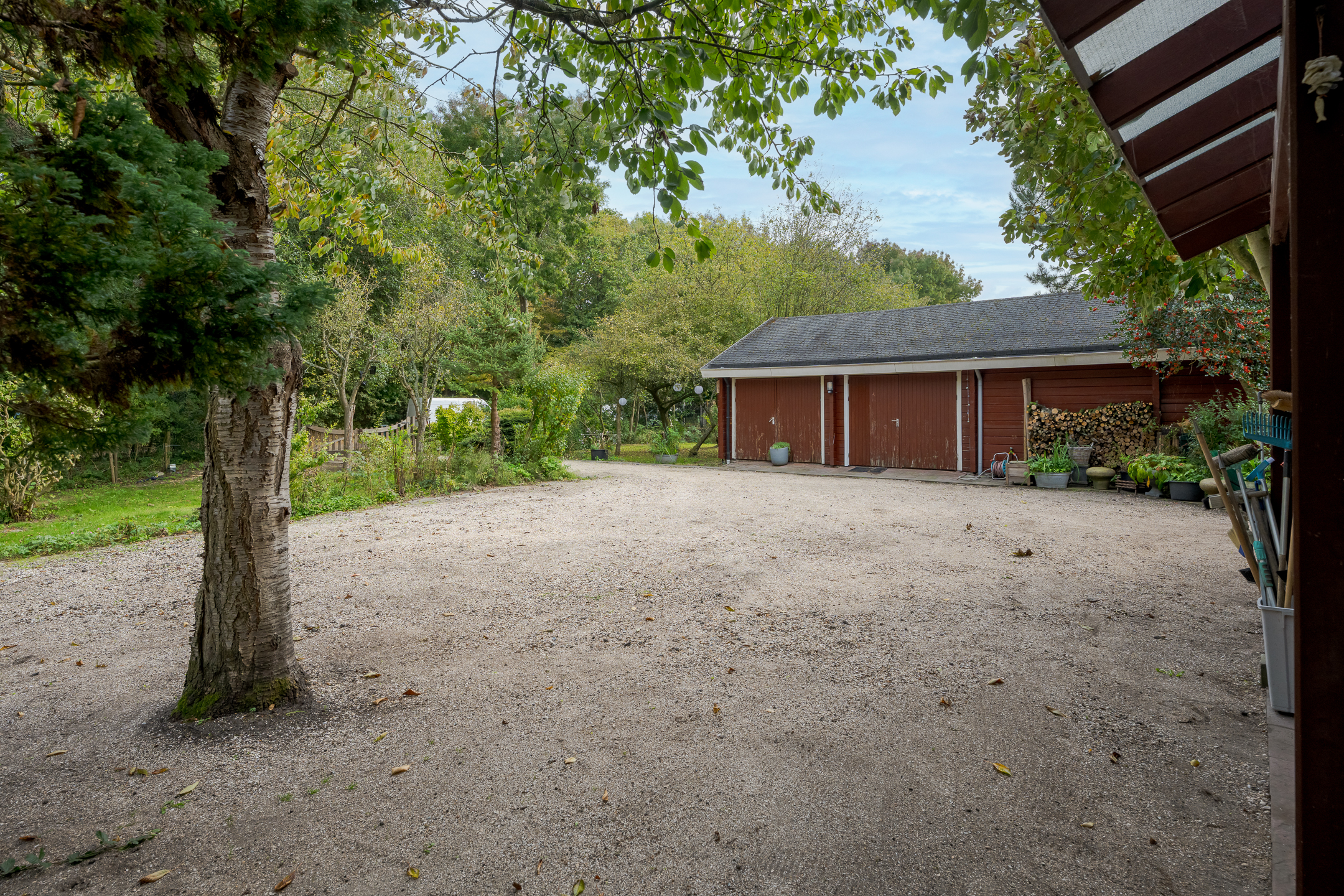 Eine breite Holzgarage mit etwa 6 mal 12 Metern bietet reichlich Platz für mehrere Fahrzeuge. Beim Betreten des Grundstücks führt der Weg vorbei an einem Innenhof und weiter durch über fünfzig Meter private Gartenanlagen, die sich fließend bis ans Wasser erstrecken. Hier offenbart die Villa ihren privilegierten Bootsanleger, ideal für diskretes Anlegen und ruhiges Schwimmen – stets mit ungestörtem Blick auf eine Vogelinsel im See.