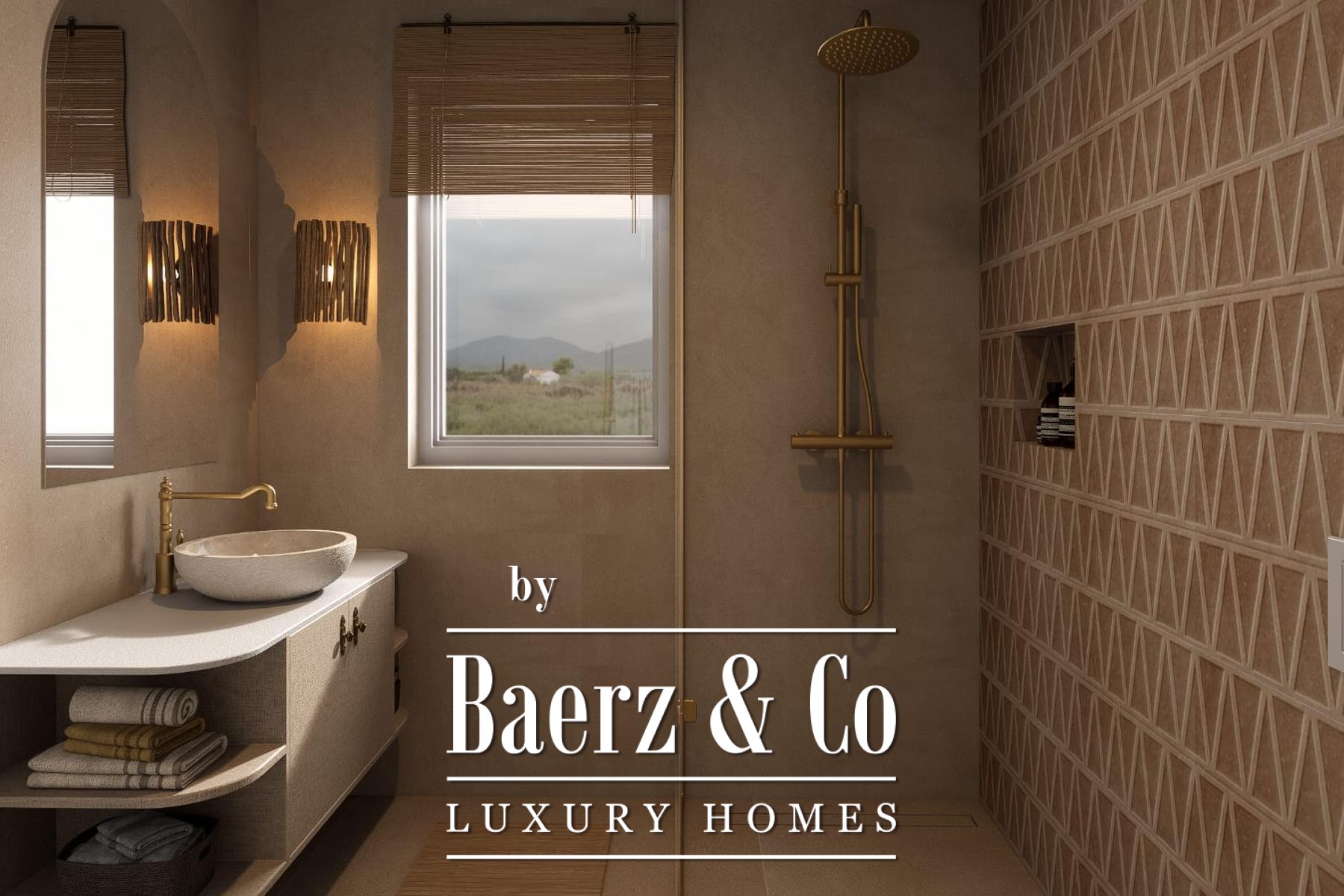 Im Obergeschoss erwarten Sie drei Schlafzimmer und zwei Badezimmer mit Zugang zu einer überdachten Terrasse, die Licht und Luft frei fließen lässt. Die Auswahl an Materialien – Stein, Holz und hochwertige Ausstattungen – unterstreicht den dezenten Luxus der Villa und sorgt für ein warmes Ambiente.