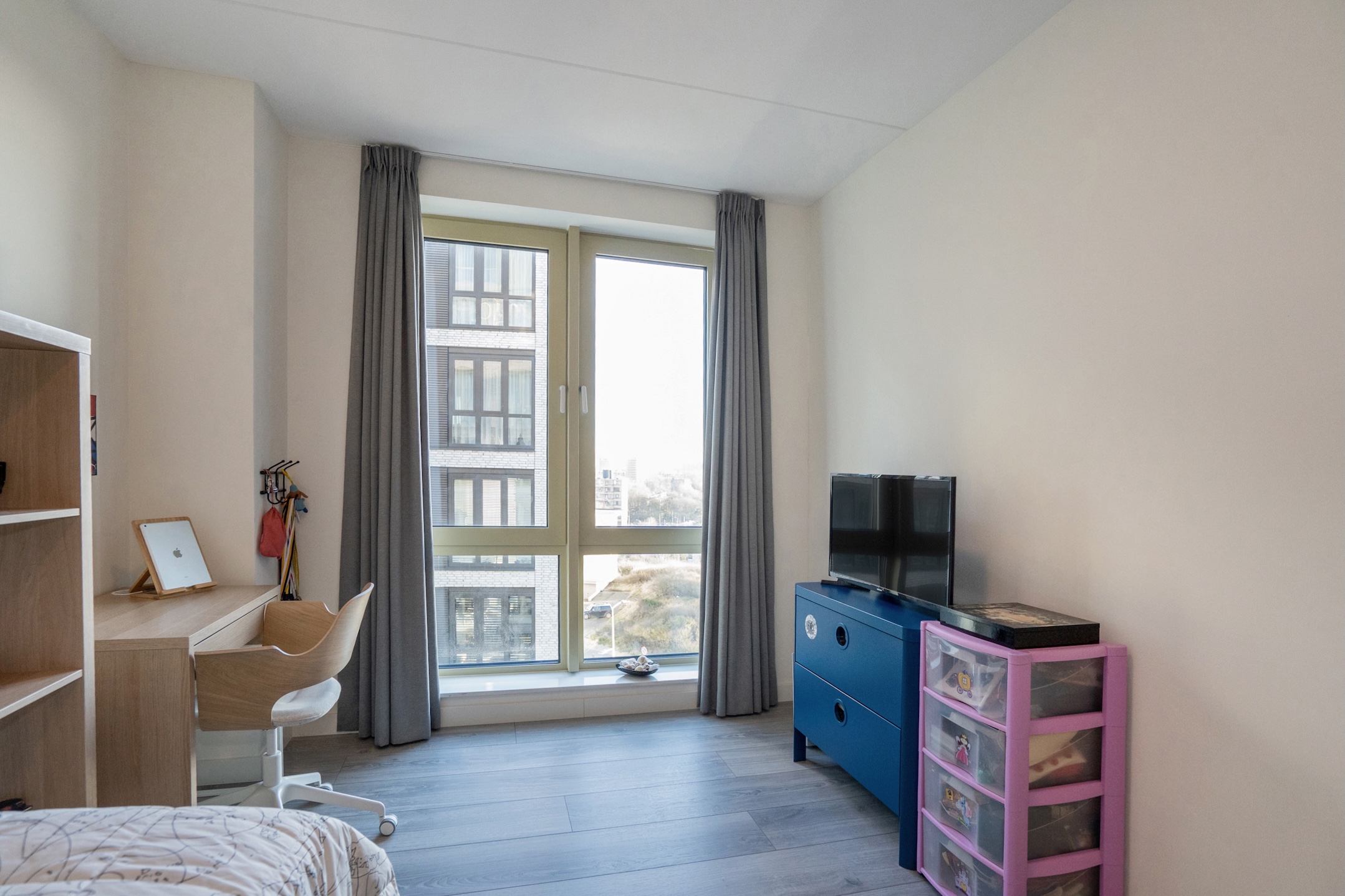 This property has 3 full-sized bedrooms. Immediately on the right side of the hallway, you will find the first 2 bright bedrooms. The described hallway leads to a spacious hall with double wardrobes arranged in a corner setup, access to a bathroom, and a generous master bedroom, which also has a large wardrobe wall and 2 large windows. Then there is the spacious bathroom, featuring a dark gray tiled floor, towel radiator, wide vanity unit with double sinks and faucets, a bathtub, a deep walk-in shower, and the 3rd wall-mounted toilet.