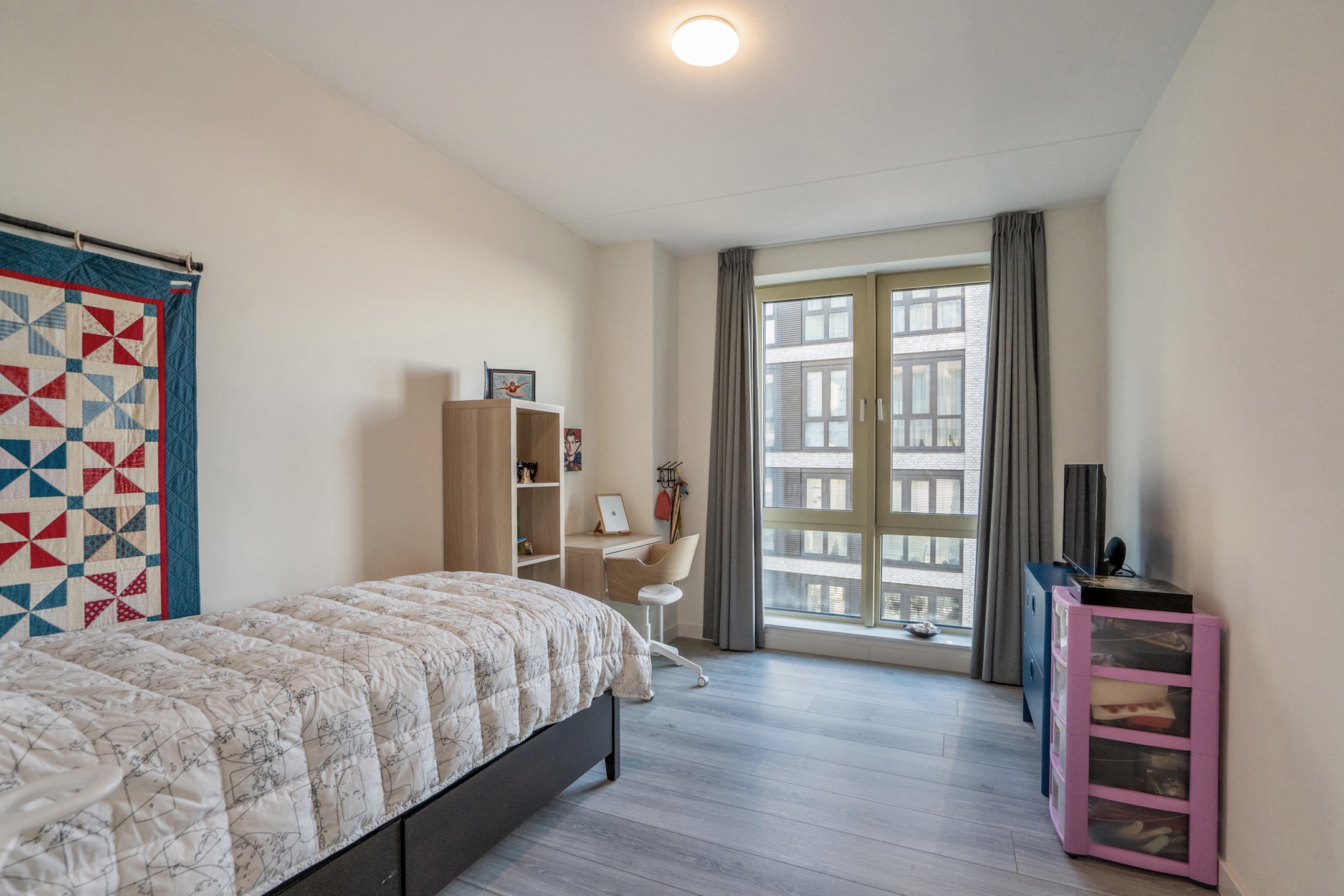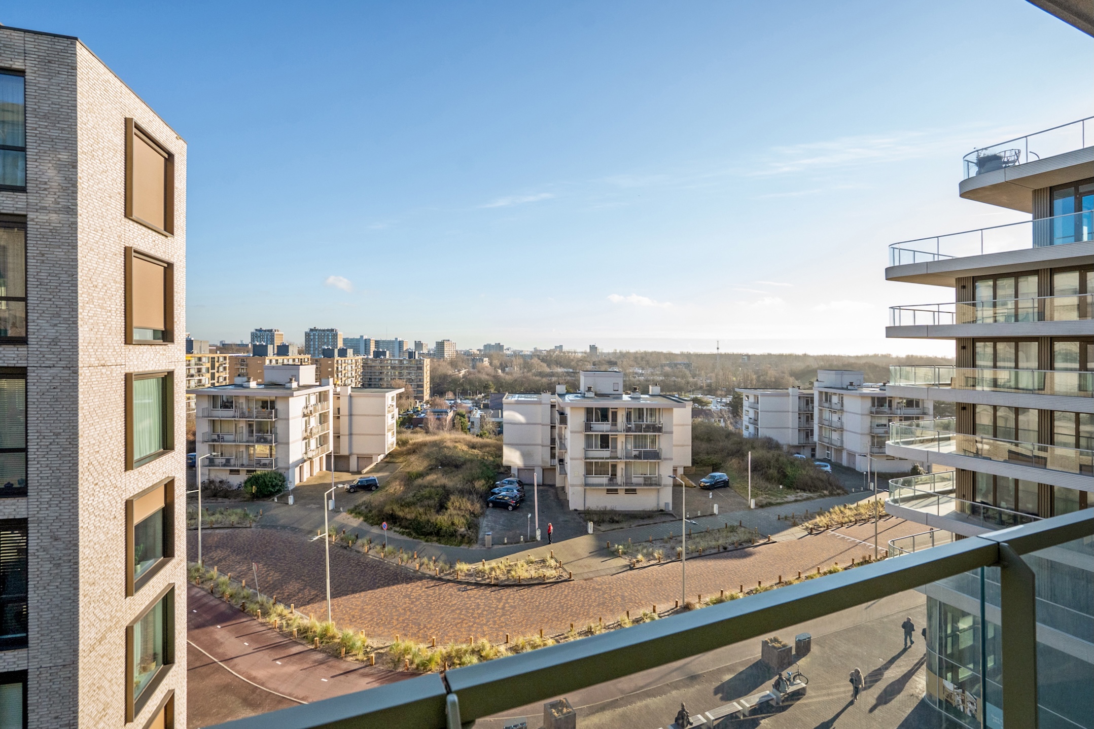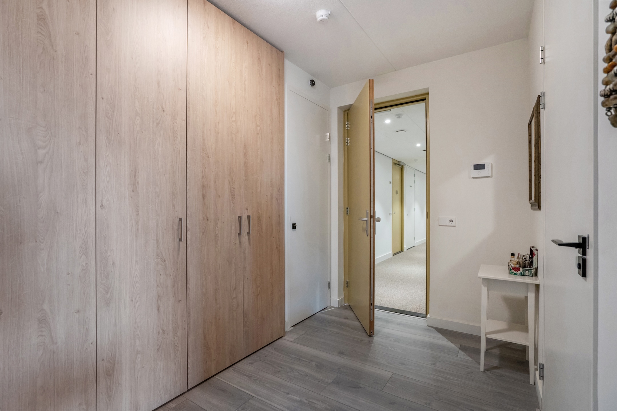 Behind the front door, you enter a spacious entrance hall with a wide closet wall for coats and shoes. There is also access to a separate deep toilet. Through a closed door, you enter the impressive living room with large floor-to-ceiling windows and the open kitchen, together creating a pleasant living space. A neat kitchen arranged along the width, equipped with all necessary built-in appliances such as a refrigerator, freezer, induction cooktop, combination microwave, and dishwasher. From the living room and kitchen, you always have a diagonal view of the sea.