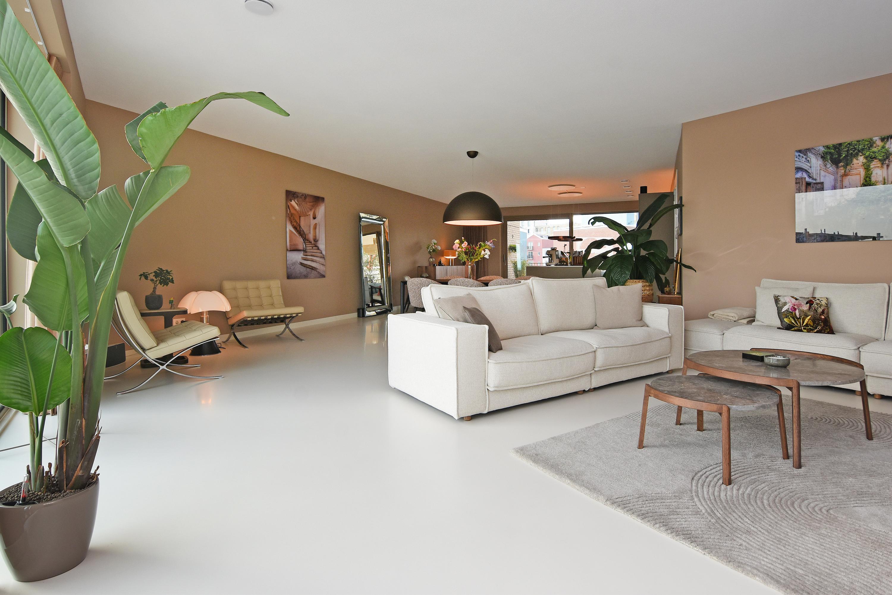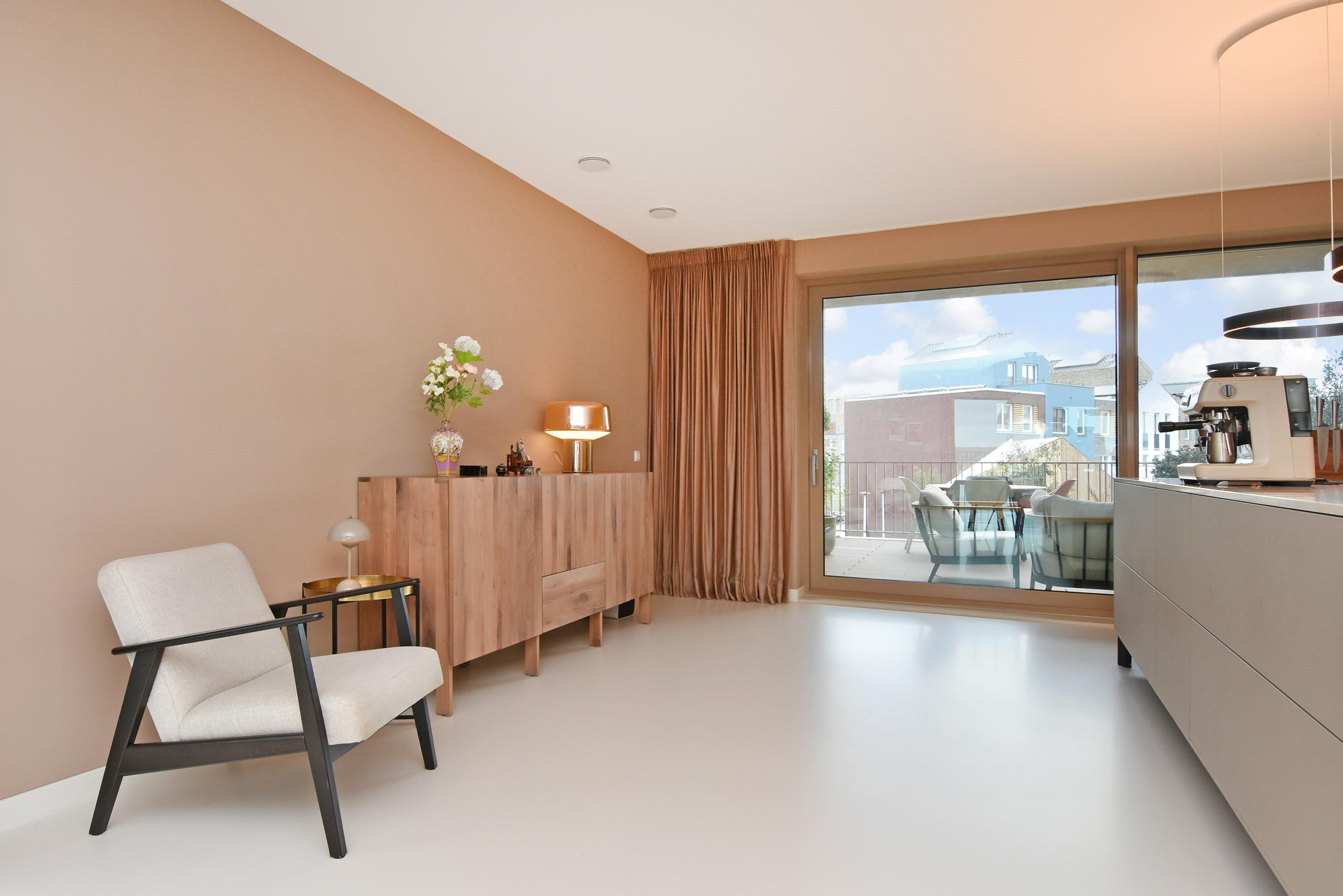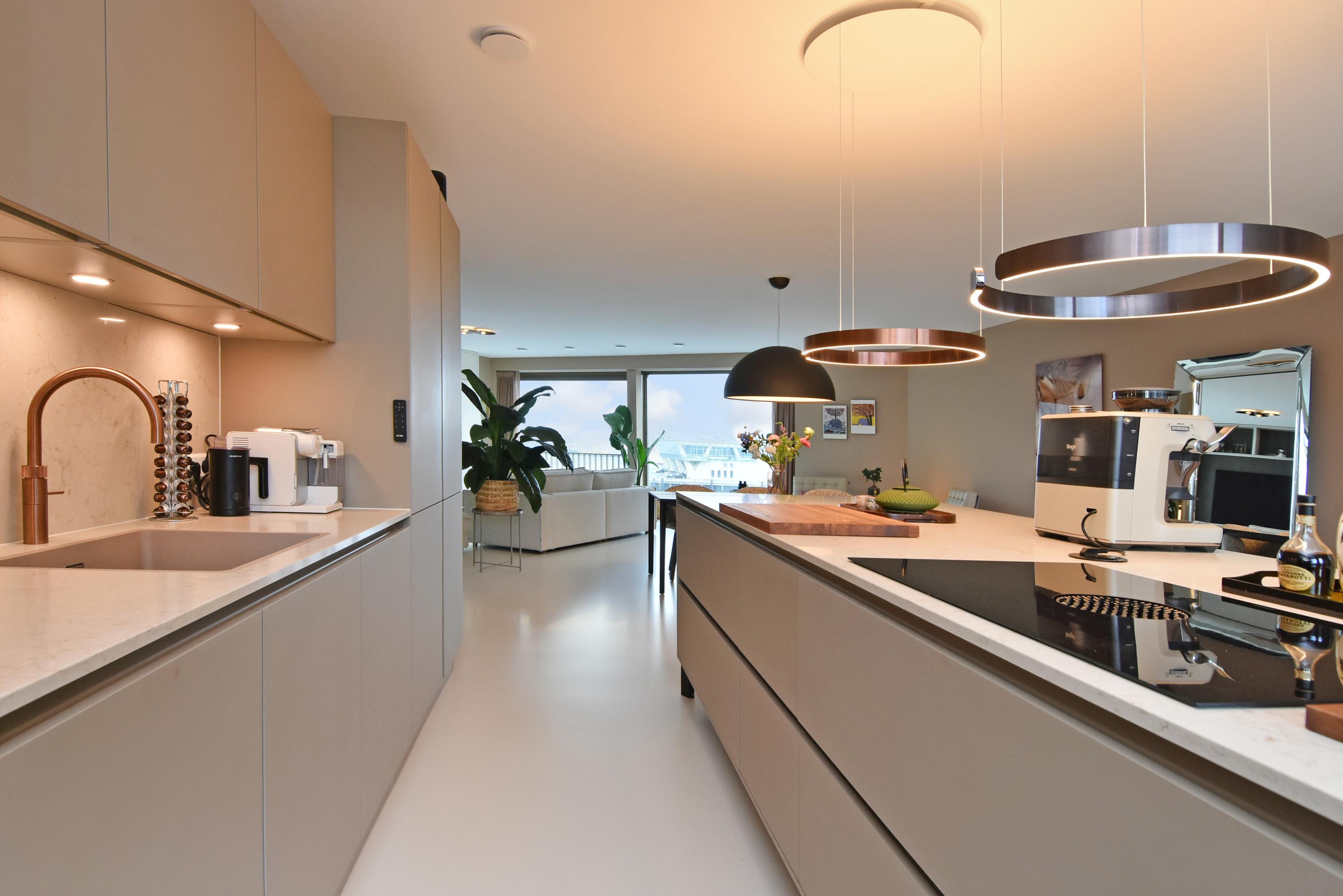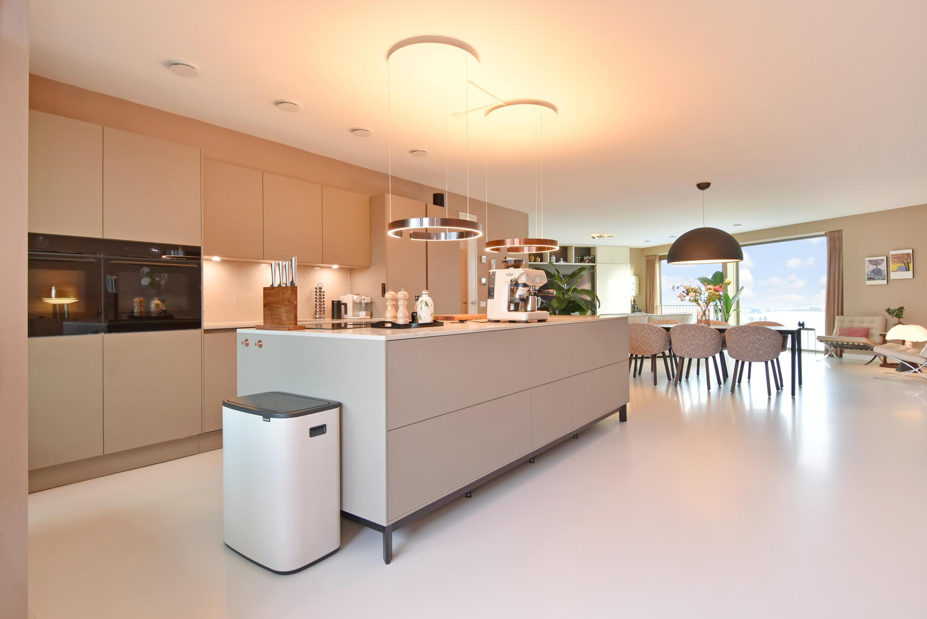 At the front is the seating area with a stylish custom-made wall unit featuring a closable workspace. At the rear you’ll find the designer kitchen with cooking island and every imaginable luxury built-in appliance, including an induction hob with integrated extractor, Quooker, dishwasher, combi-oven, spacious refrigerator, and separate freezer. From the kitchen, the large sliding doors open onto the generous balcony, where you can peacefully enjoy the afternoon and evening sun.