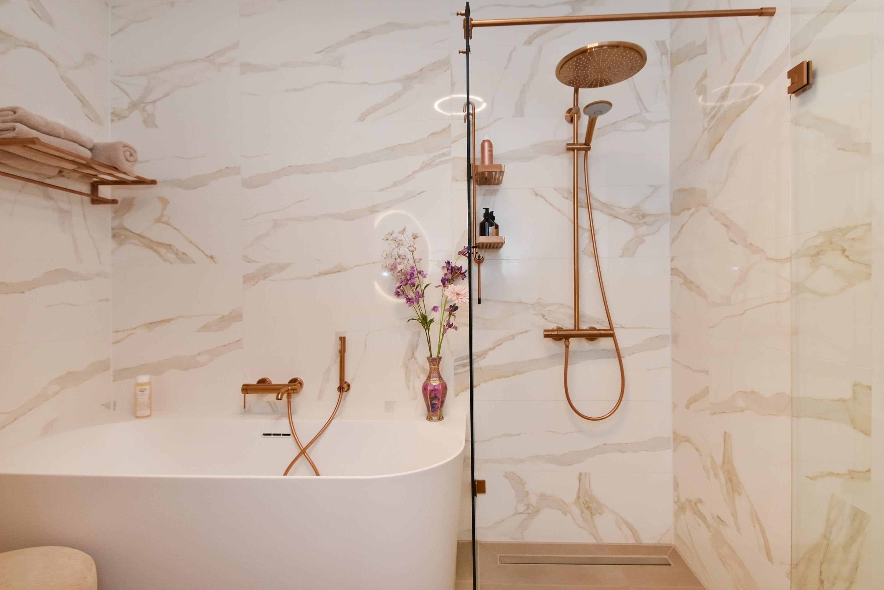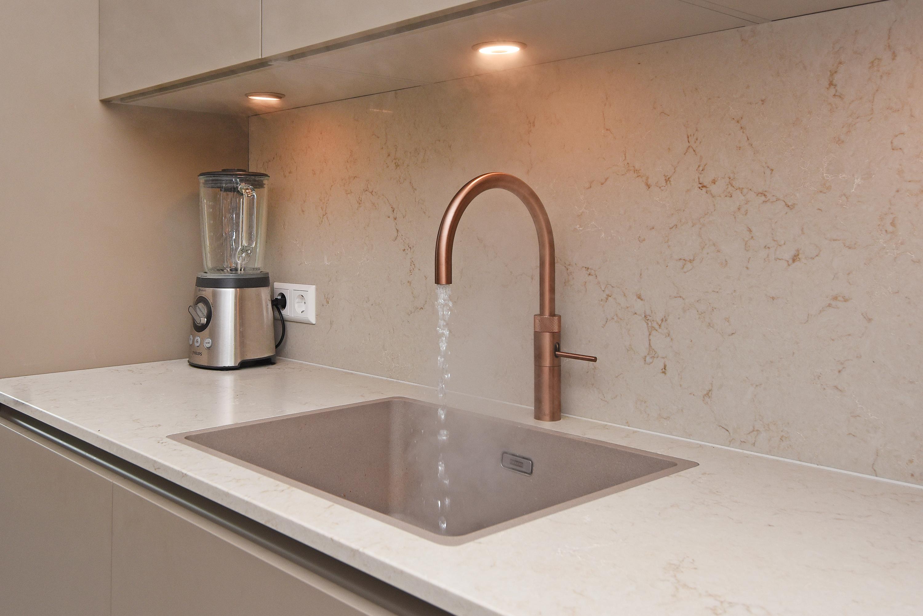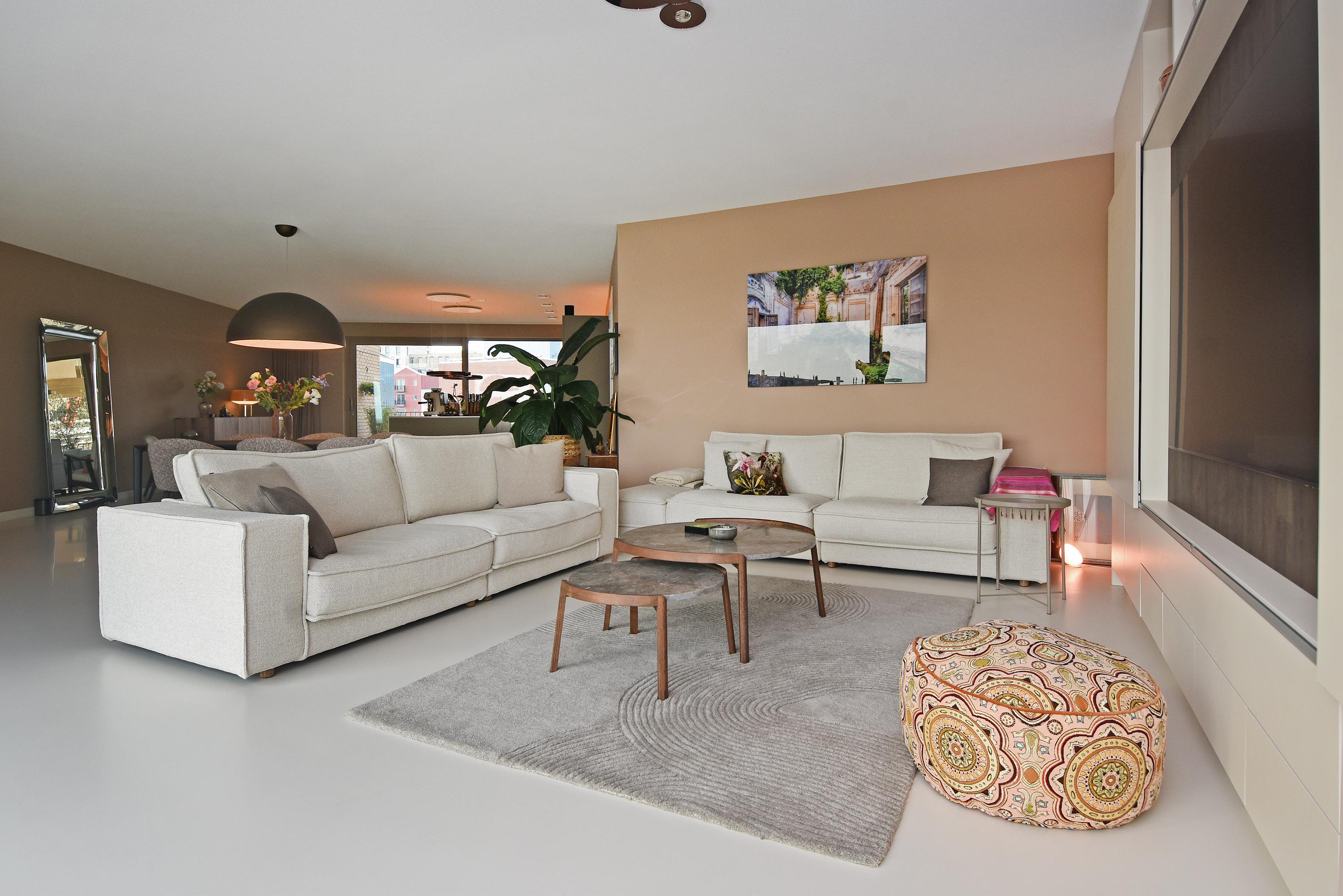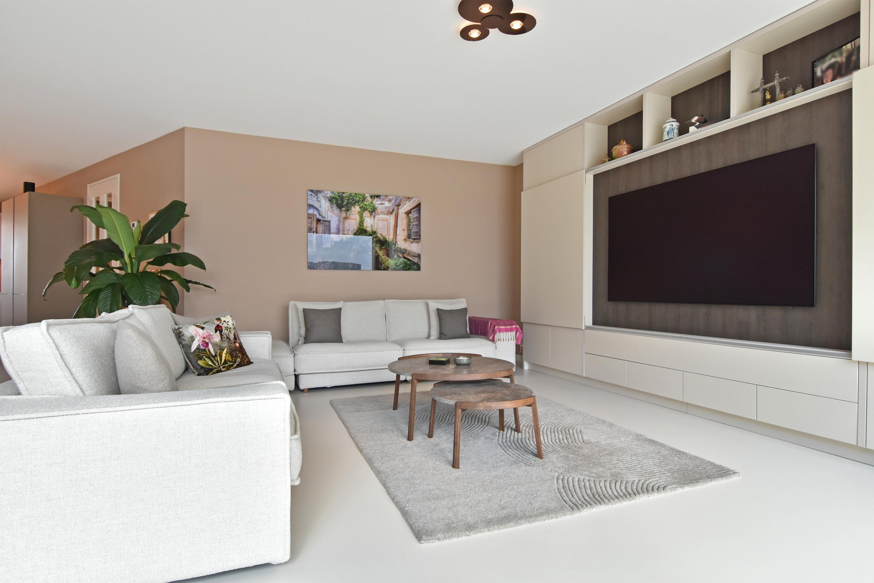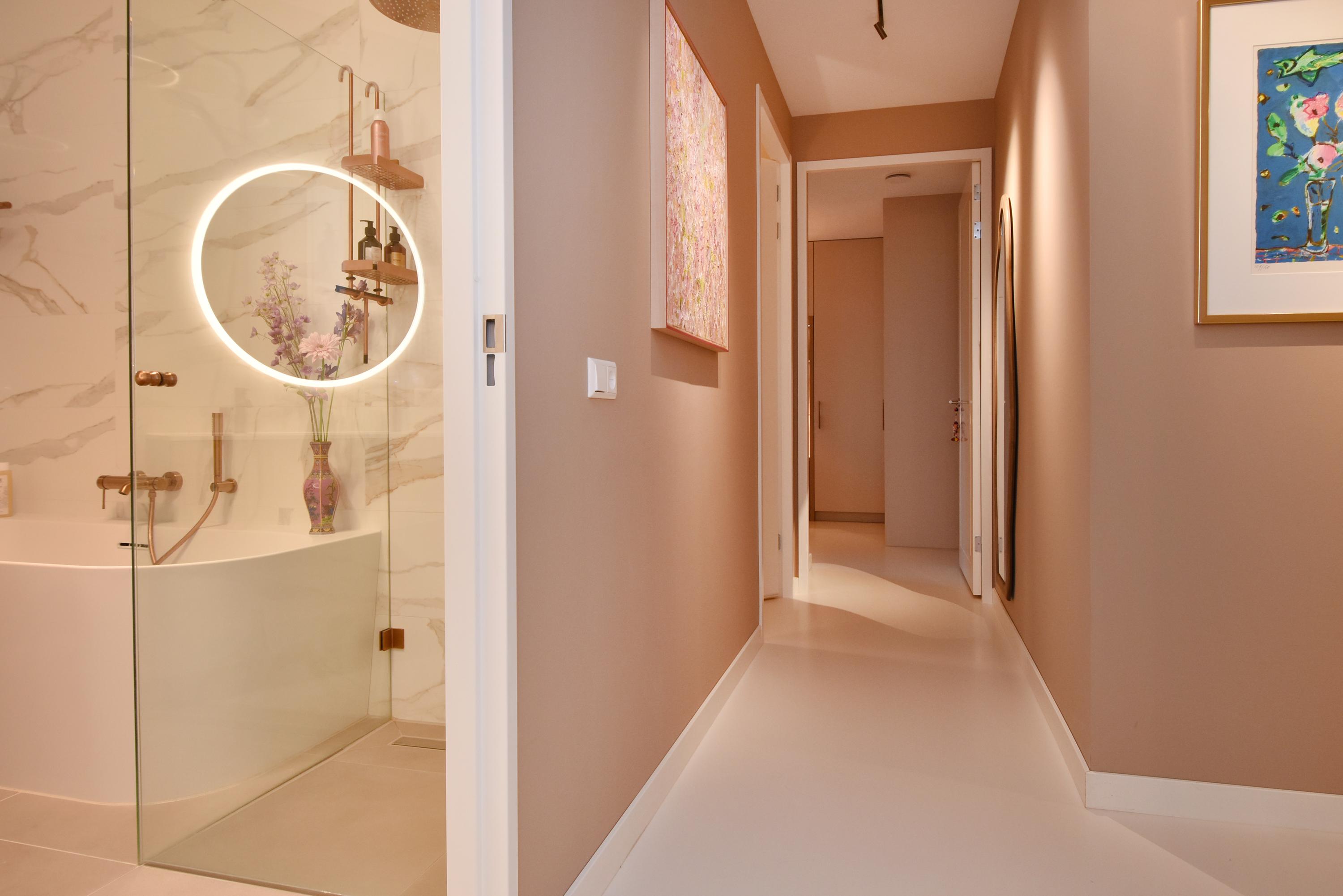 At the front is the seating area with a stylish custom-made wall unit featuring a closable workspace. At the rear you’ll find the designer kitchen with cooking island and every imaginable luxury built-in appliance, including an induction hob with integrated extractor, Quooker, dishwasher, combi-oven, spacious refrigerator, and separate freezer. From the kitchen, the large sliding doors open onto the generous balcony, where you can peacefully enjoy the afternoon and evening sun.