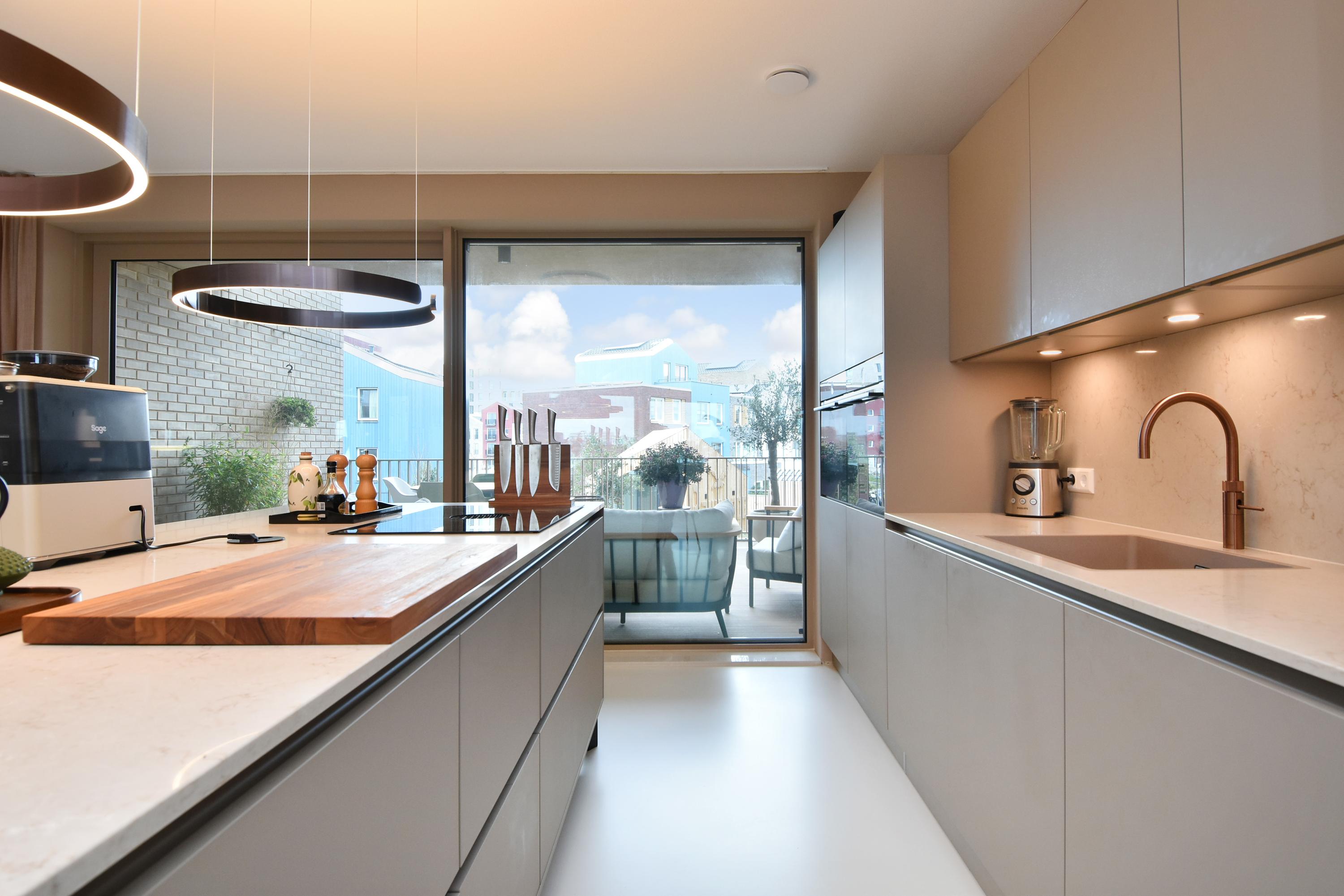 The spacious hallway leads you into an impressive open living area where living room and kitchen flow seamlessly together. The floor-to-ceiling windows offer panoramic views of the harbour and sea – a true eye-catcher that immediately sets the tone. The enormous sliding doors on the harbour side really bring the outdoors in, making a morning coffee in the sunshine a wonderfully peaceful moment of the day.