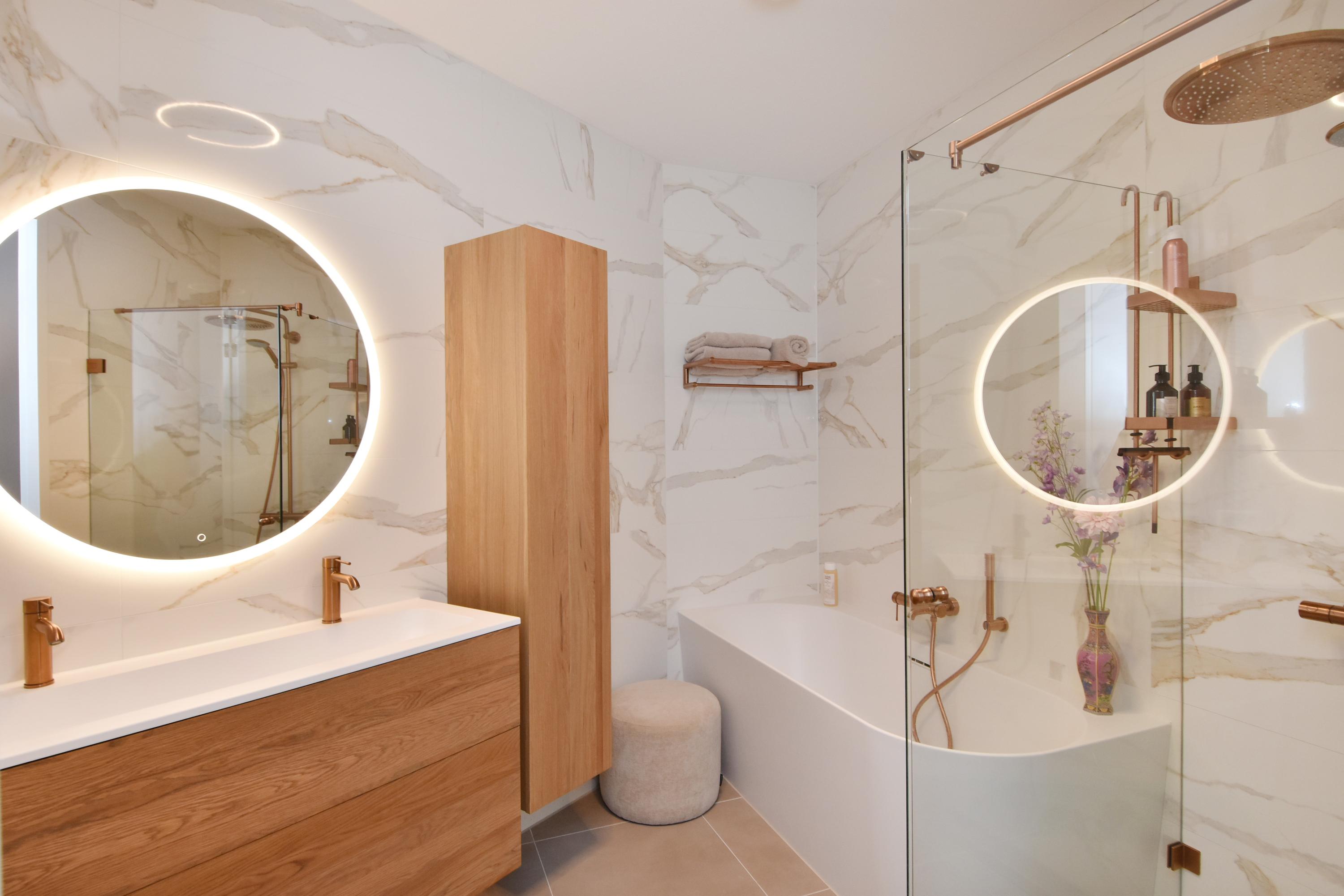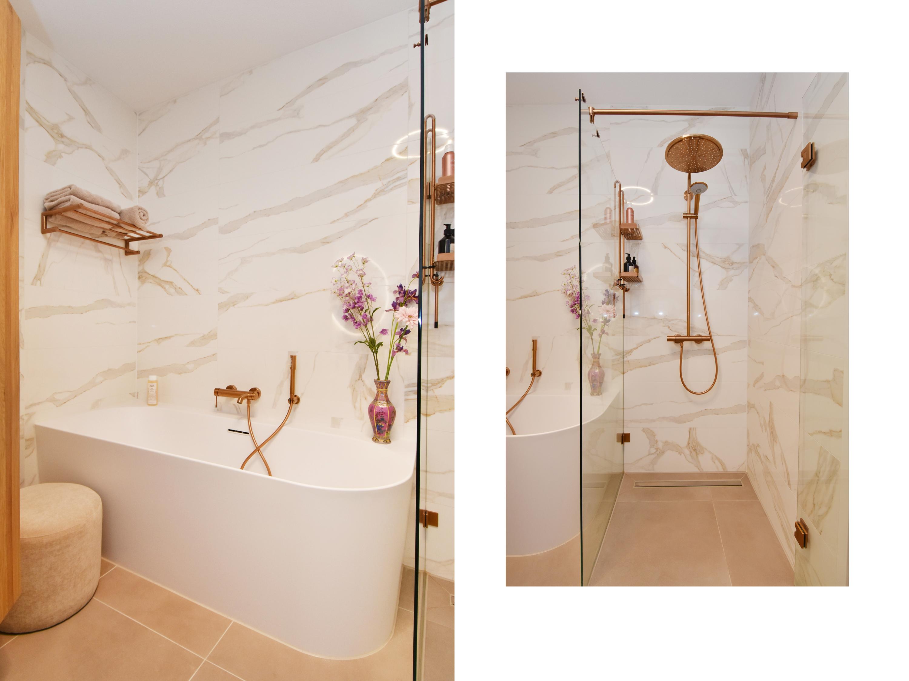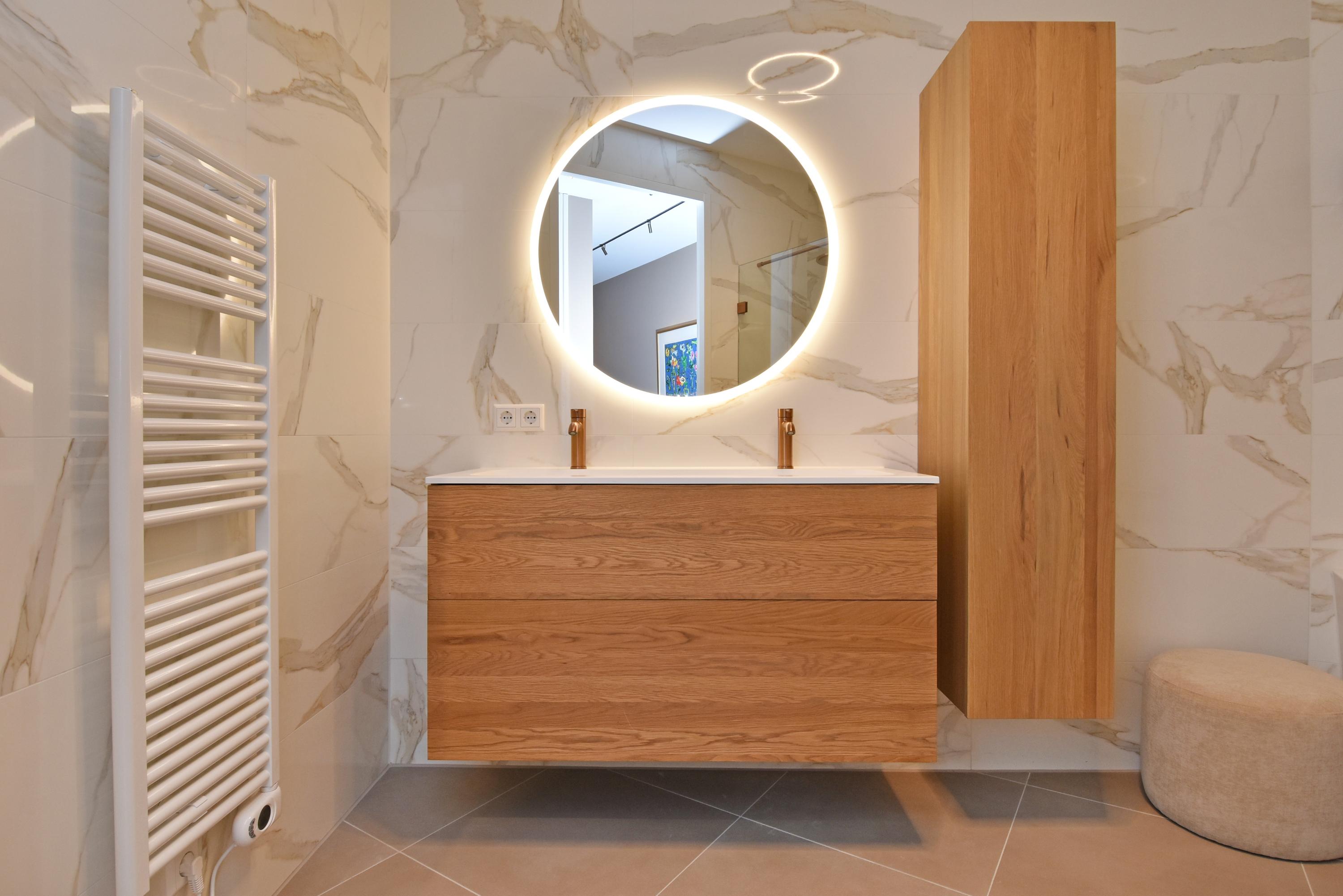 The contemporary bathroom is designed according to the latest trends and equipped with a walk-in shower, elegant washbasin unit, and bathtub. There is also a separate toilet and a practical storage room with custom-made cabinetry for the washing machine and dryer. This is also where the heat recovery unit (WTW) and heat pump are located.