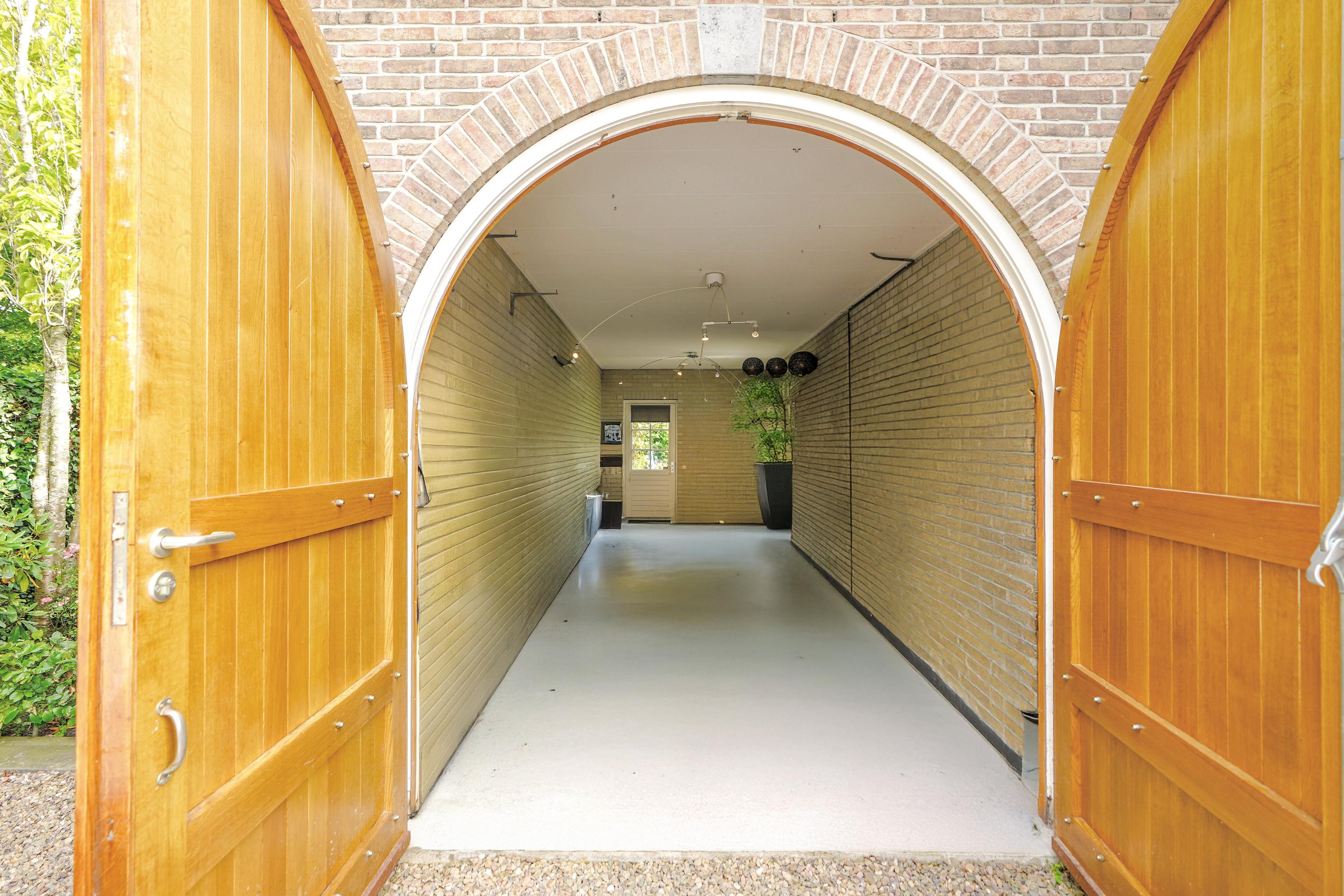 De garage heeft plaats voor twee auto’s achter elkaar. De ruimte is voorzien van twee radiatoren. Dankzij een deur vanuit de keuken heeft de garage ook een bijkeukenfunctie. Naast de inrijpoort is aan de buitenmuur een laadstation voor elektrische auto's aangebracht.