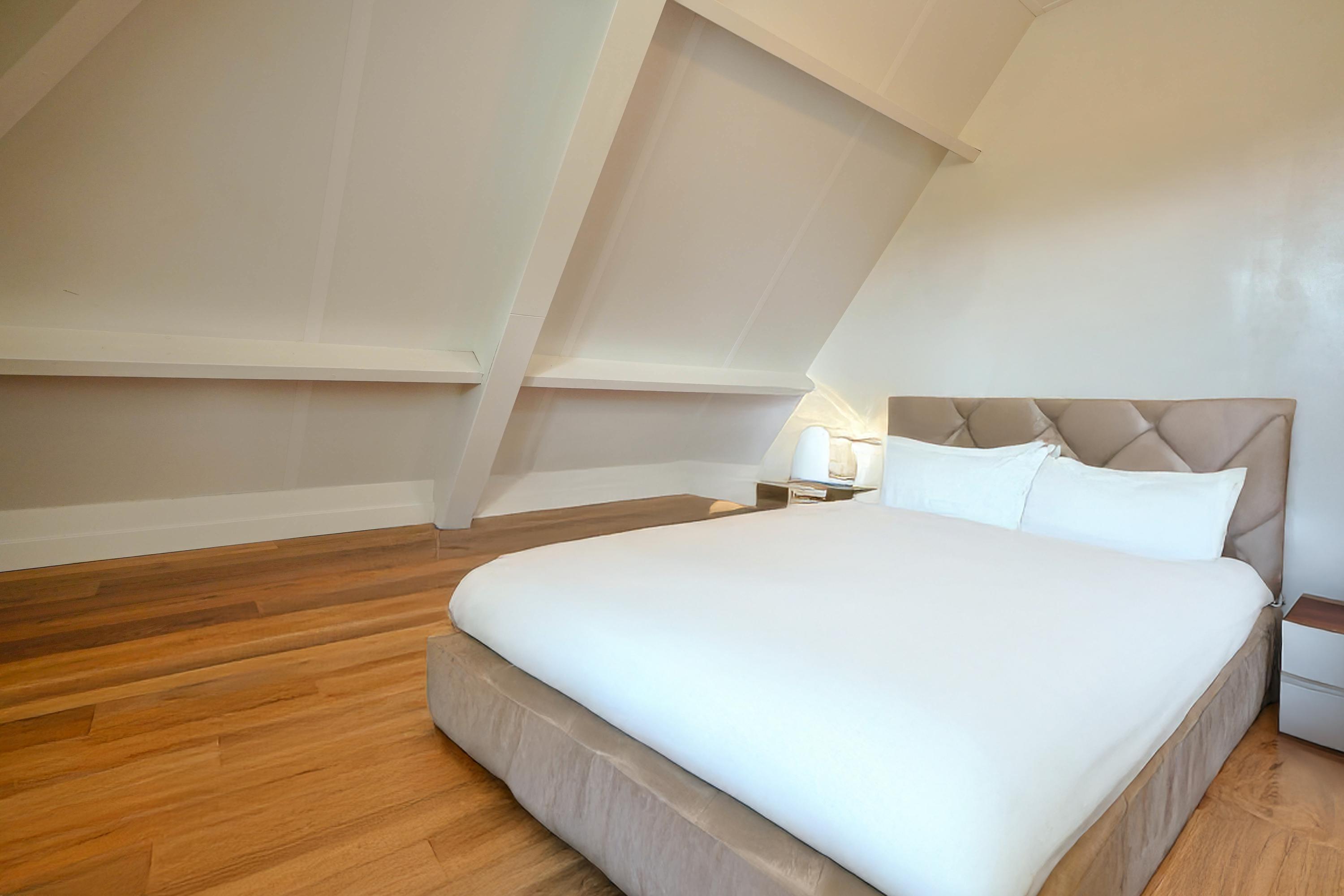 Een heerlijk rustige slaap/logeerkamer met dakkapel bevindt zich aan de straatkant.