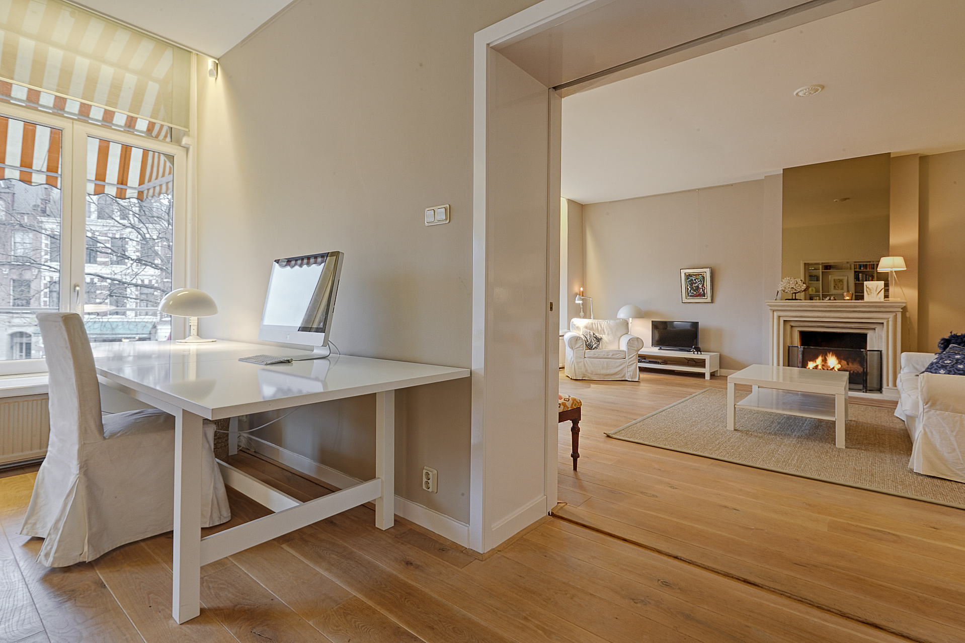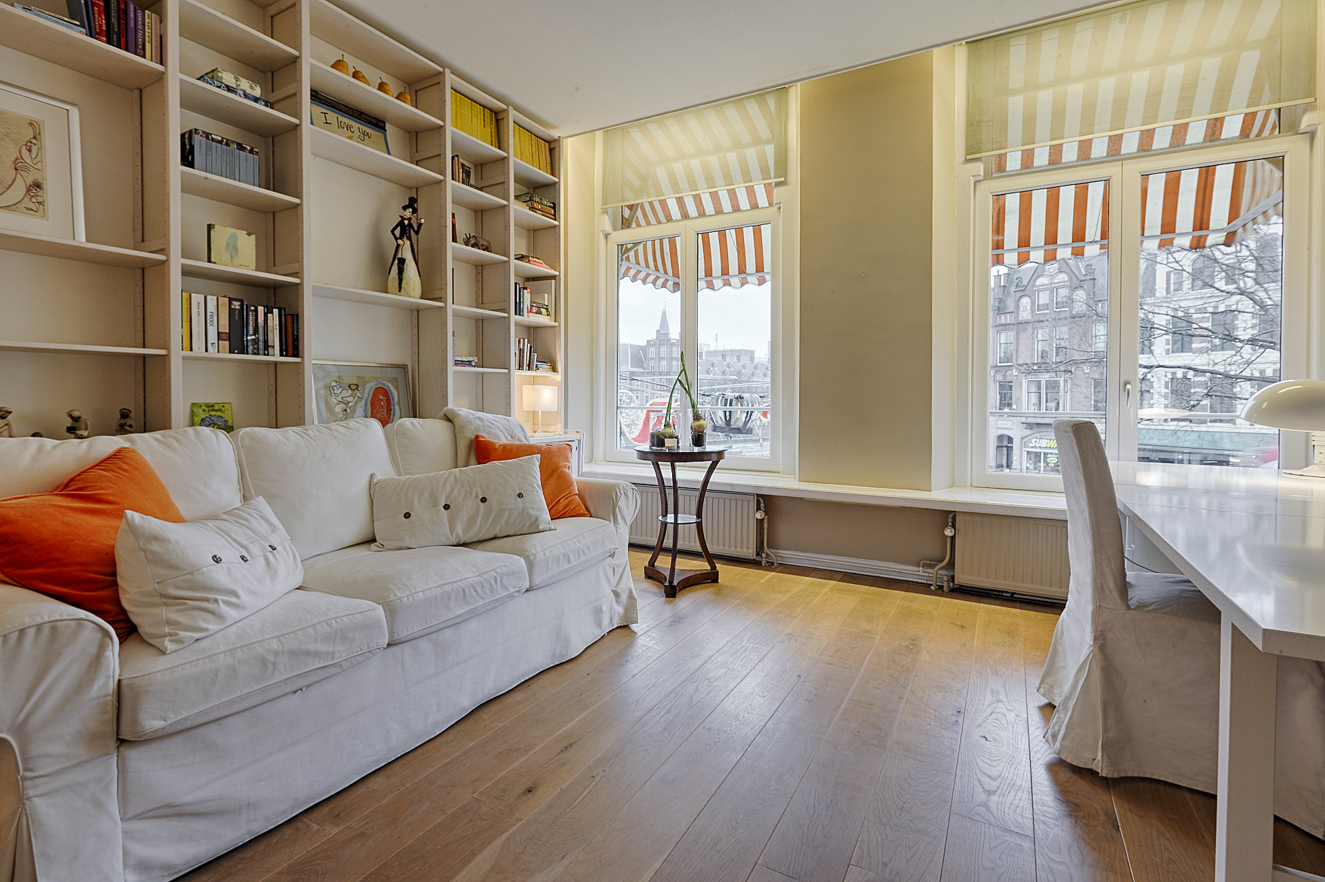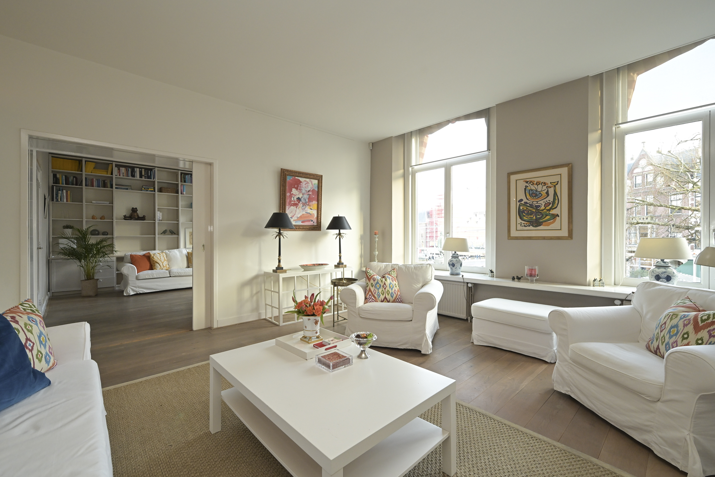 At the front of the building is the imposing living room, high ceilings, a stylish fireplace, and a phenomenal view of the Hofvijver. From the living room, there is an elegant passageway to a spacious library or bedroom, complete with open bookcases. Adjacent is a hallway with ample closet space and a finished marble bathroom with a vanity, shower, and toilet. The kitchen is equipped with built-in appliances and ample closet space. At the rear of the apartment is the very spacious master bedroom, offering peace and privacy. This room opens onto a hallway with a walk-in closet and space for the gas central heating boiler. There is also a separate laundry room with connections for a washer and dryer and additional storage space. The second, luxurious marble bathroom features a bathtub, a spacious walk-in shower, a stylish vanity with a built-in vanity, and a toilet.