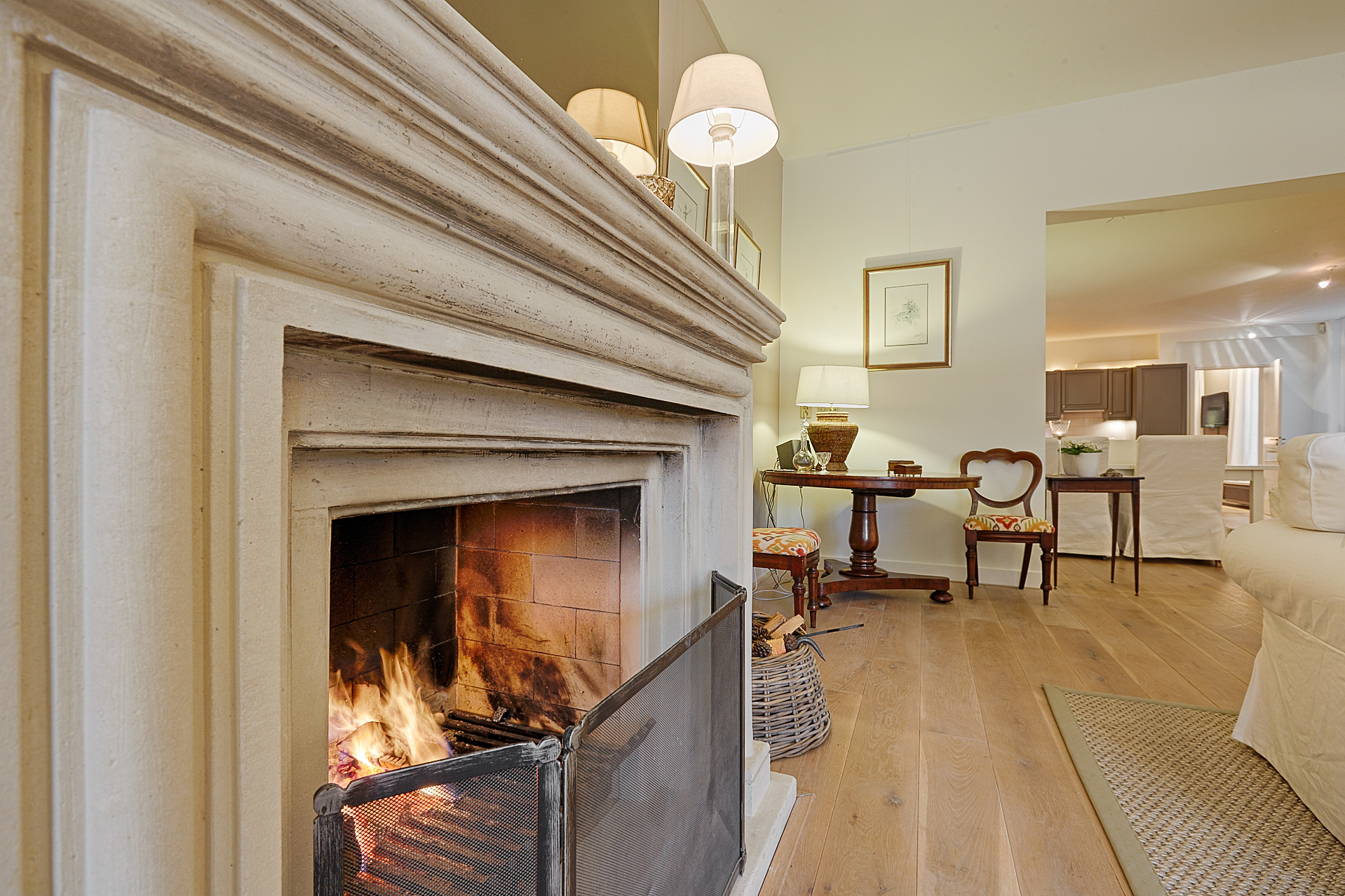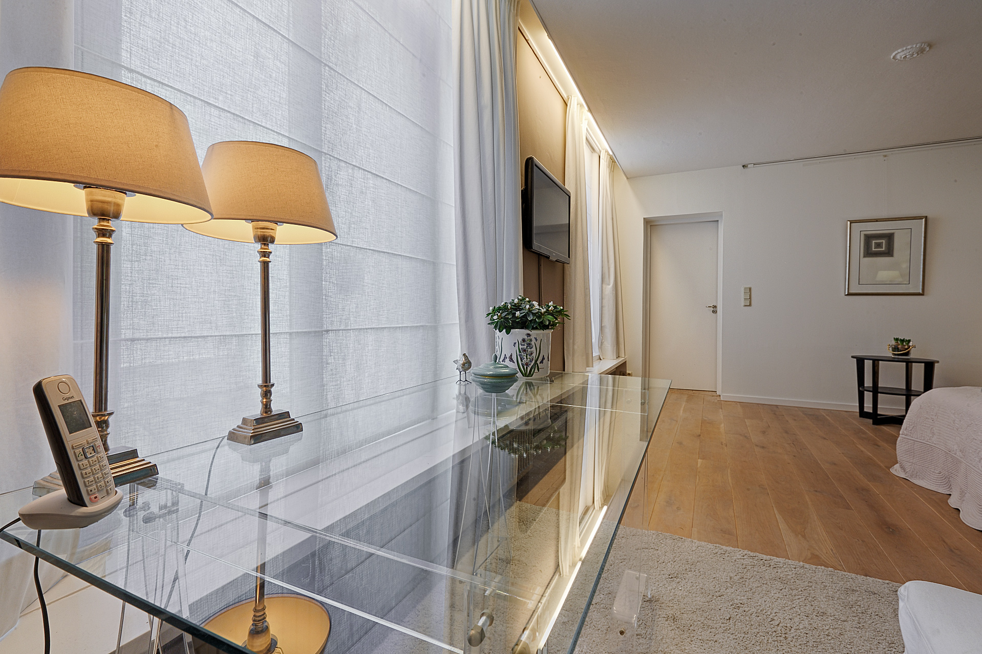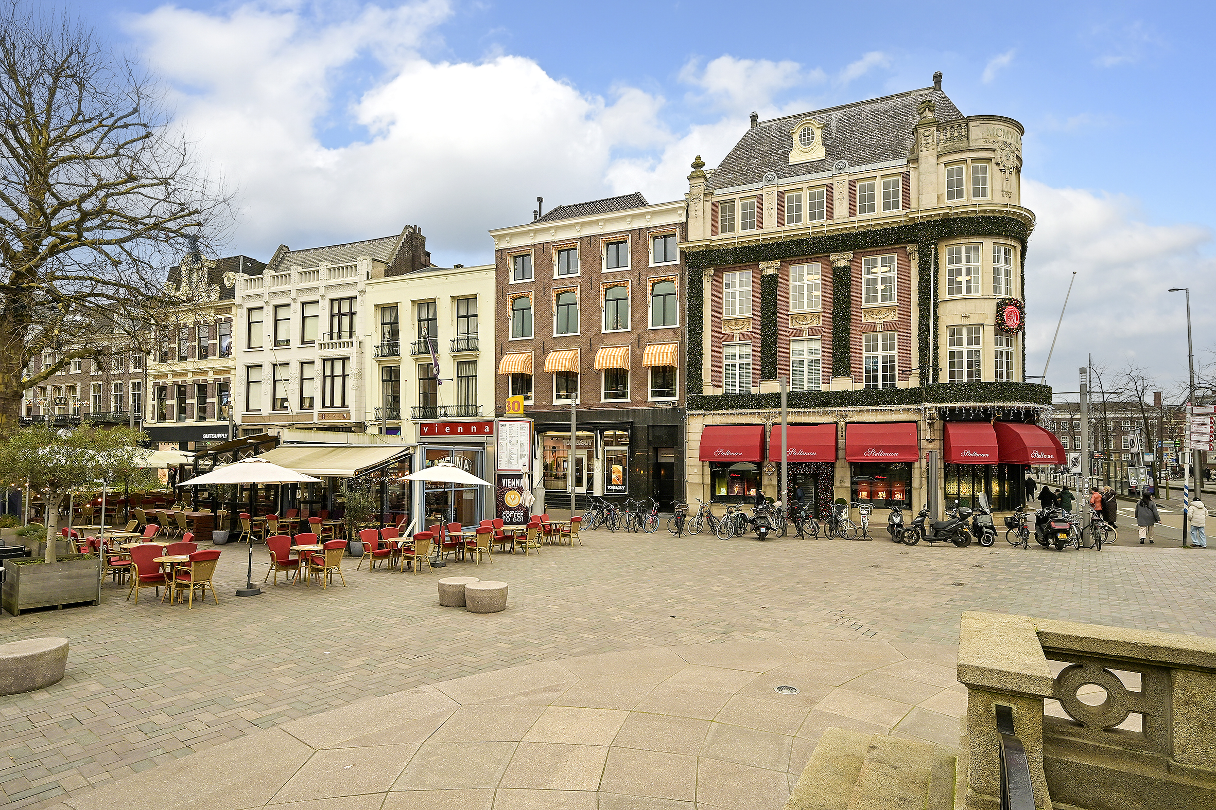 At the front of the building is the imposing living room, high ceilings, a stylish fireplace, and a phenomenal view of the Hofvijver. From the living room, there is an elegant passageway to a spacious library or bedroom, complete with open bookcases. Adjacent is a hallway with ample closet space and a finished marble bathroom with a vanity, shower, and toilet. The kitchen is equipped with built-in appliances and ample closet space. At the rear of the apartment is the very spacious master bedroom, offering peace and privacy. This room opens onto a hallway with a walk-in closet and space for the gas central heating boiler. There is also a separate laundry room with connections for a washer and dryer and additional storage space. The second, luxurious marble bathroom features a bathtub, a spacious walk-in shower, a stylish vanity with a built-in vanity, and a toilet.