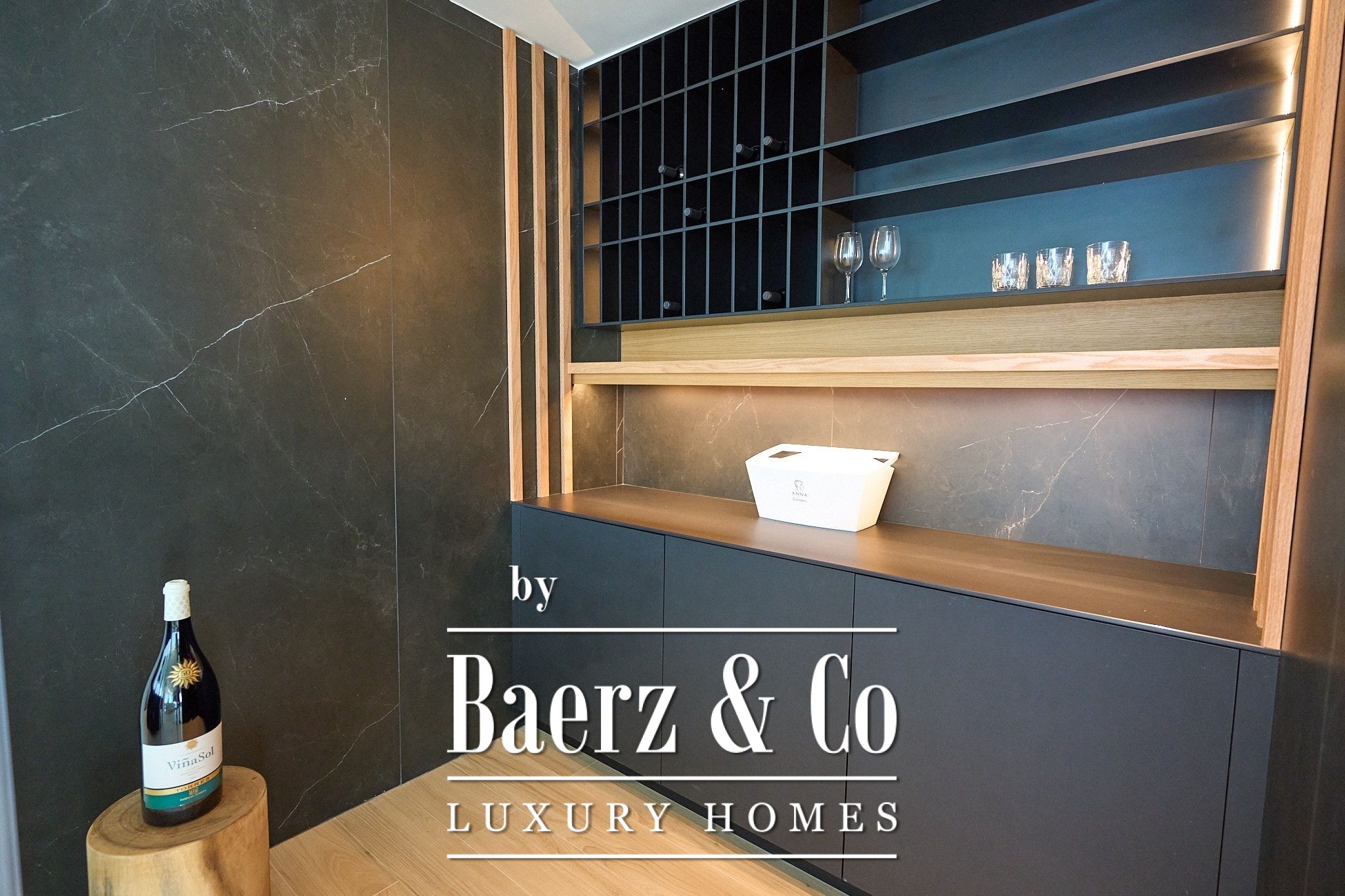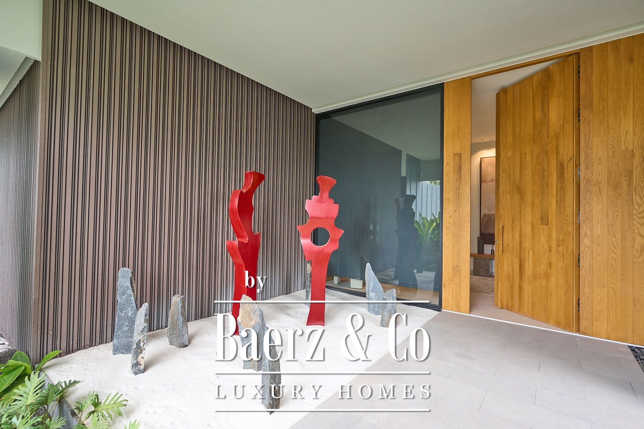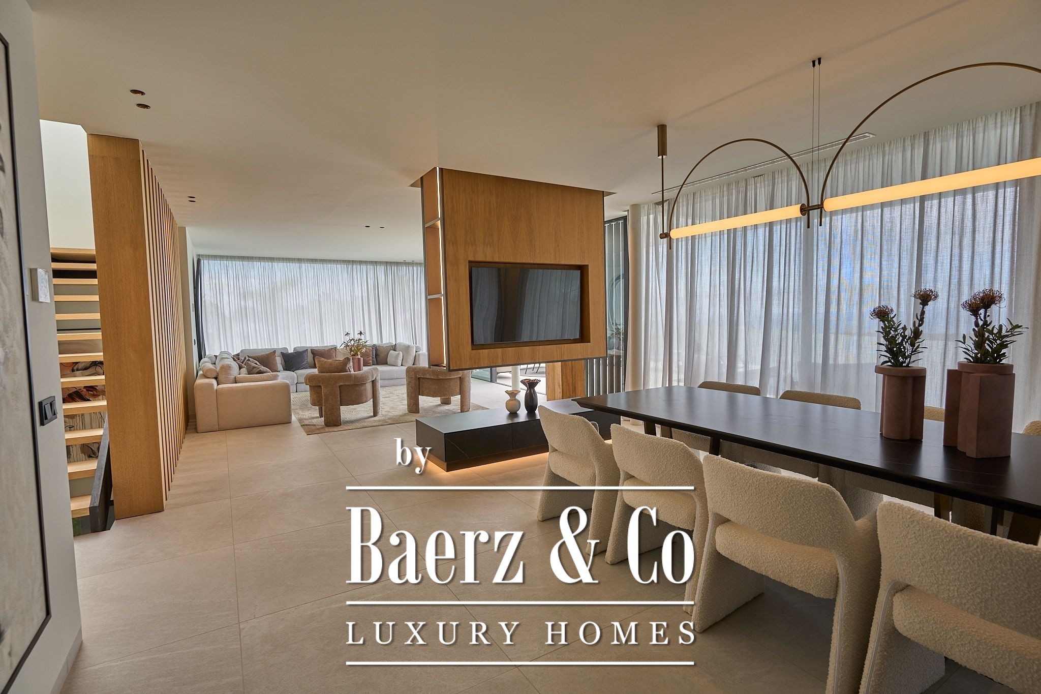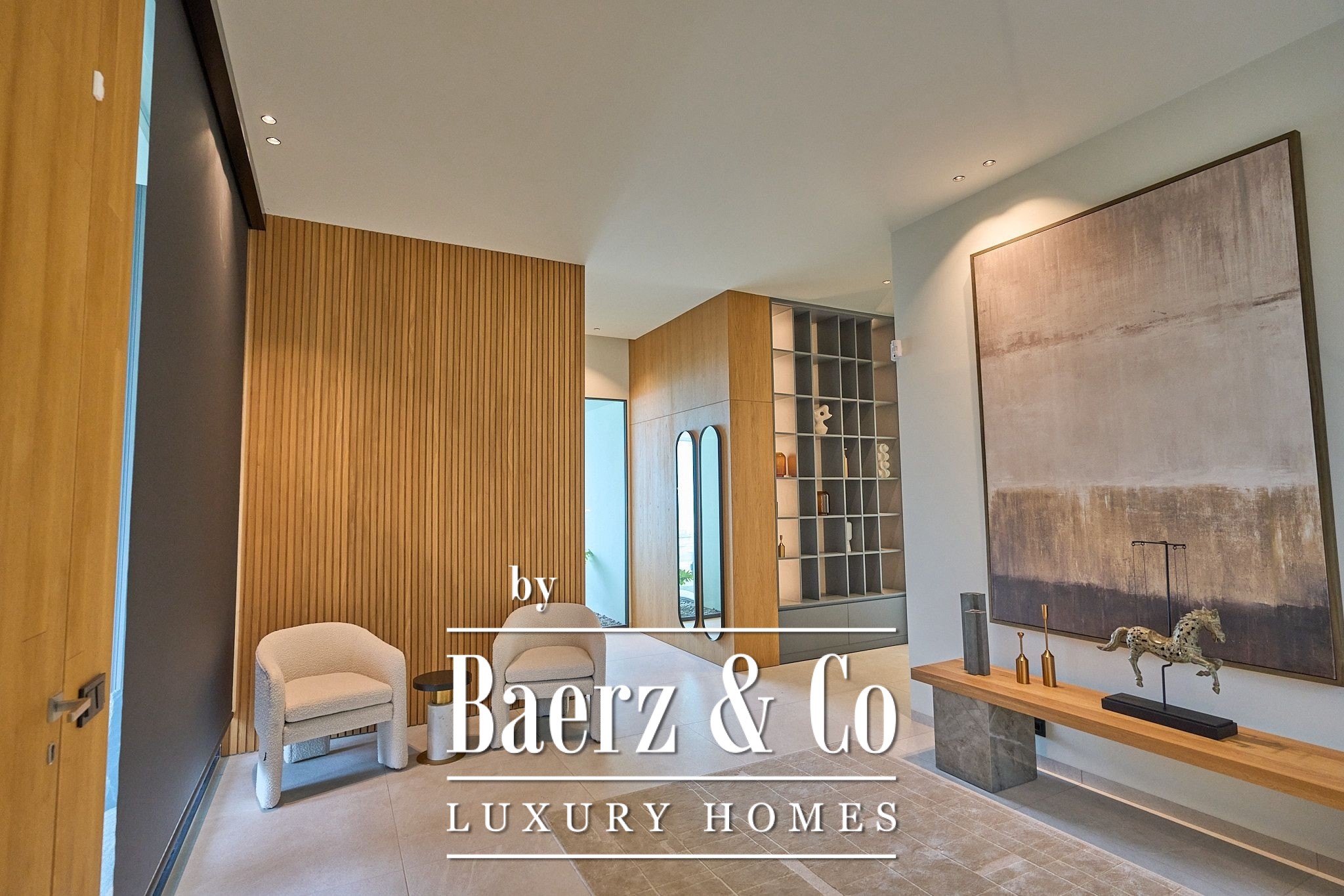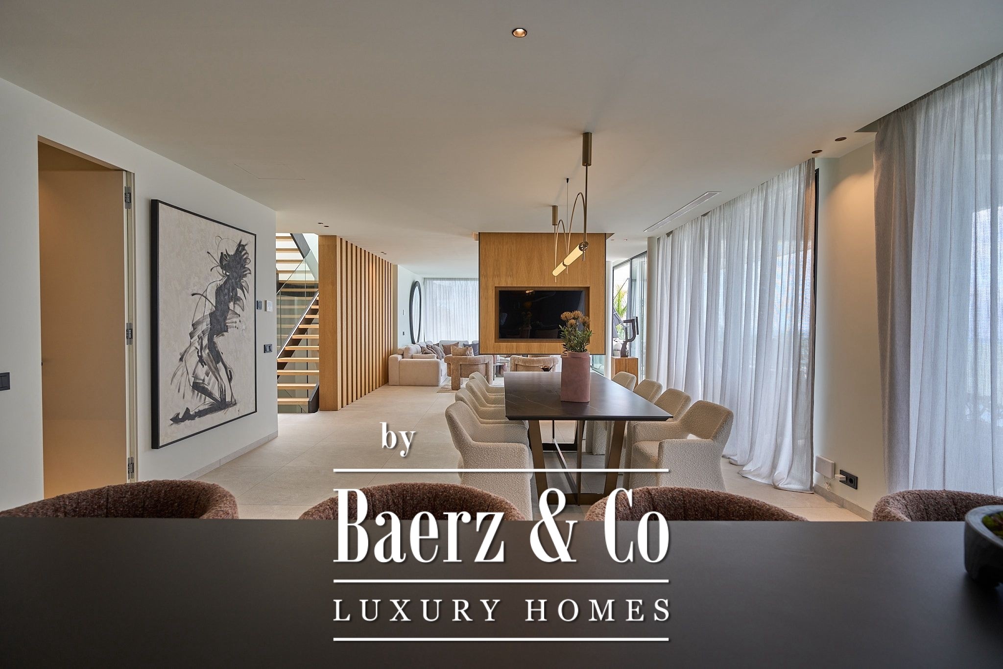 The villa features four en-suite bedrooms, each with built-in wardrobes and private access to lush tropical gardens that elevate the sense of space and tranquility. Upstairs, the spacious living and dining area flows naturally into a modern, fully equipped kitchen complemented by a climate-controlled wine cellar, while expansive windows amplify natural light and connect seamlessly to the exterior.