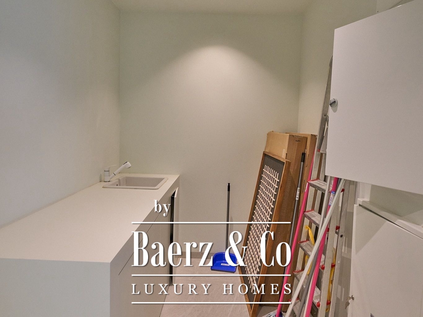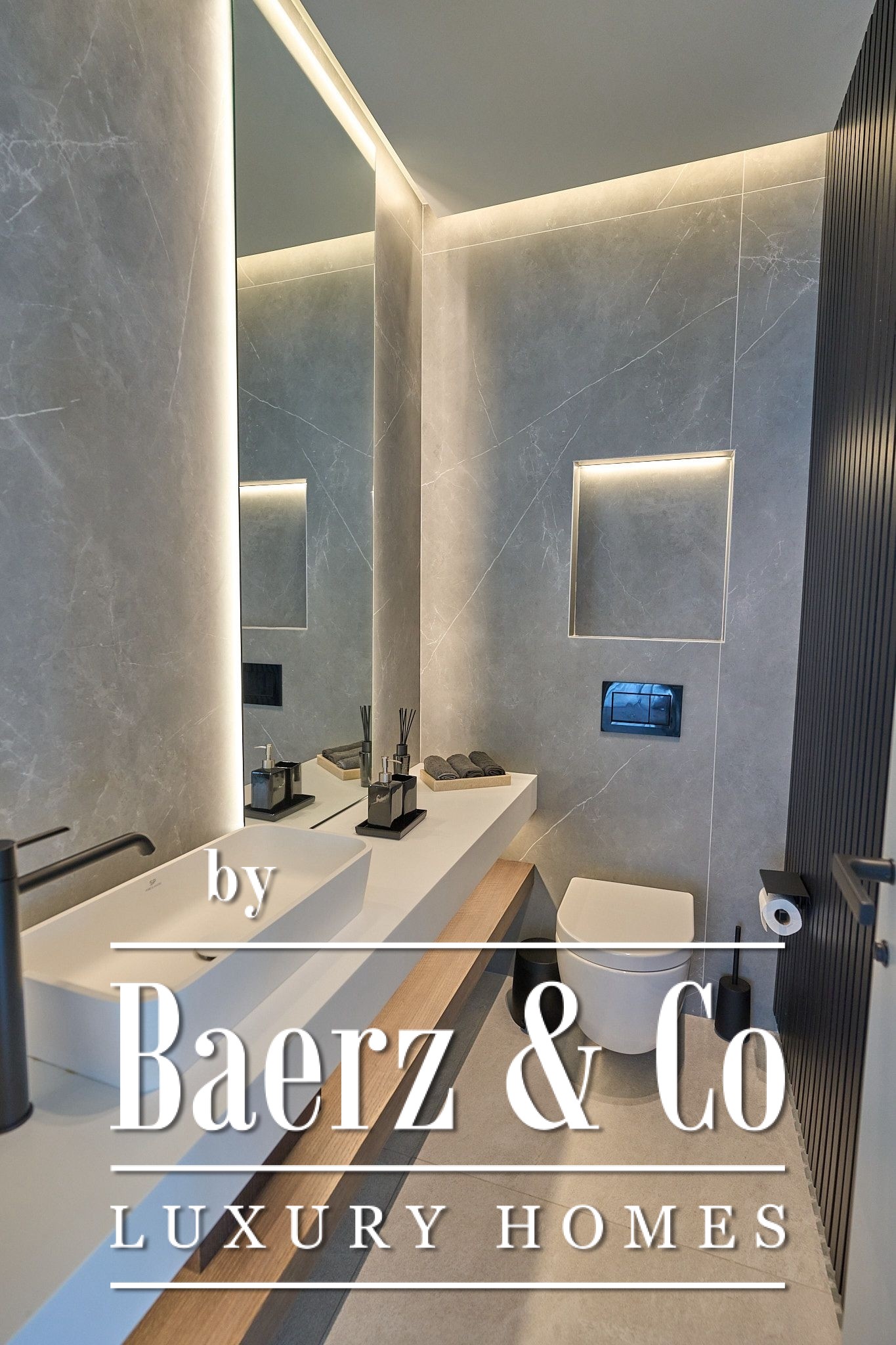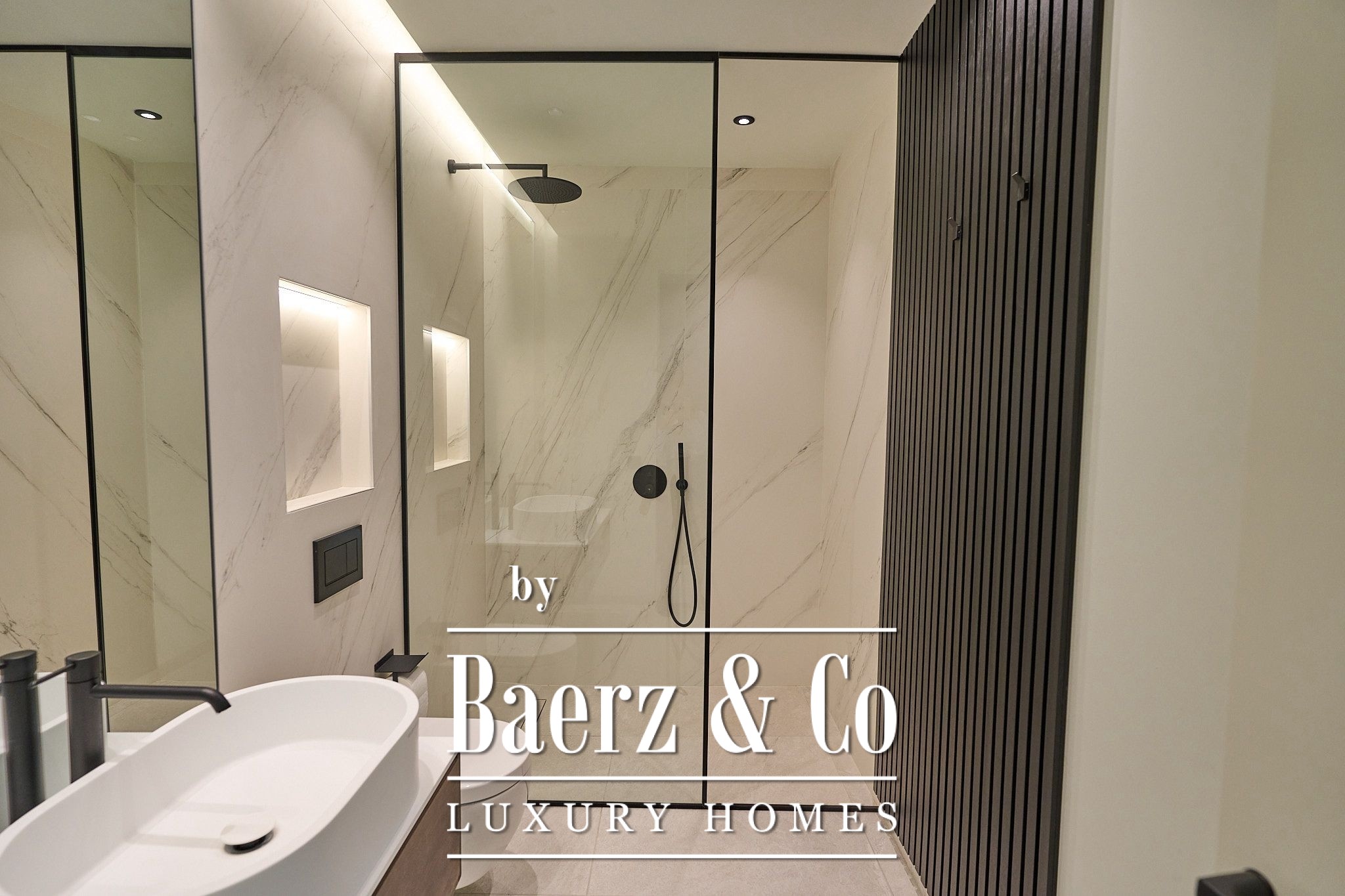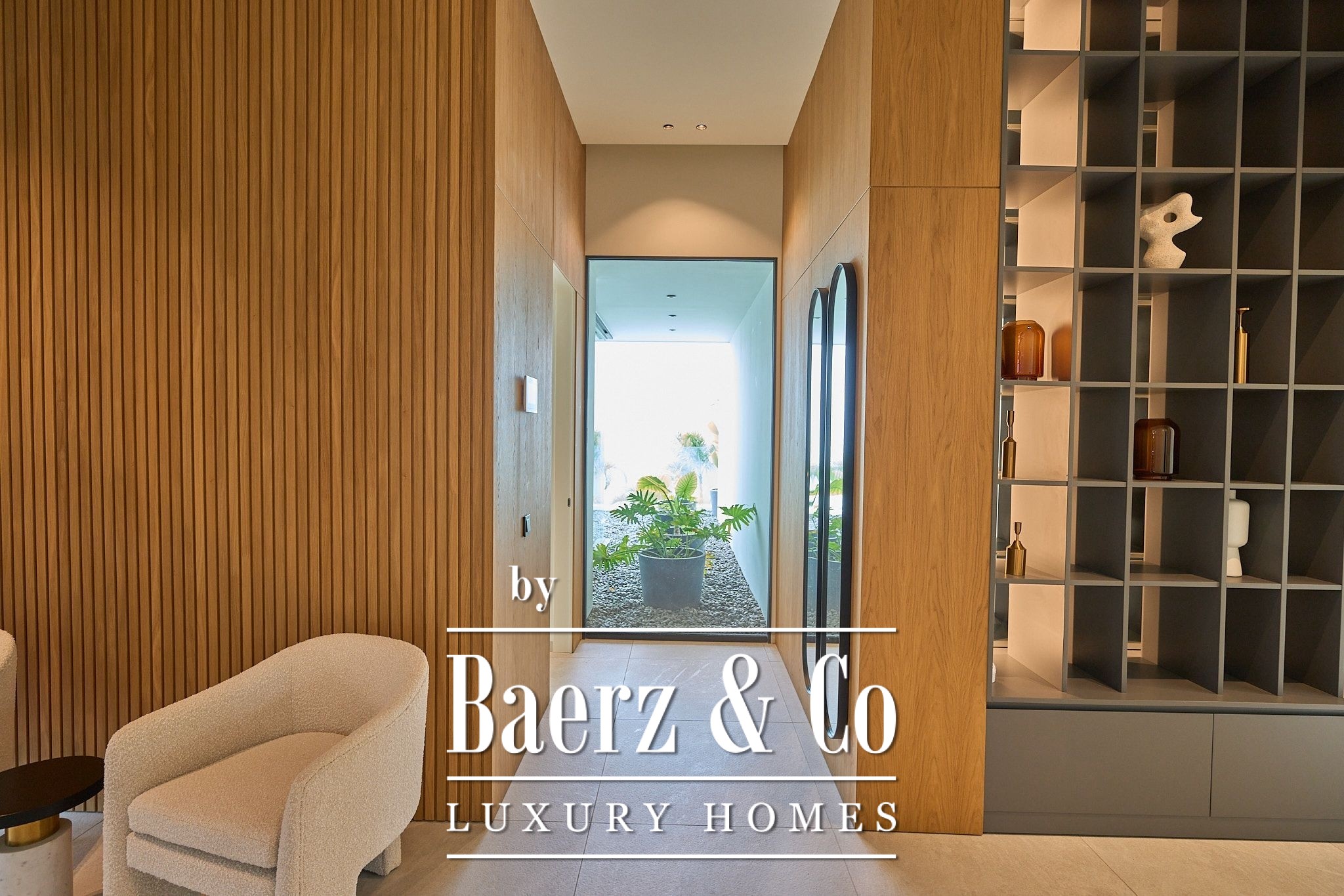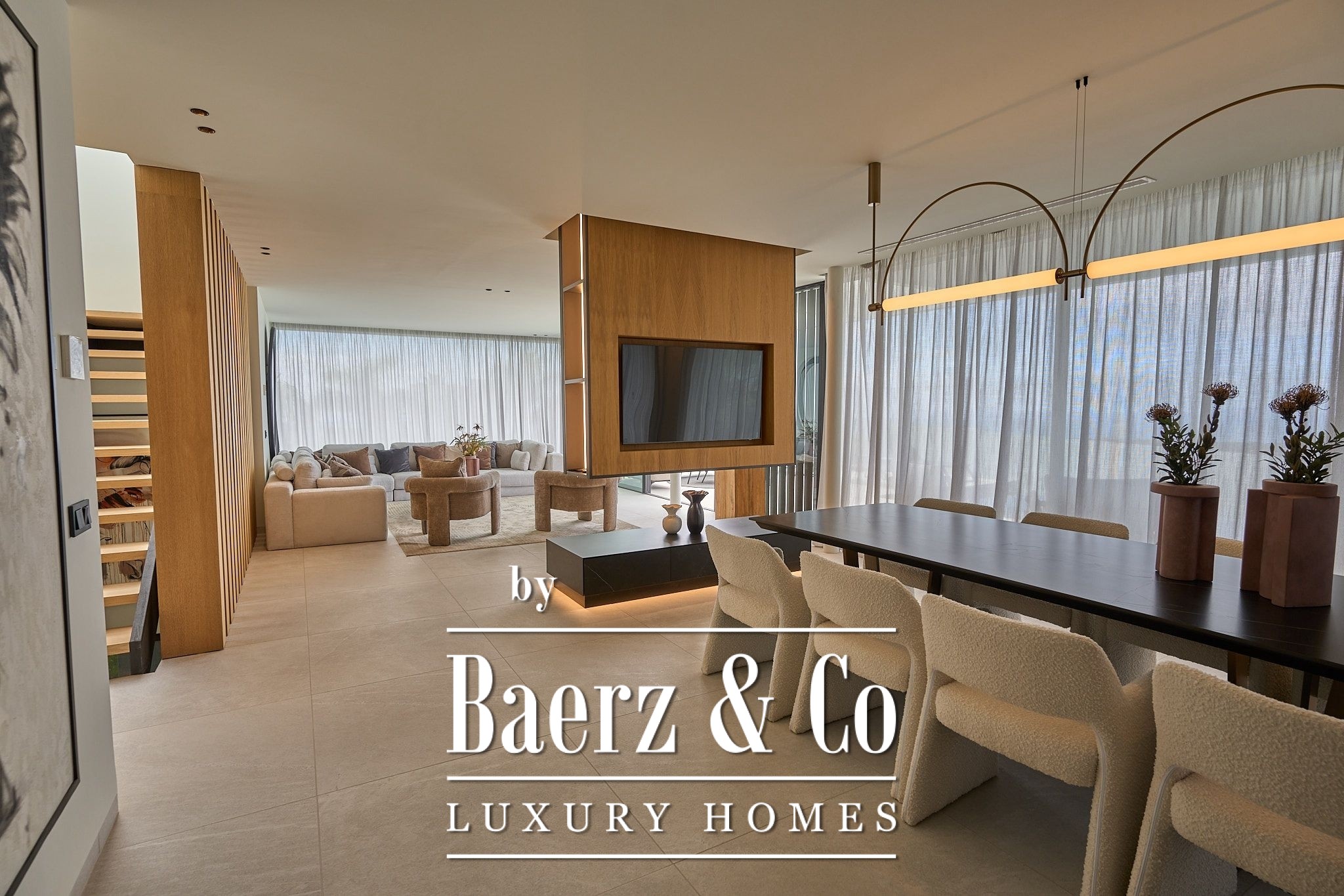 The villa features four en-suite bedrooms, each with built-in wardrobes and private access to lush tropical gardens that elevate the sense of space and tranquility. Upstairs, the spacious living and dining area flows naturally into a modern, fully equipped kitchen complemented by a climate-controlled wine cellar, while expansive windows amplify natural light and connect seamlessly to the exterior.