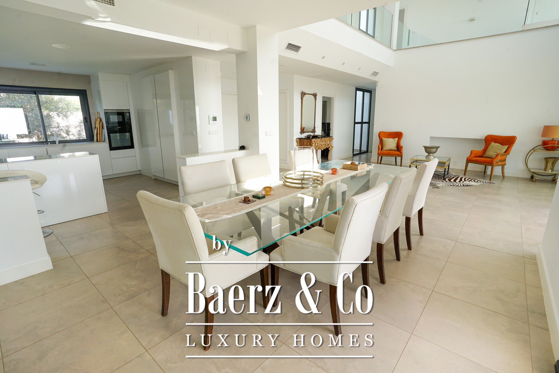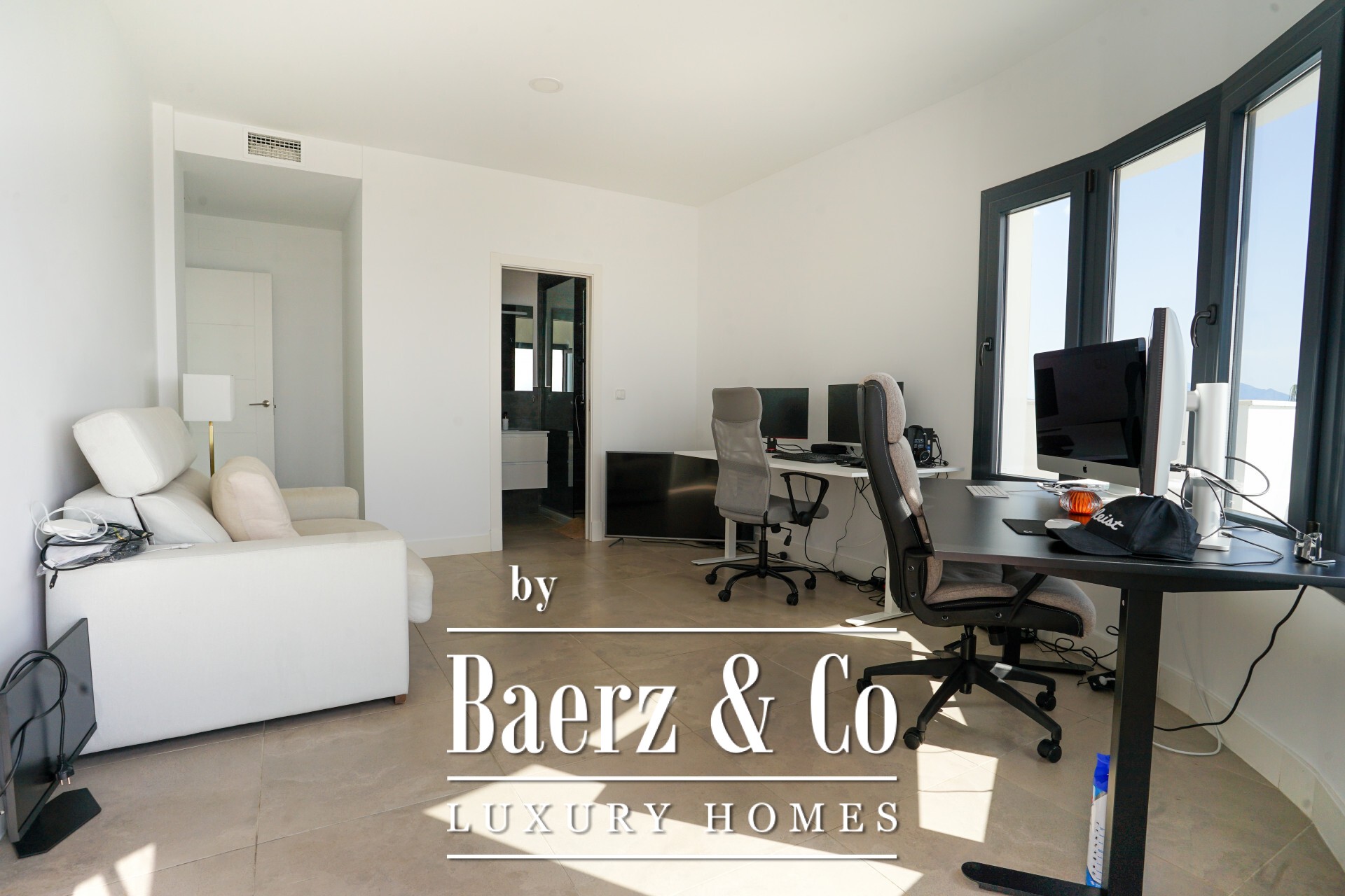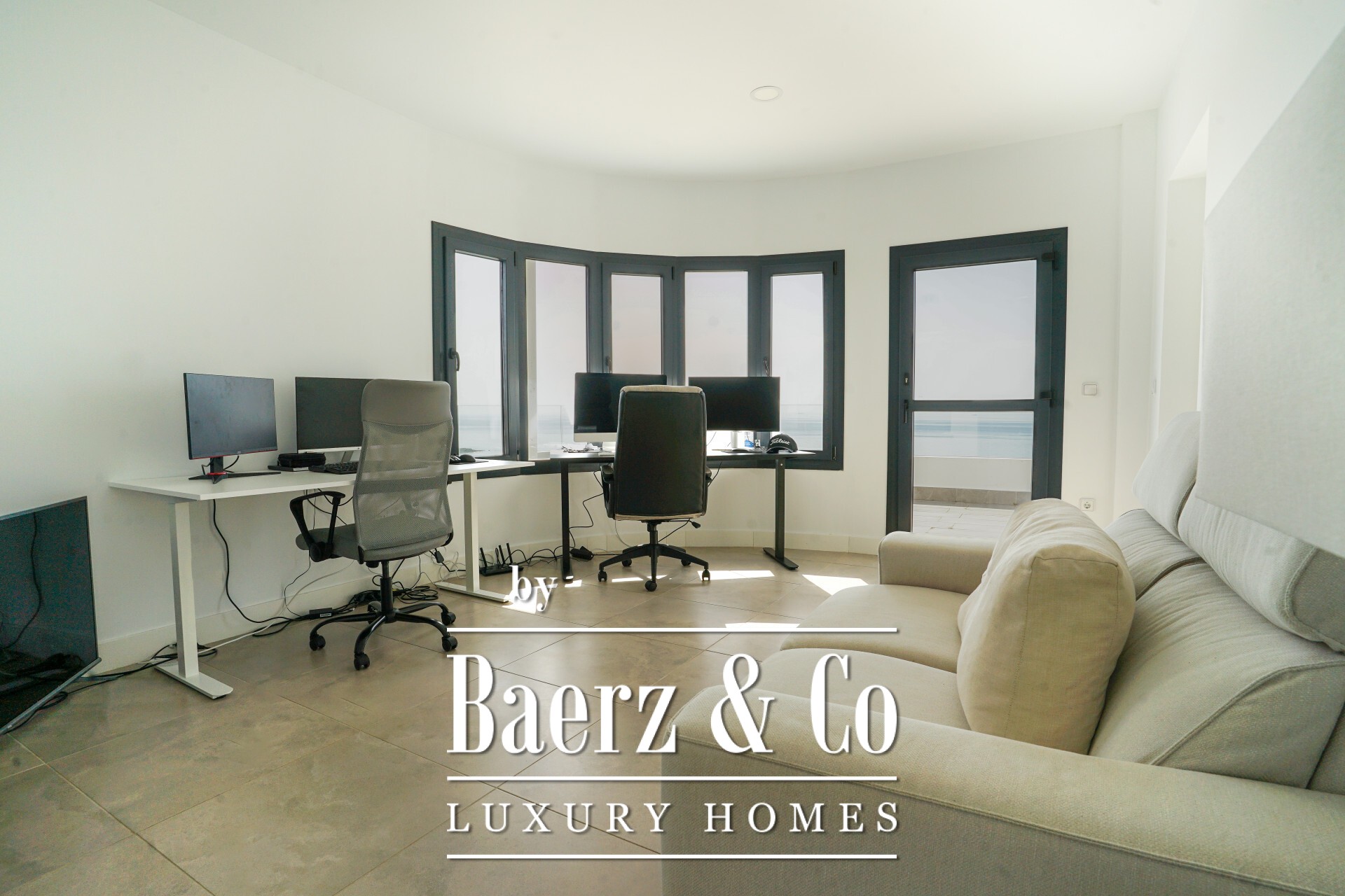 The main living spaces form an open flow, where floor-to-ceiling glass connects a spacious lounge and dining area to covered outdoor zones. An elegant, fully fitted kitchen with high-end appliances transitions to an outdoor barbecue area, while a separate TV room, private gym, steam room, and private office enhance daily life. Four bedrooms and five bathrooms, three of them en-suites, offer flexibility and privacy, including an office ready to become a fifth suite.