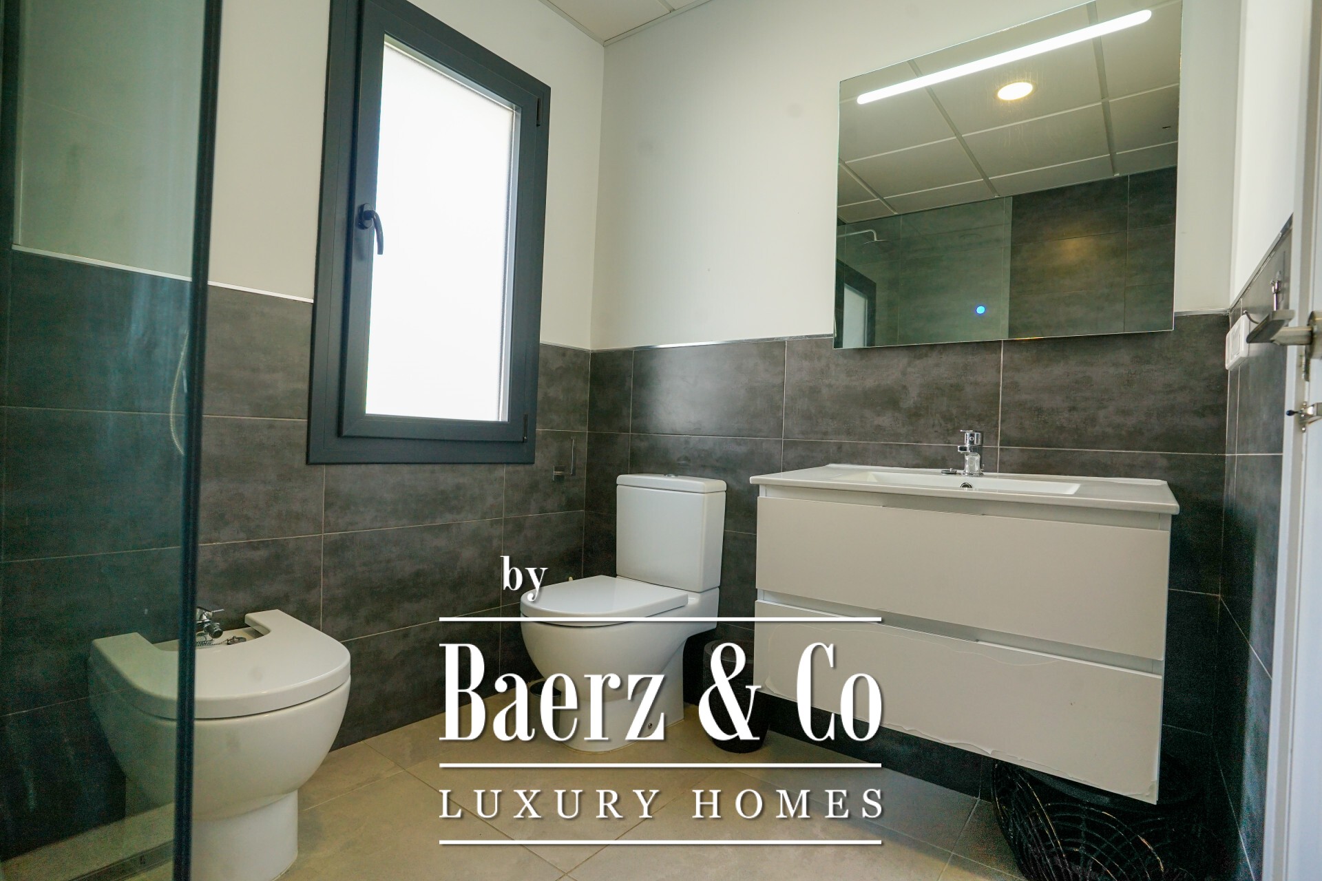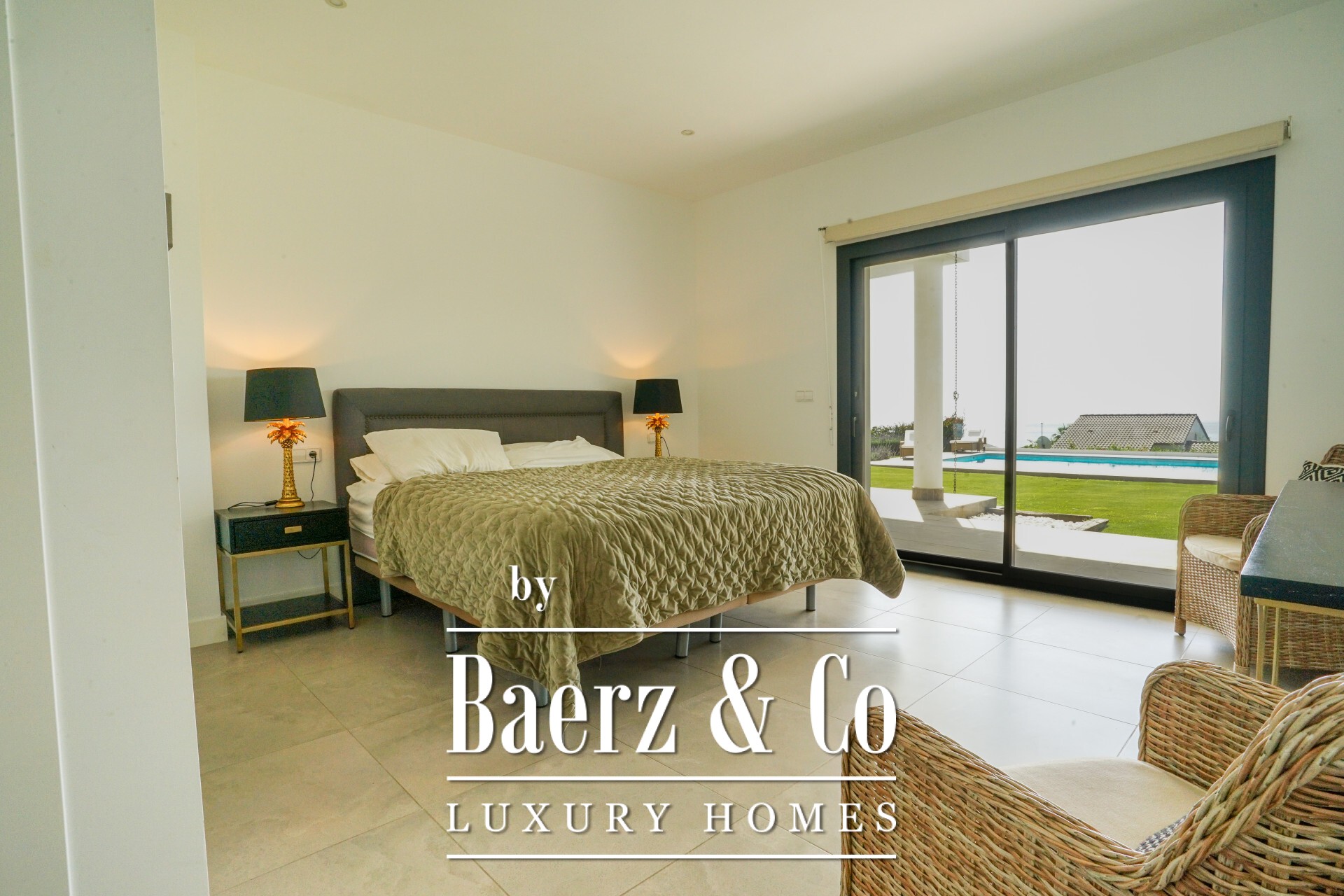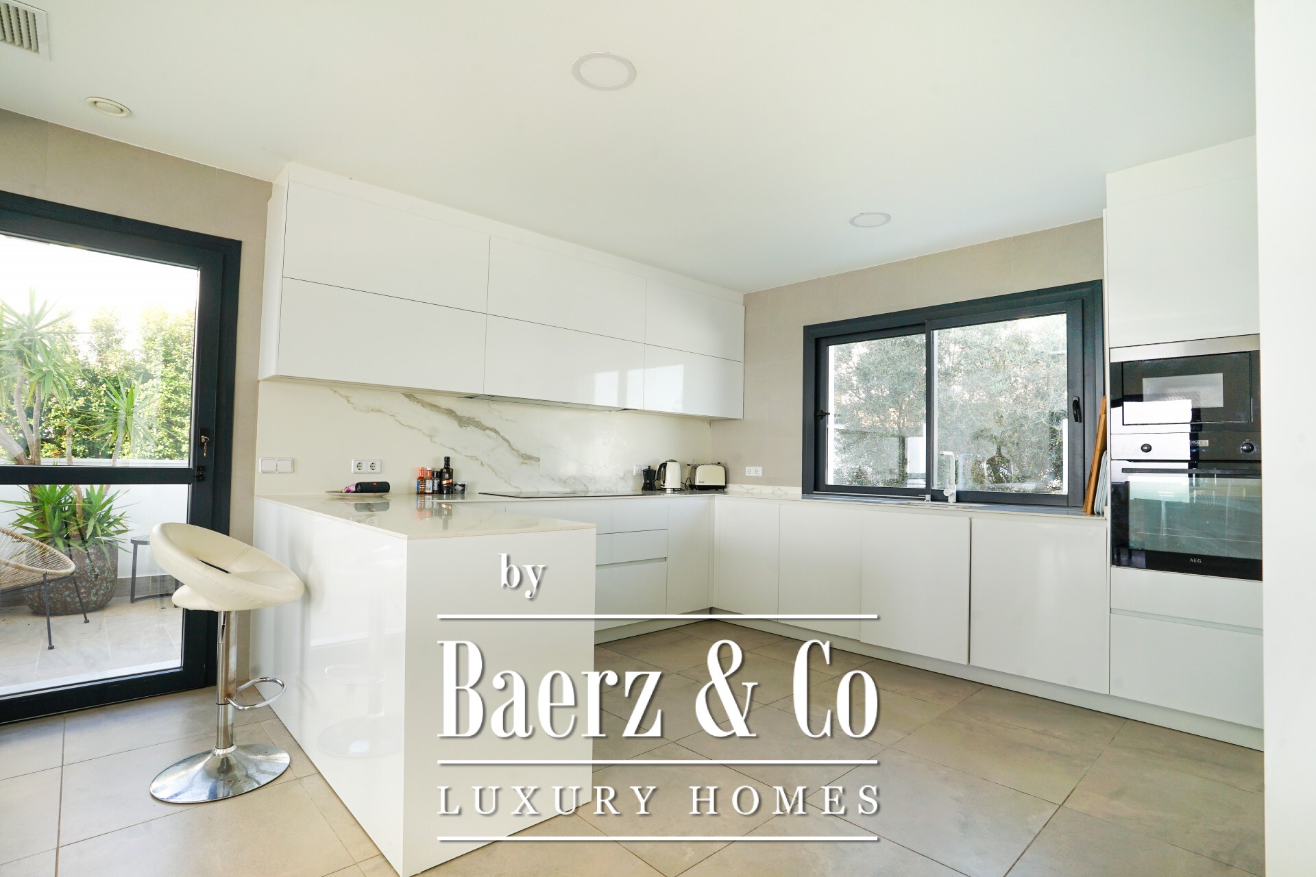 The main living spaces form an open flow, where floor-to-ceiling glass connects a spacious lounge and dining area to covered outdoor zones. An elegant, fully fitted kitchen with high-end appliances transitions to an outdoor barbecue area, while a separate TV room, private gym, steam room, and private office enhance daily life. Four bedrooms and five bathrooms, three of them en-suites, offer flexibility and privacy, including an office ready to become a fifth suite.
