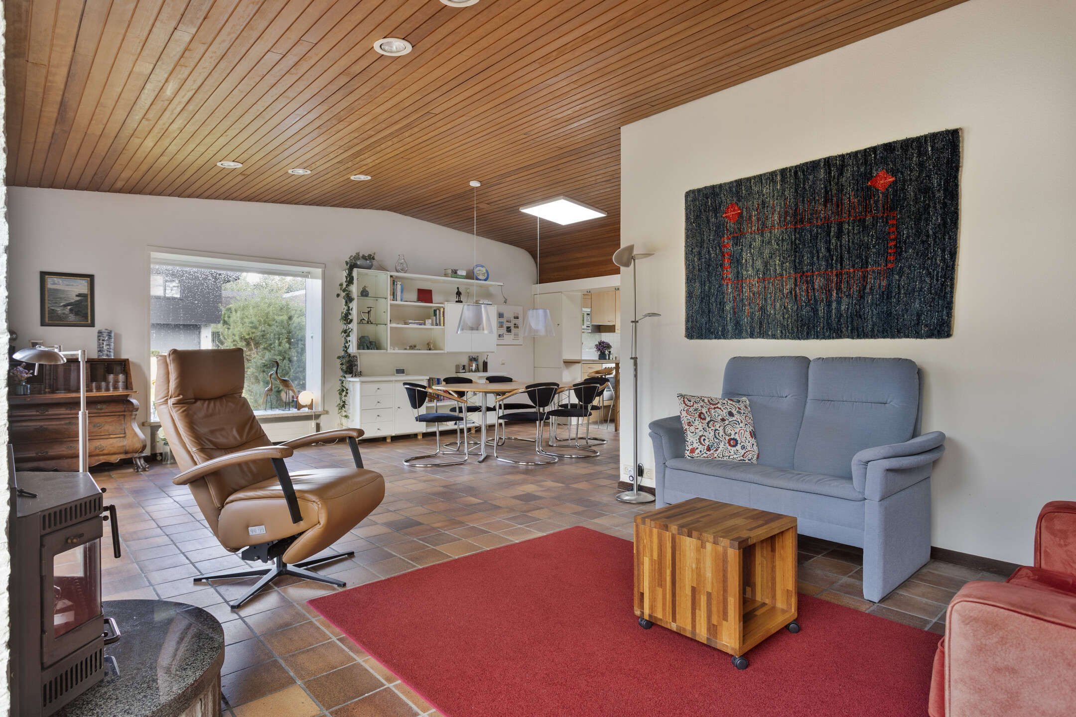 De royale woonkamer met grote raampartijen, schuifpui en open haard biedt een sfeervolle leefruimte met prachtig zicht op de tuin. Aansluitend de eetkamer en de halfopen keuken, uitgerust met onder andere een oven, vaatwasser, elektrische kookplaat en koelkast. De houten plafondafwerking zorgt voor een warme, karakteristieke uitstraling.