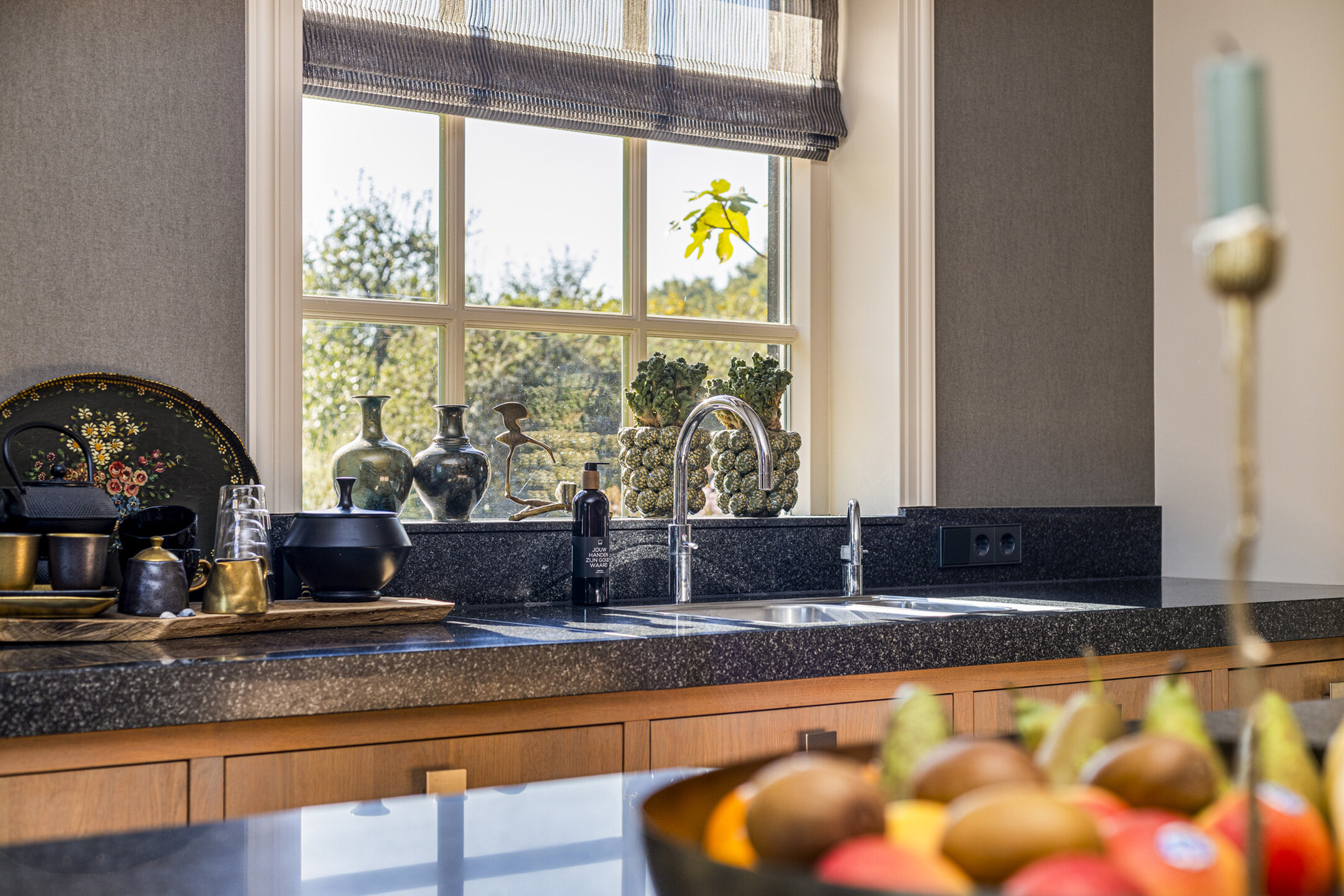 When an agency like Eelerwoude gets involved in landscaping, you just know it's going to be okay. And so it did. The gardens around the house are once again bordered by the moat, through which the crystal-clear water of the Berkel gaily splashes. From the house, living is focused on the Berkel and the village beyond. On the right side you have a view of the beech forest, where you can go via the little bridge to take a walk; between the trees is a path.