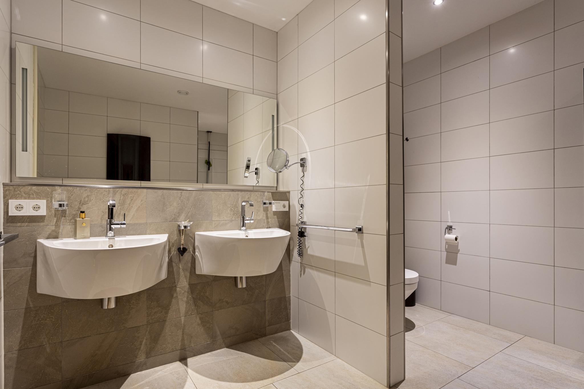 The kitchen is truly one of a kind: completely custom made and put together by a kitchen studio. The large kitchen features heavy oak fronts and granite countertops. All built-in appliances are by Gaggenau, which guarantees optimal design and function. There is an appliance wall with double refrigerators and a steam and a convection oven. On the other side, overlooking the sunny side terrace a large worktop with double sink and a five-in-one boiling water faucet. Up front, in the contemporary cove, the stove with wok burner, plancha and four large gas burners.