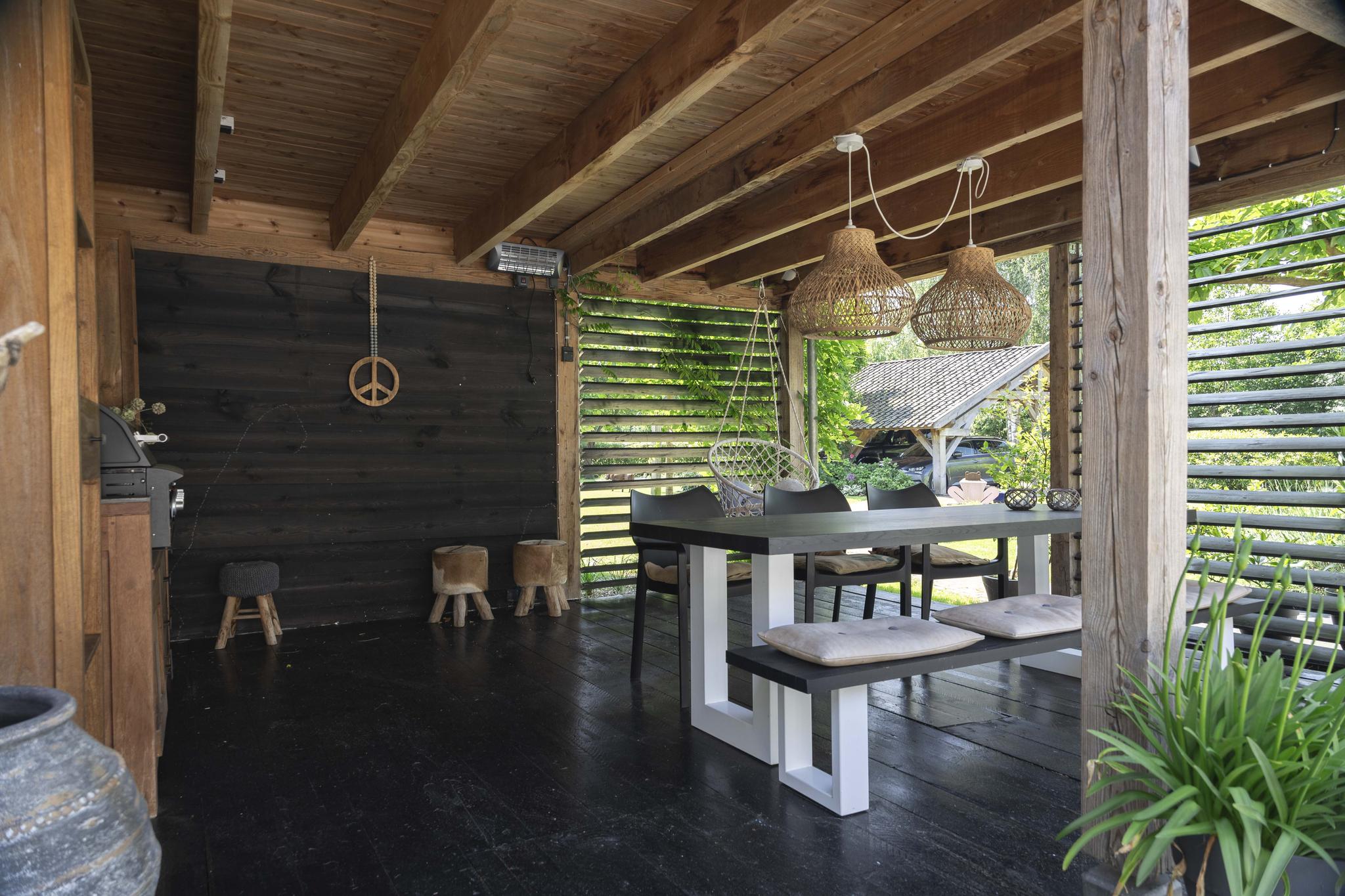 The sunshine is ideal; the backyard faces perfectly south. Behind the house, accessible from the living room, kitchen and utility room, the lovely sun terrace. Under the canopy is a lounge area furnished with a loam stove.