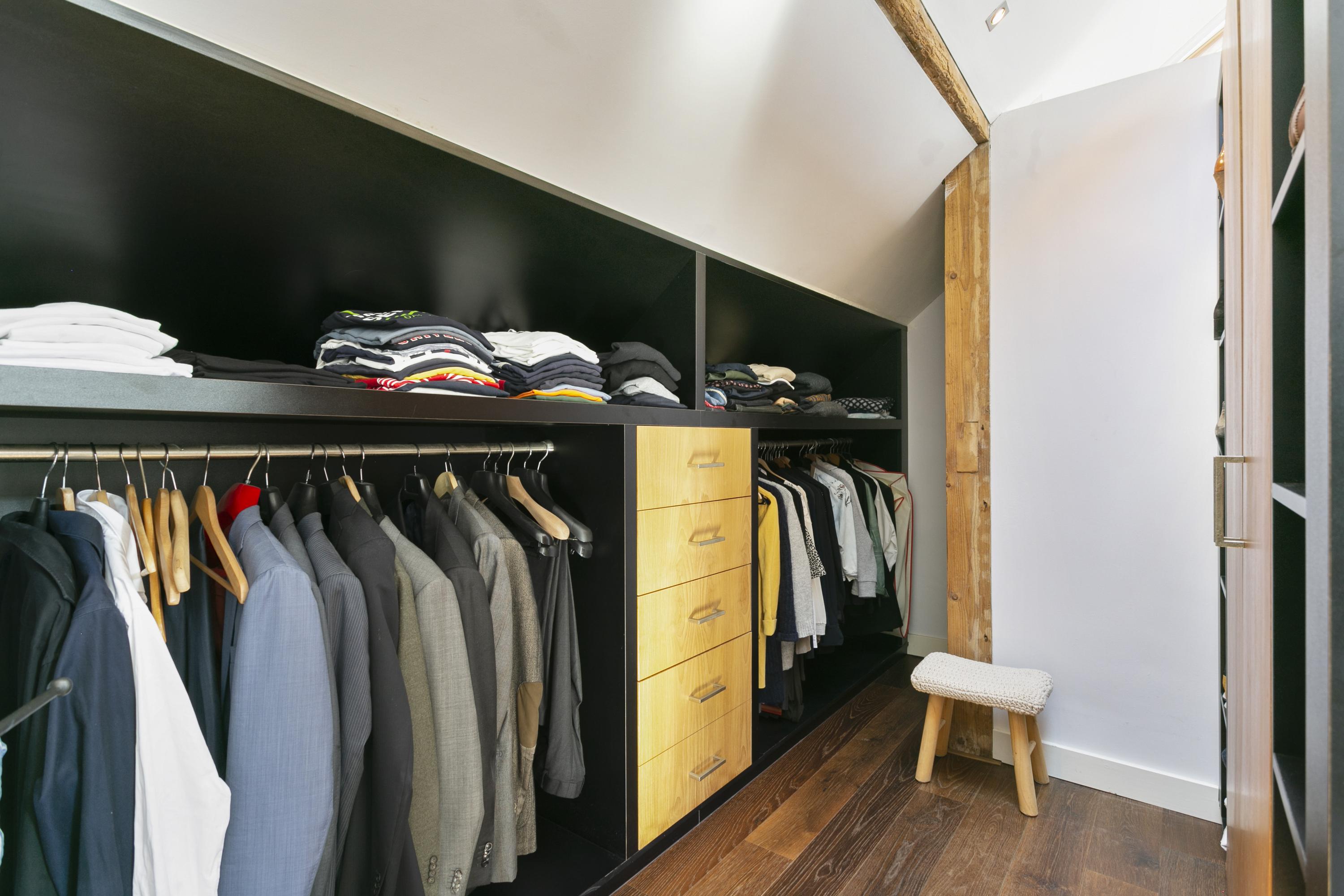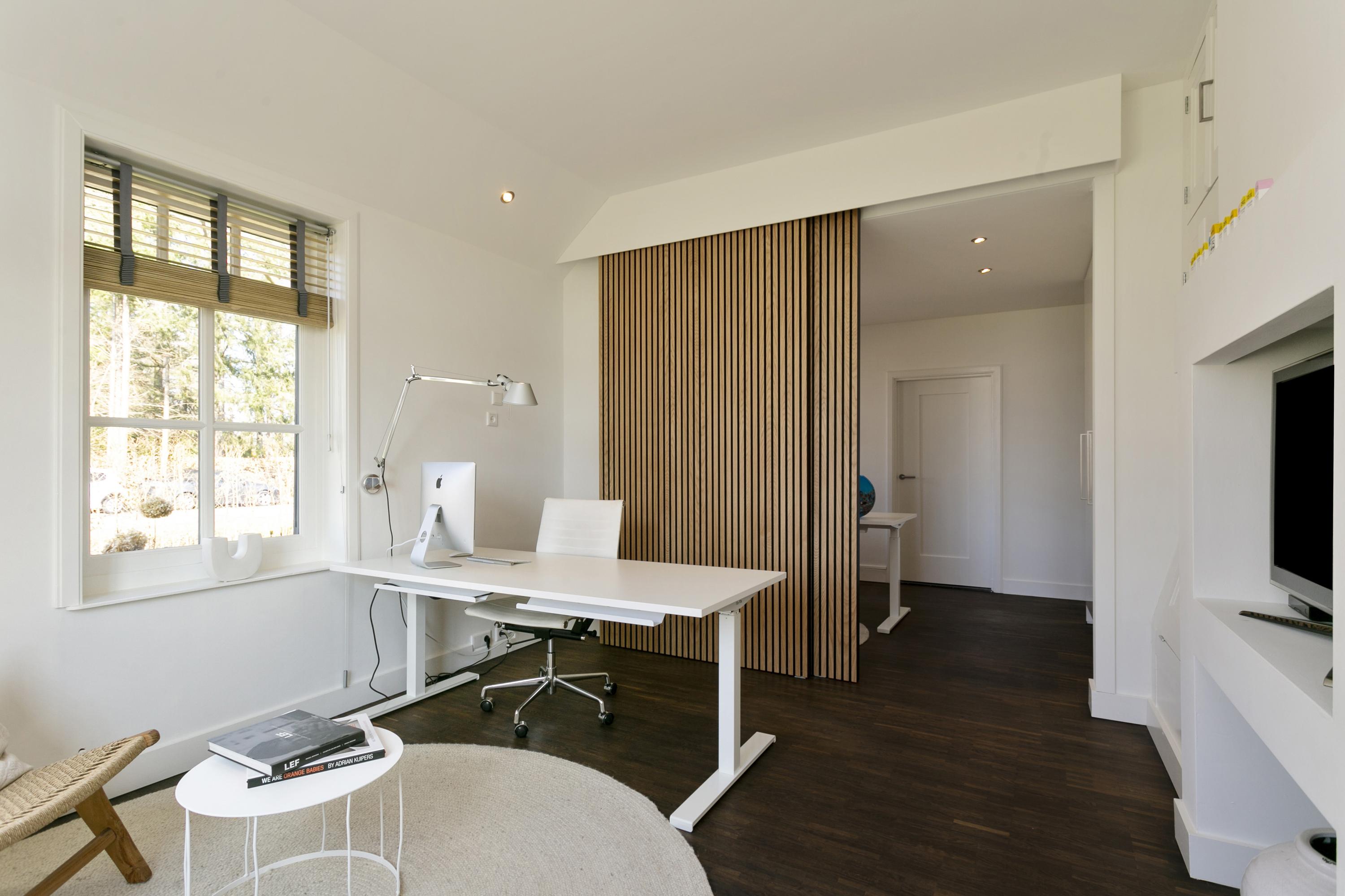 The former part is now a spacious living space (70 m²). On the south side, both the visible part of the roof and the walls are filled with glass, so the space is bathed in natural light. On the floor is a light cast floor, which works perfectly with the underfloor heating. The eye-catcher in the room is the fireplace behind glass, which with one button ensures that a pleasant fire burns.