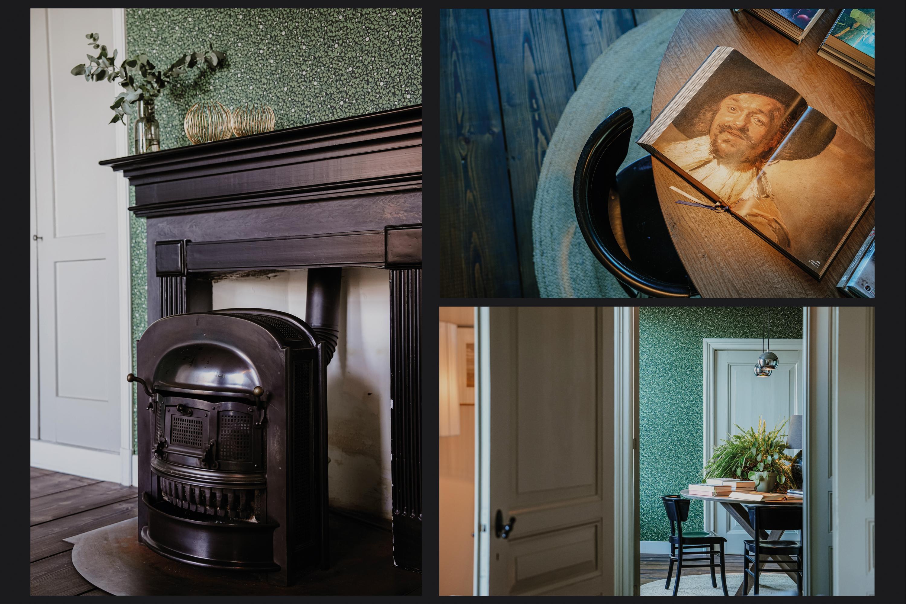 Centrale hal met aan de rechterzijde de voormalige gelagkamer. De antieke toogkast is een stille getuige van een ver verleden. De kamer is momenteel in gebruik als woonkamer, maar leent zich goed als werkruimte, atelier of studio. Er is een hoog balkenplafond, brede vloerdelen en hoge 6-ruits vensters zijn voorzien van Ruysdael monumentenglas, geflankeerd door binnenluiken. Er zijn tijdloze Jaga convectoren toegepast en een luxe Stuv haard zorgt voor maximaal comfort. Antieke paneeldeuren leiden naar de aangrenzende tuinkamer.