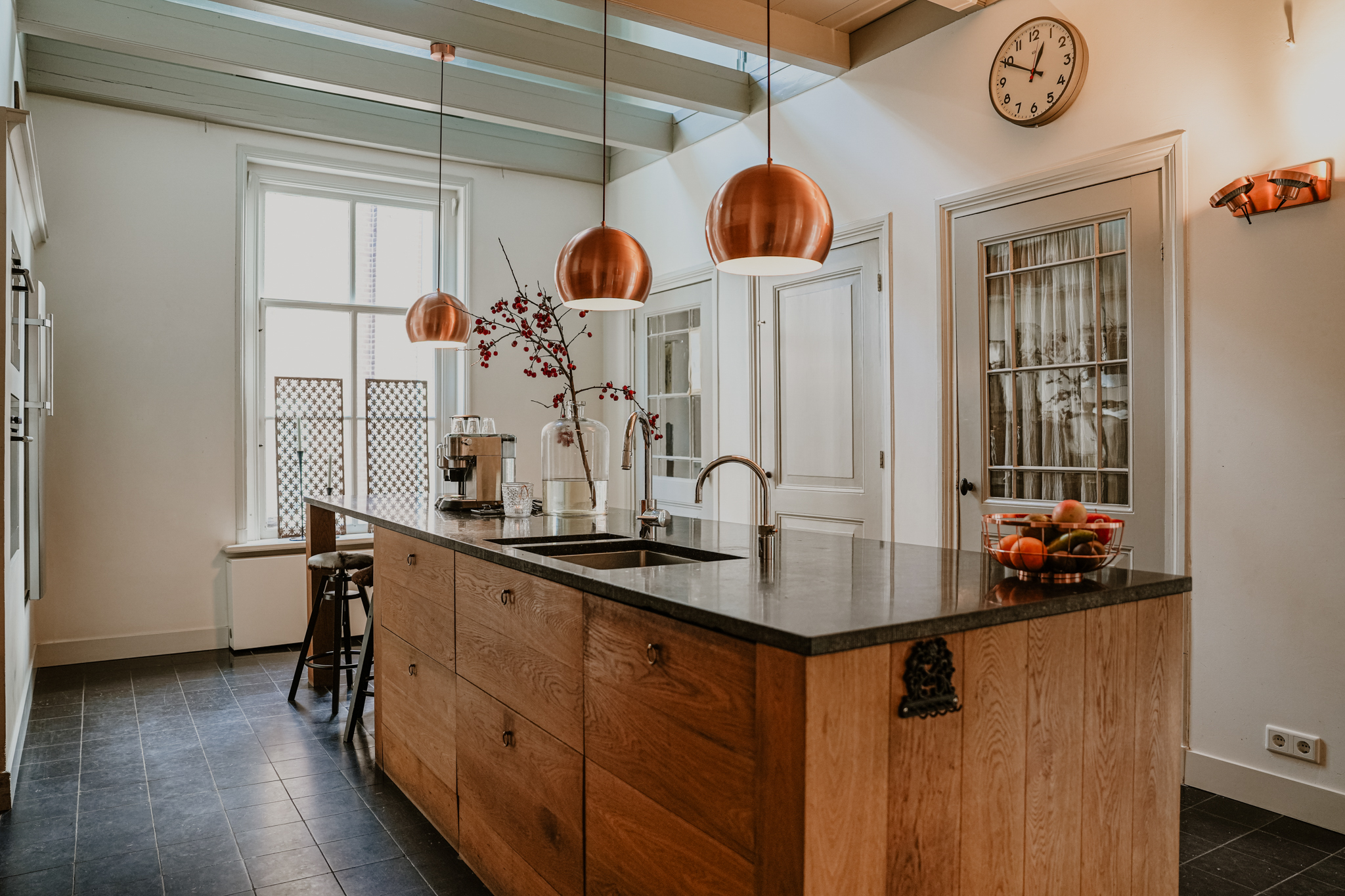 De tuinkamer beschikt over dubbele deuren naar de tuin, die zijn voorzien van binnenluiken. De houtkachel is aangesloten op de cv en de vloer is ook hier belegd met brede vloerdelen. Aan de tuinkamer grenst een ruime toiletruimte met voorportaal. De tuinkamer staat via een werkruimte in contact met de woonkeuken. De keuken is voorzien van een luxe houten keuken met een groot werkeiland en een natuurstenen werkblad met gefrijnde rand. Onder de antieke schouw is royaal ruimte om te wokken, grillen of koken. In de keuken is een deel van het plafond in veiligheidsglas uitgevoerd, zodat er niet alleen licht via het keukenraam binnenvalt, maar ook via het raam op de overloop. Aan de keuken grenzen twee opkamers, waarvan er één in gebruik is als provisieruimte en de andere als werkkamer. Onder de opkamers bevindt zich de wijnkelder. De keuken vormt een visuele eenheid met de aangrenzende eetkamer; een heerlijke leefruimte met houtkachel. Via de geïsoleerde, zwartstalen pui is volledig zicht op de tuin, waarin een imposante beuk de blikvanger is. Aan de eetkamer grenst een praktische bijkeuken en een achterhal met tweede toilet. Vanuit de achterhal is toegang tot de voormalige paardenstal die momenteel in gebruik is als (fietsen)berging. Het aangebouwde verwarmde bakhuis beschikt over aansluitingen van gas, water, elektra en riolering.