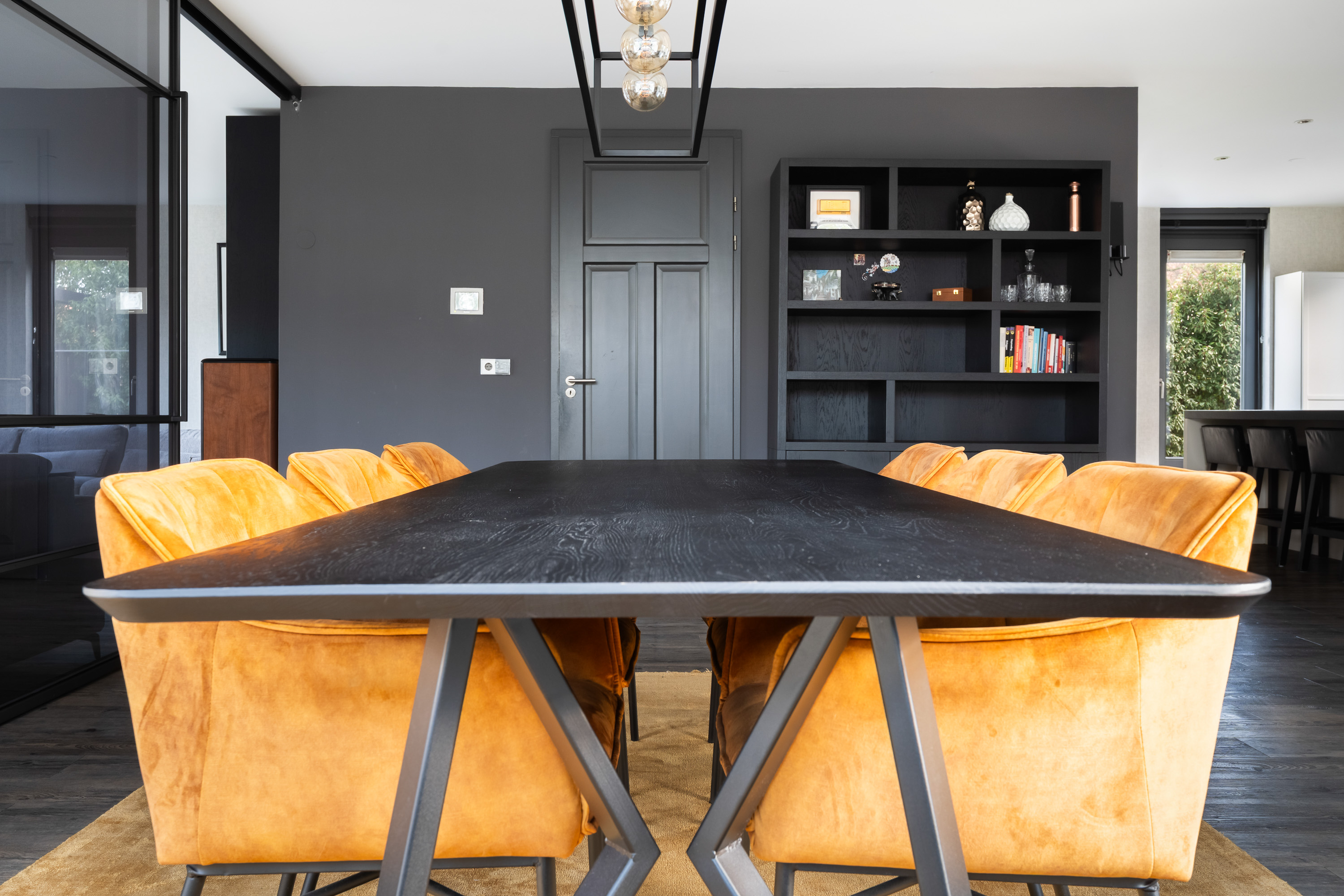 The living room is spacious and wonderfully bright. A true eye-catcher is the glass sliding wall with smoked glass, which stylishly separates the living room from the TV and reading room. This feature provides additional privacy without compromising the open character of the living space.