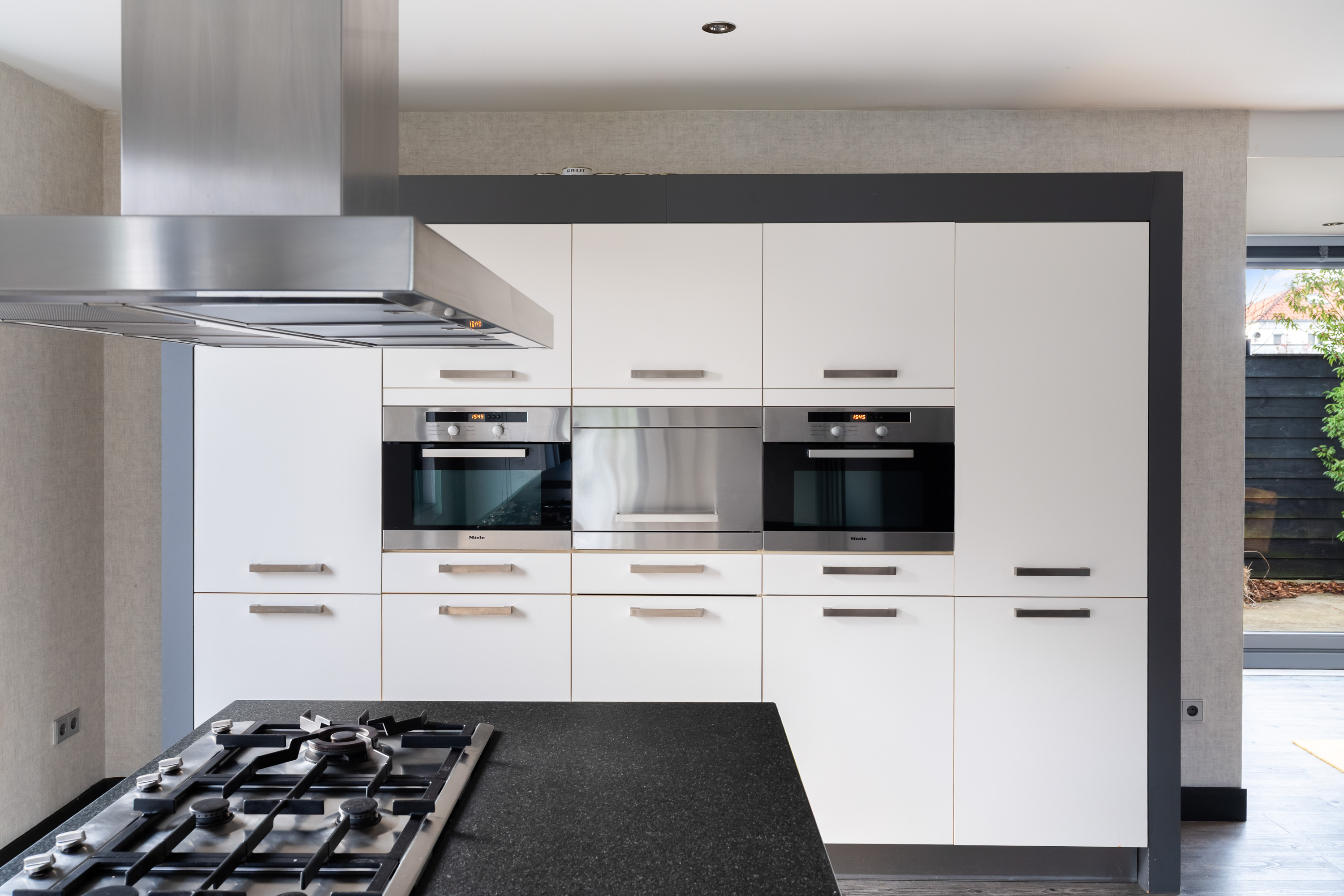 The luxurious open-plan kitchen forms the heart of the home. The large cooking and seating island with a unique worktop invites you to enjoy extensive cooking, cosy breakfasts and long evenings of dining together. The kitchen is equipped with high-end Miele built-in appliances, including two combi ovens, a steam oven, a 5-burner gas hob with wok burner, a dishwasher and two fridge-freezer combinations.