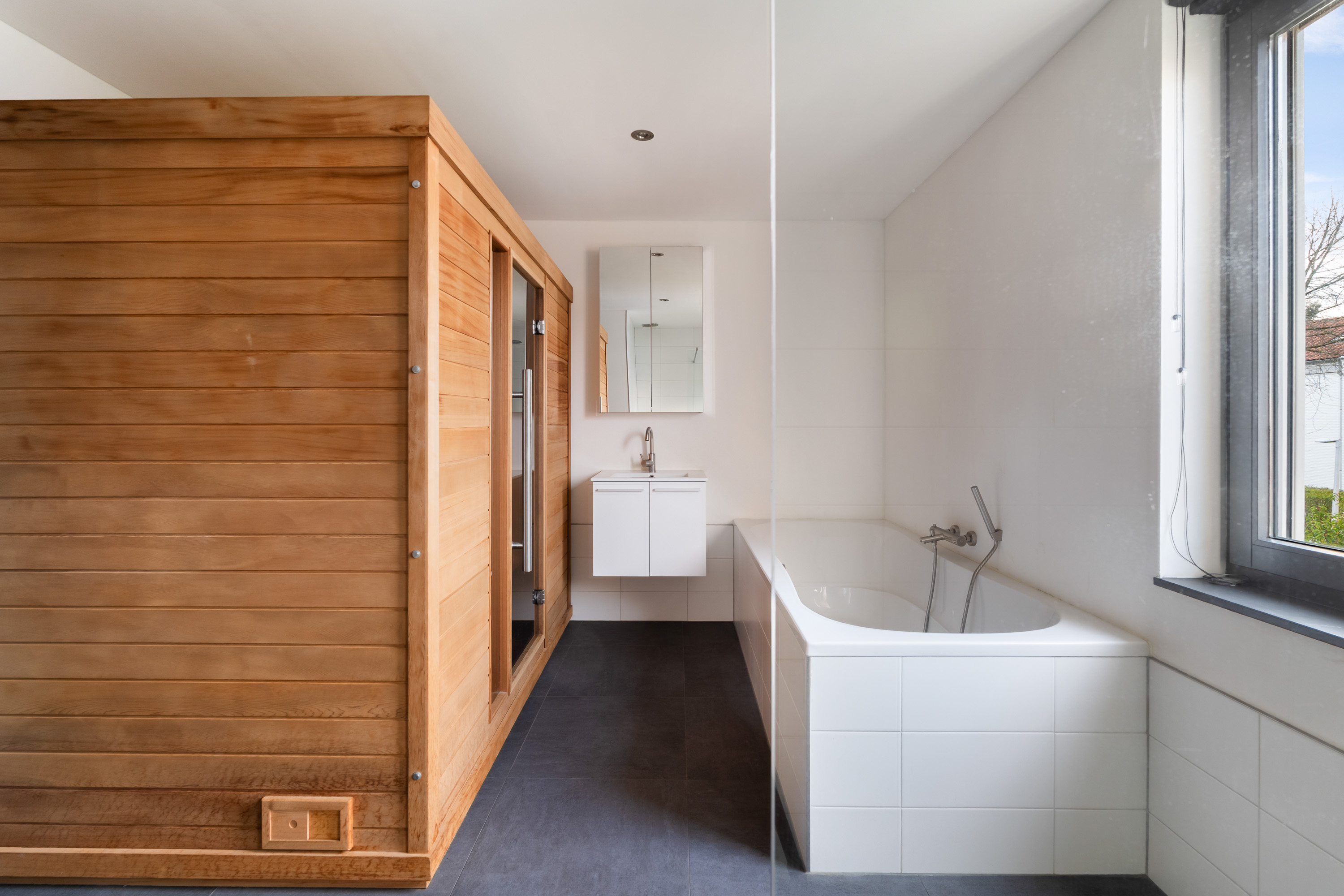 Bathroom with bathtub, rain shower and Finnish sauna with infrared