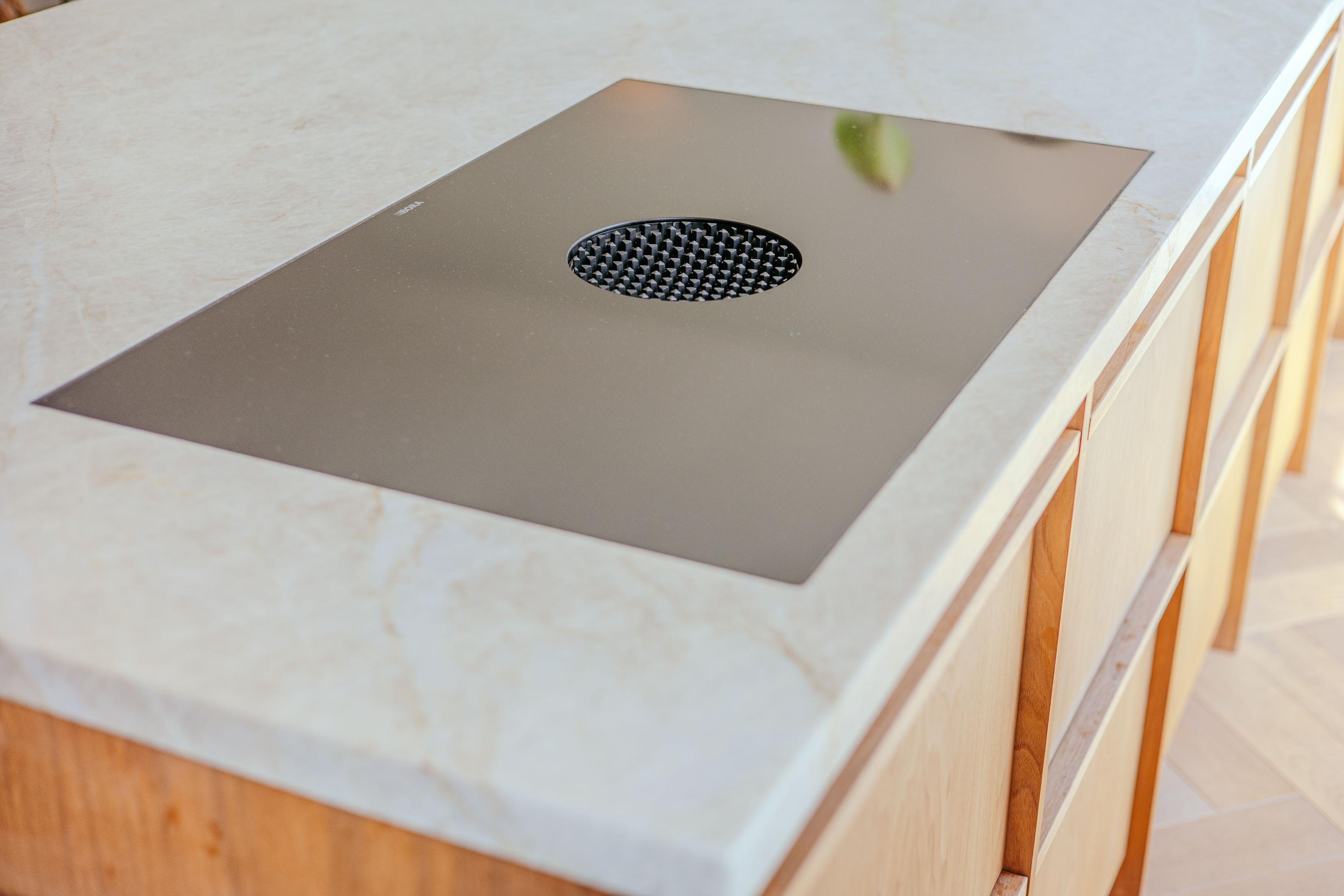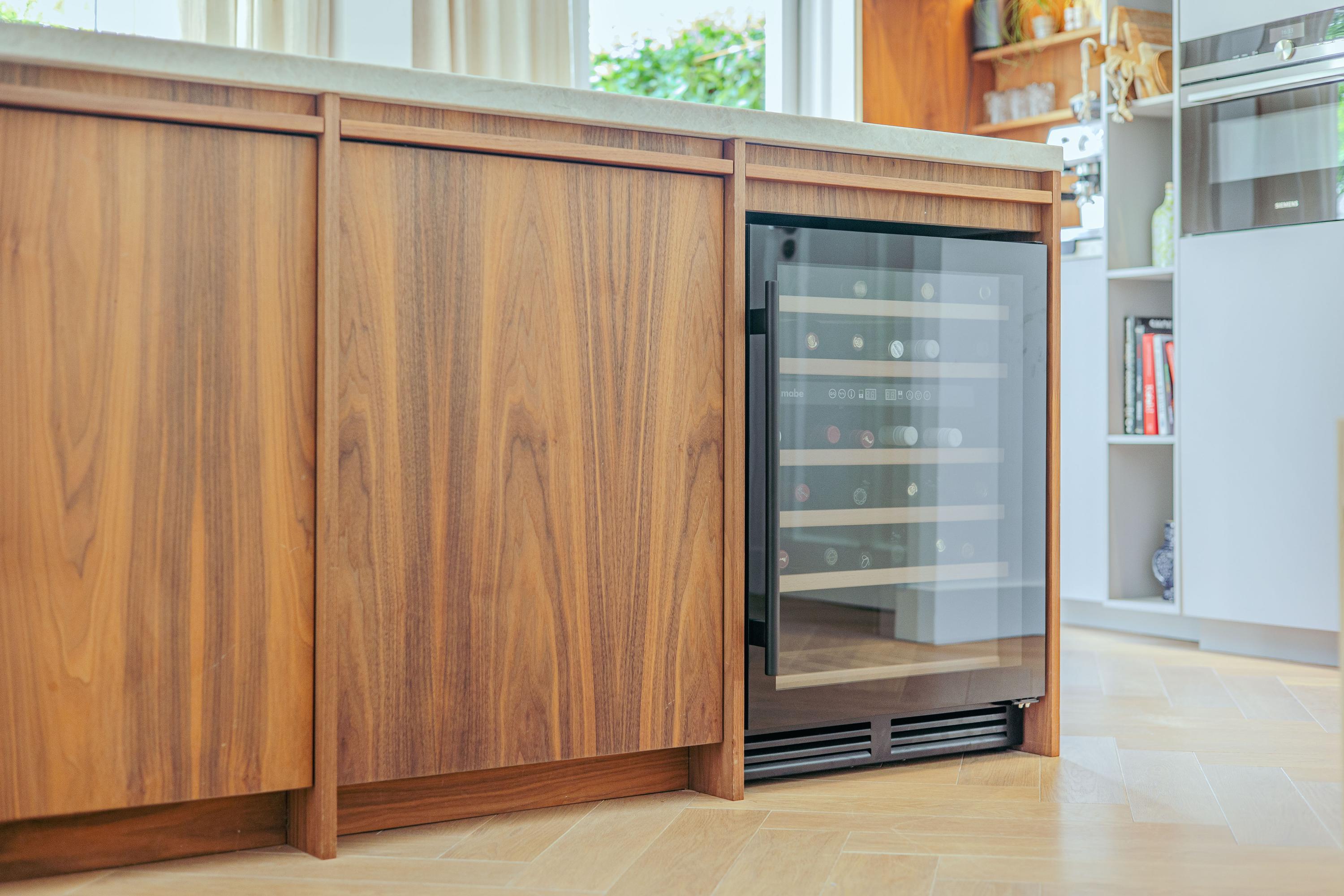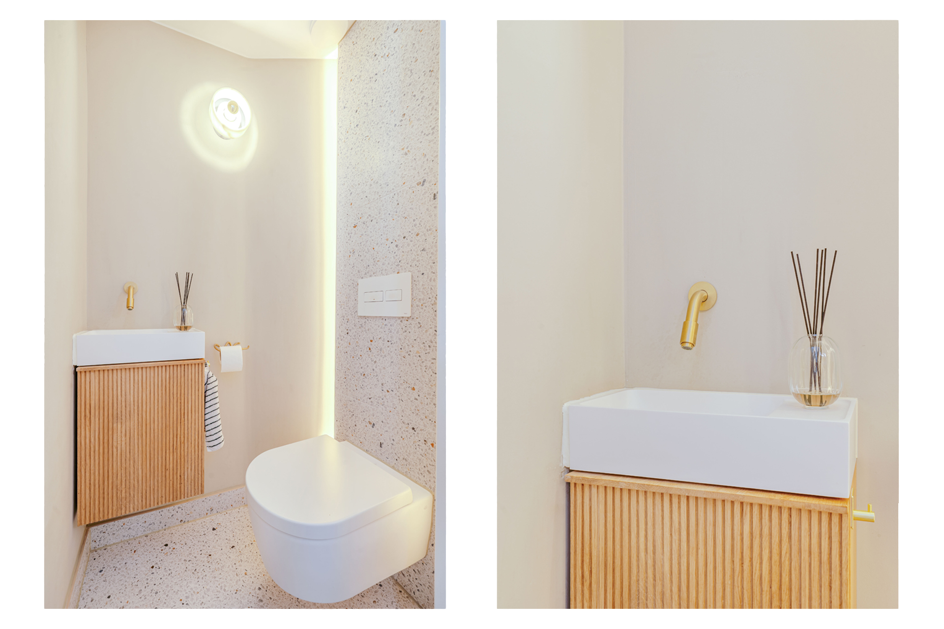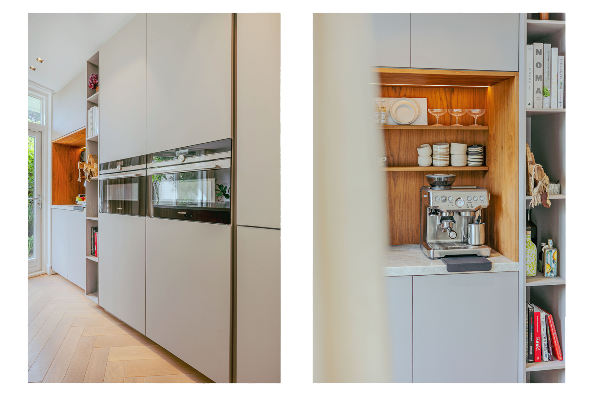 Through the well-kept front garden you reach the entrance of the house. The hallway features a practical storage cupboard under the stairs and a separate toilet with washbasin. From here you have access to the bright living room and the spacious open-plan kitchen at the rear. The property was fully renovated in 2021 and fitted with an oak herringbone floor with underfloor heating. The luxurious kitchen is designed with a central cooking island and high-quality built-in appliances, including a Bora induction hob with integrated extractor, Quooker tap, sink, climate-controlled wine cabinet, two combination ovens (one with steam function), fridge, freezer and dishwasher. The natural stone countertop made of Taj Mahal quartzite gives the kitchen a refined look. Thanks to the large windows and the glass door to the garden, this floor benefits from plenty of natural light. The rear garden (41 m², south-facing) was designed and landscaped in 2022 by a professional garden architect, and is equipped with lighting, irrigation, and a detached storage shed (approx. 6 m²) with electricity.