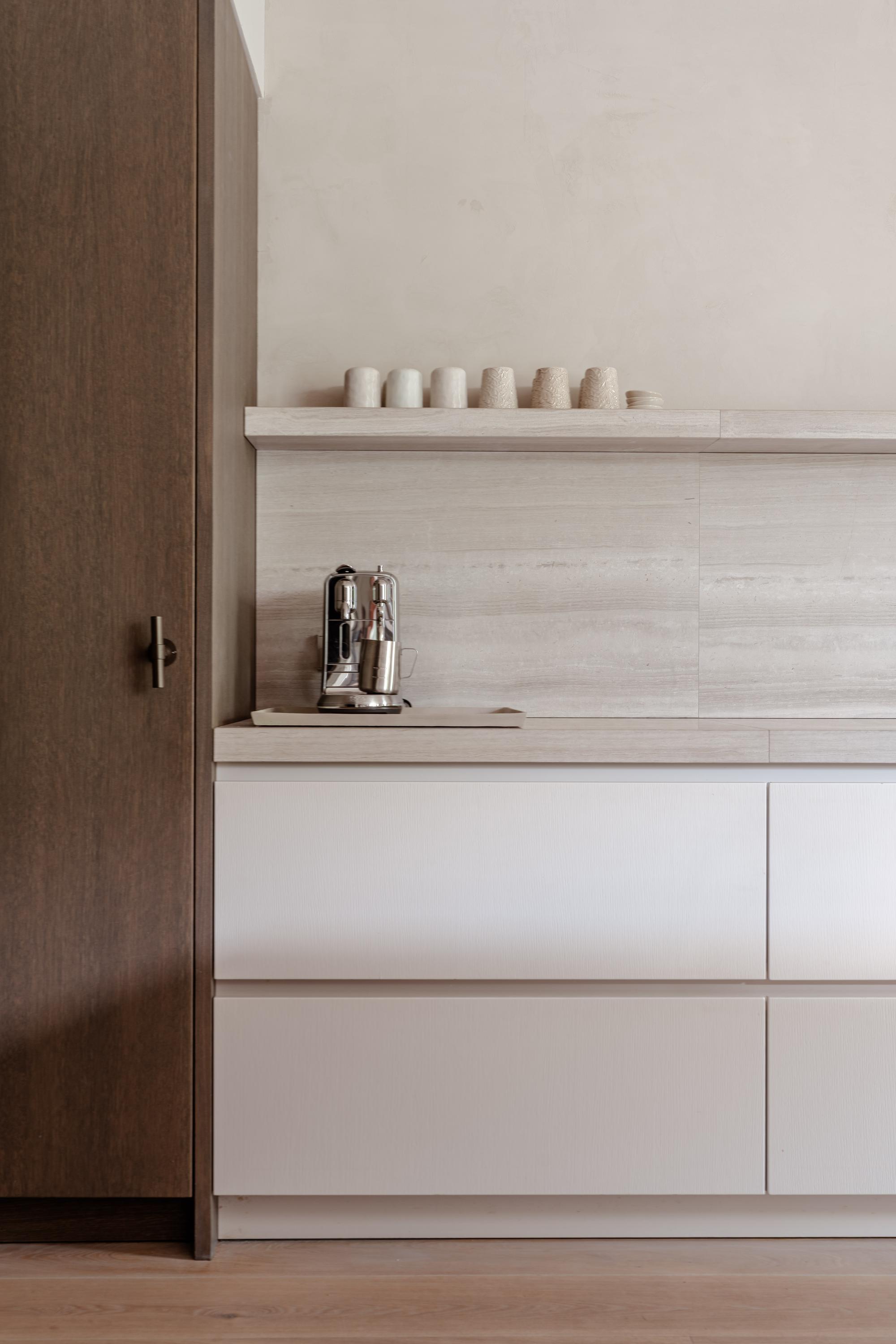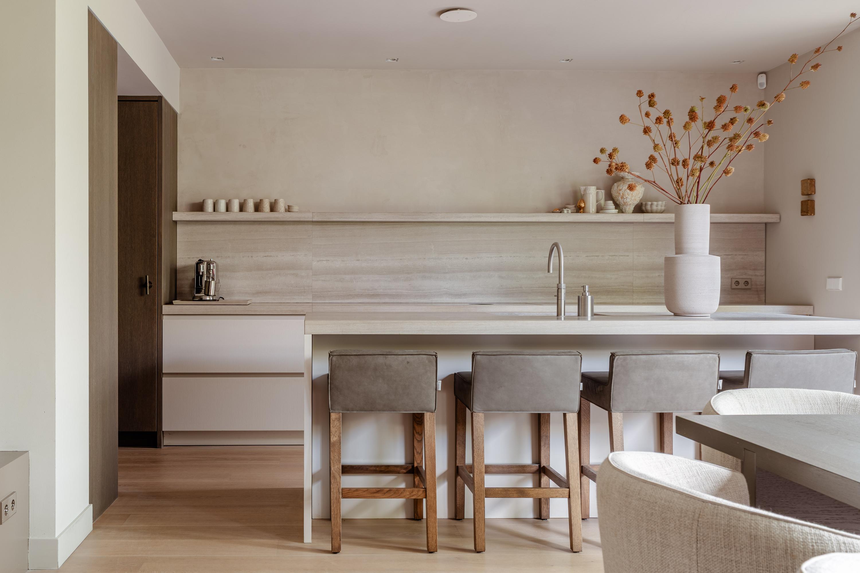 Adjacent to the living room is the dining area, with sliding doors opening directly onto the terrace. A custom Piet Boon wooden cabinet, including a Liebherr wine climate cabinet, makes this the perfect setting for extended dinners and intimate gatherings. The adjoining kitchen is a masterpiece of both design and functionality, anchored by a striking marble island. Outfitted with premium Miele appliances—including an oven, combi-oven/microwave, fridge-freezer, and a Quooker Cube (providing instant boiling, chilled, and sparkling water)—the kitchen is as practical as it is refined. The wall unit, with six wide soft-close drawers in light wood veneer, offers abundant storage while enhancing the serene design.
