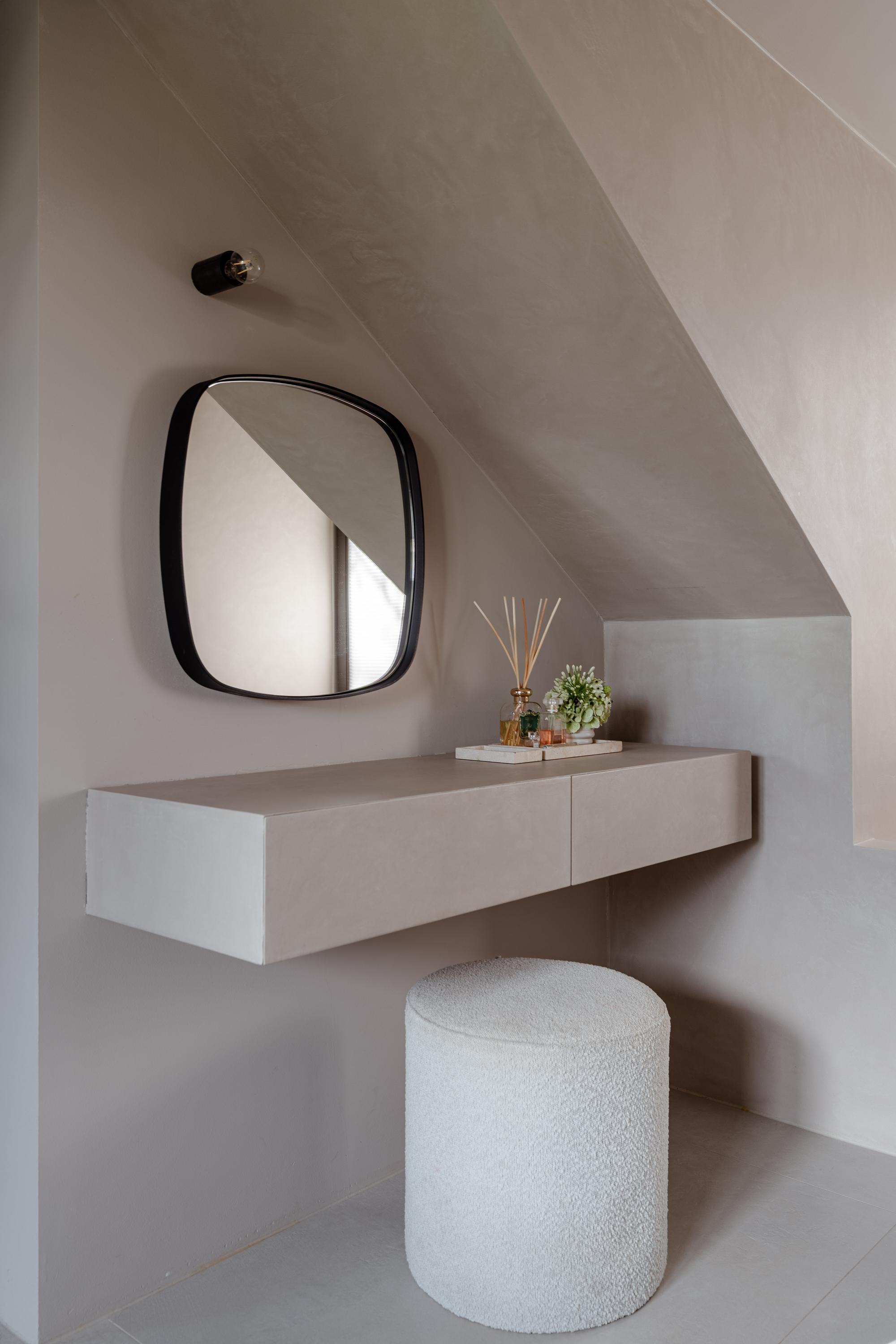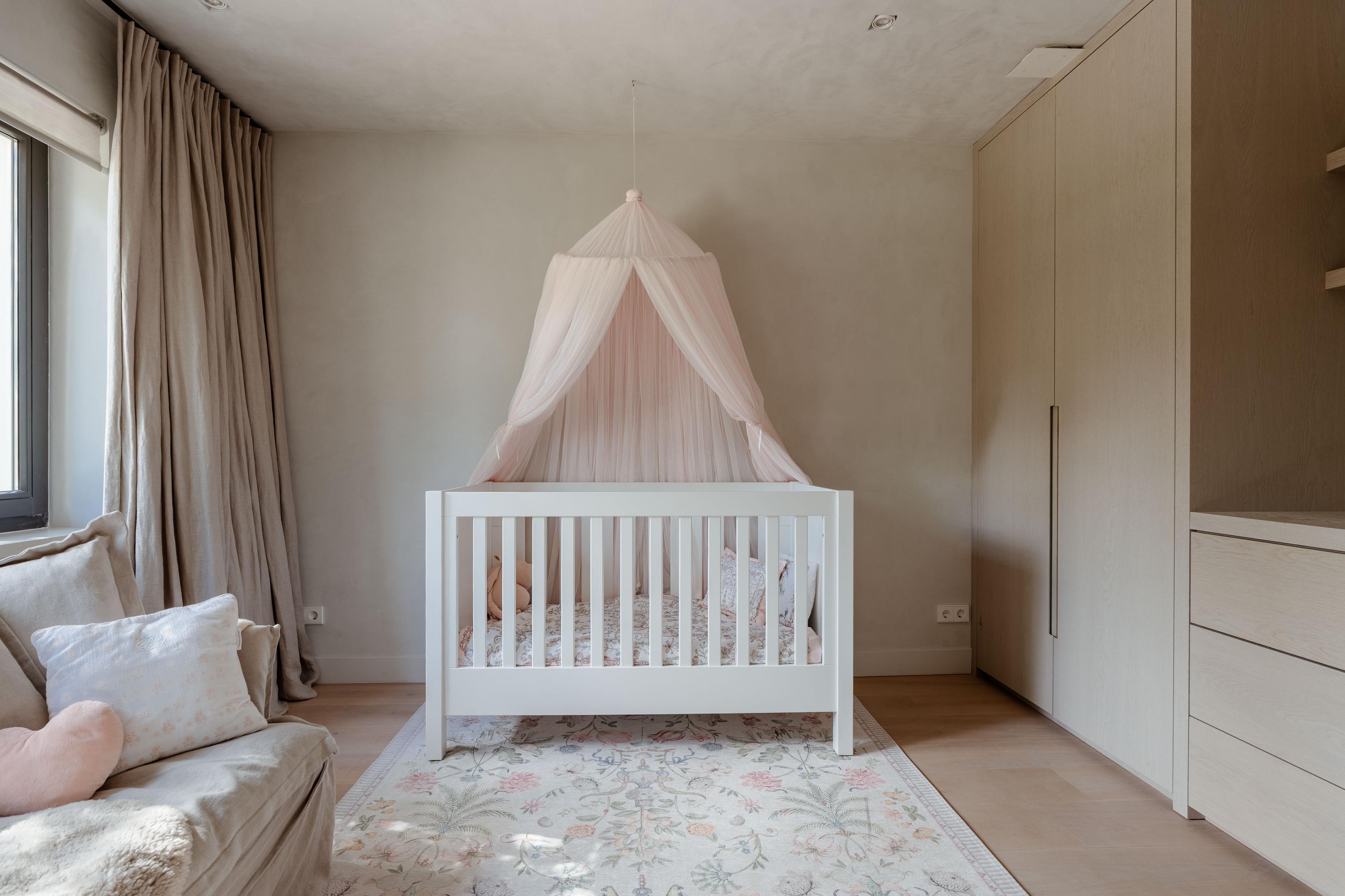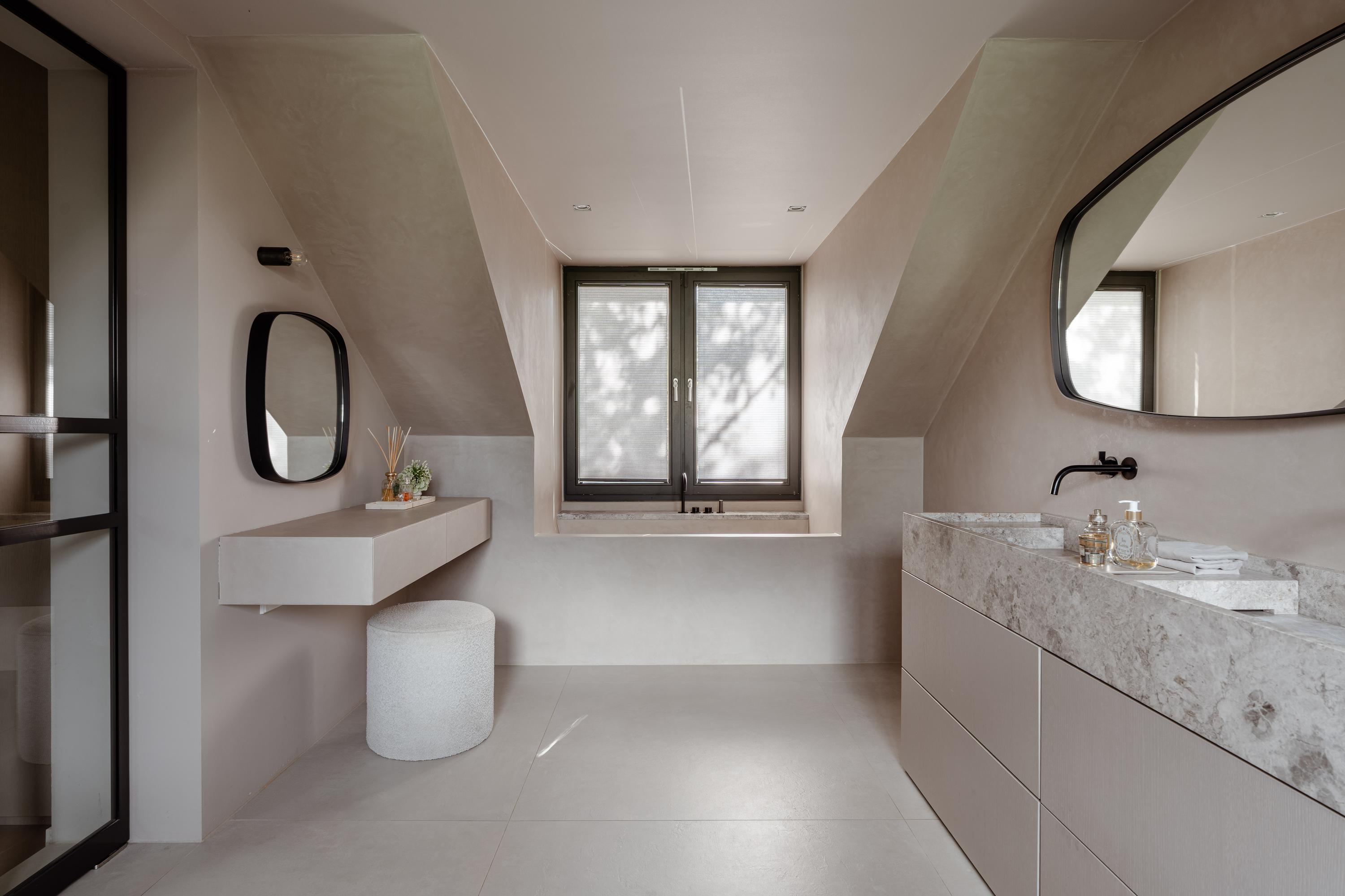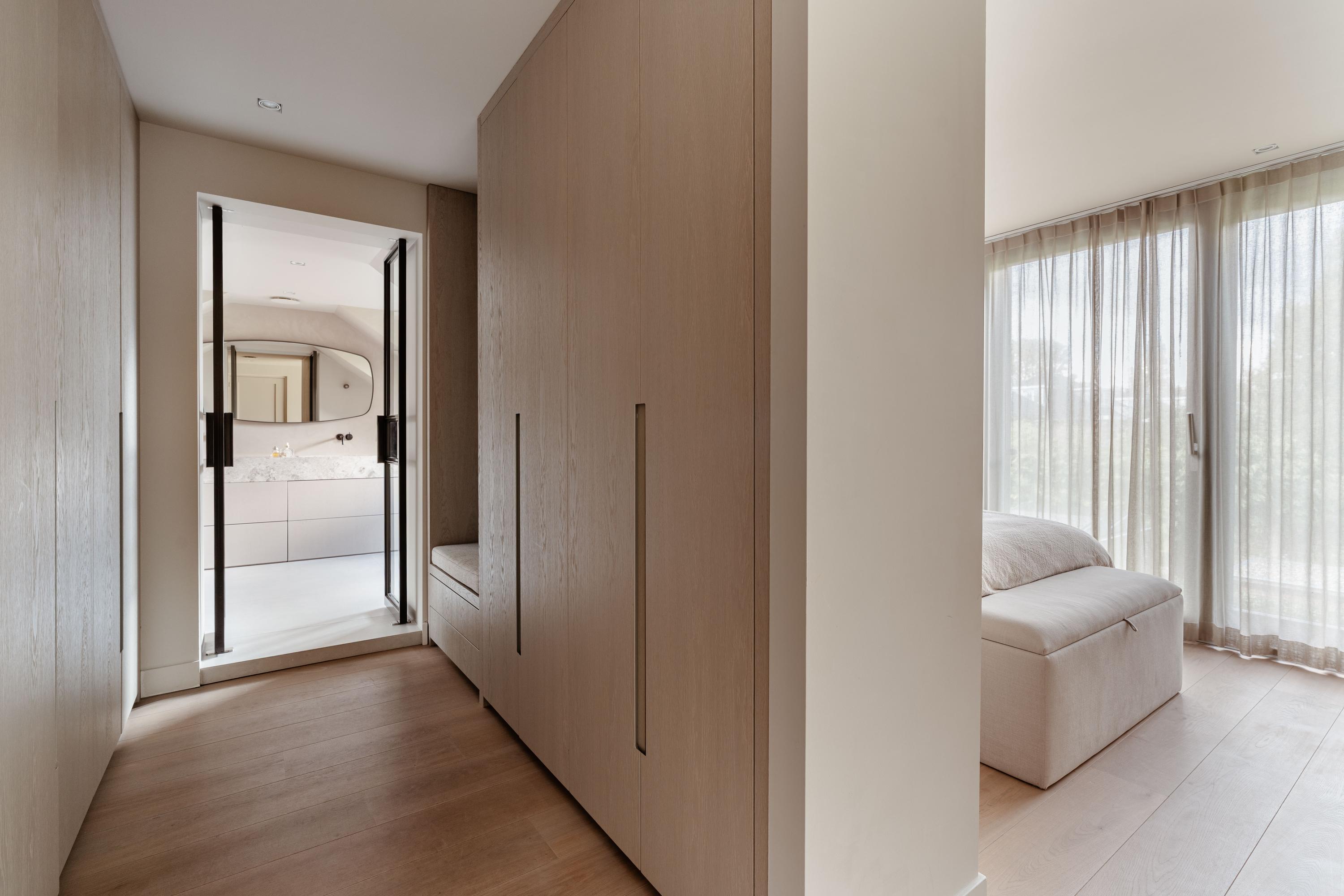 The top floor offers two further bedrooms, both with bespoke cabinetry. One of the rooms includes a specially designed built-in closet with a child-friendly layout. A third bathroom—again in Piet Boon design—features 120x120 cm tiles, built-in faucets, and a sleek vanity.