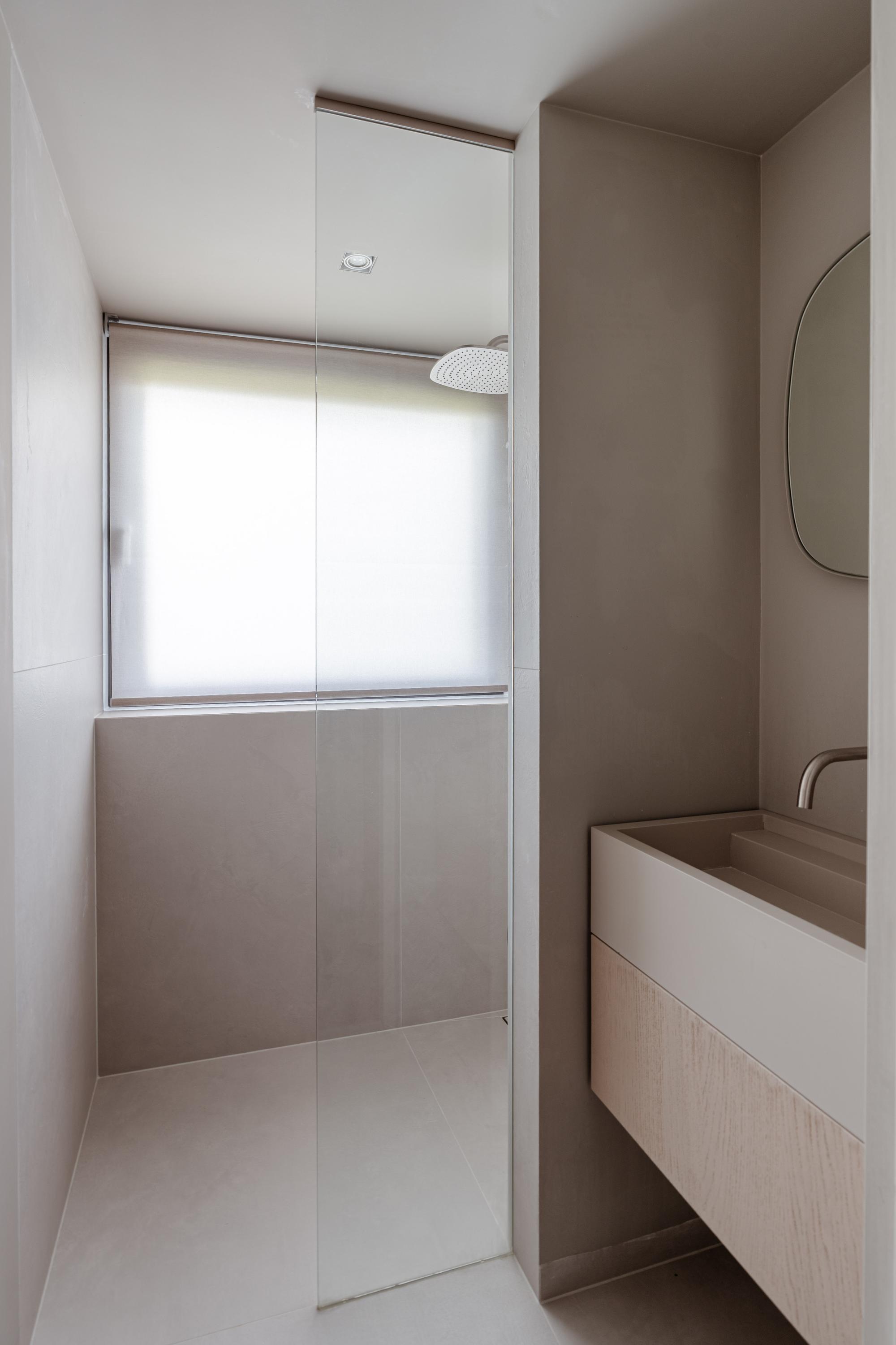 Also on this floor is a second bedroom with custom cabinetry and a second bathroom in the same premium style, featuring large-format tiles, built-in faucets, and a modern vanity.