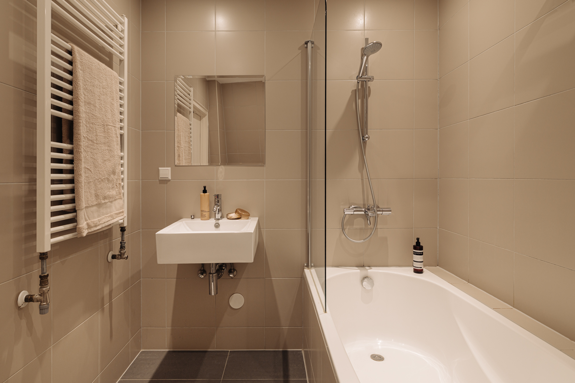 The second floor is fully dedicated to sleeping quarters and offers three well-proportioned bedrooms. The bedroom at the front features classical details and a charming mantelpiece, as do the other bedrooms. The bathroom on this level includes a bathtub, shower, vanity unit and toilet. At the rear, there is an additional room ideal as a dressing room, storage space, guest room or hobby room. The bathroom is practical and comfortable, with neutral tones, a bathtub with shower setup, vanity unit and radiator.