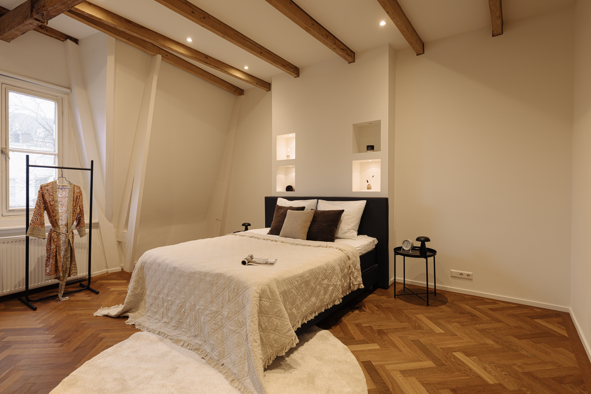 The first floor features two spacious and atmospheric bedrooms and a generous bathroom. The rear bedroom radiates tranquillity thanks to the high ceilings, herringbone floor, warm tones and a classical mantelpiece. Adjacent is a beautiful walk-in closet with custom-made cabinetry, open shelving and integrated lighting—a particularly comfortable and luxurious space to start the day.