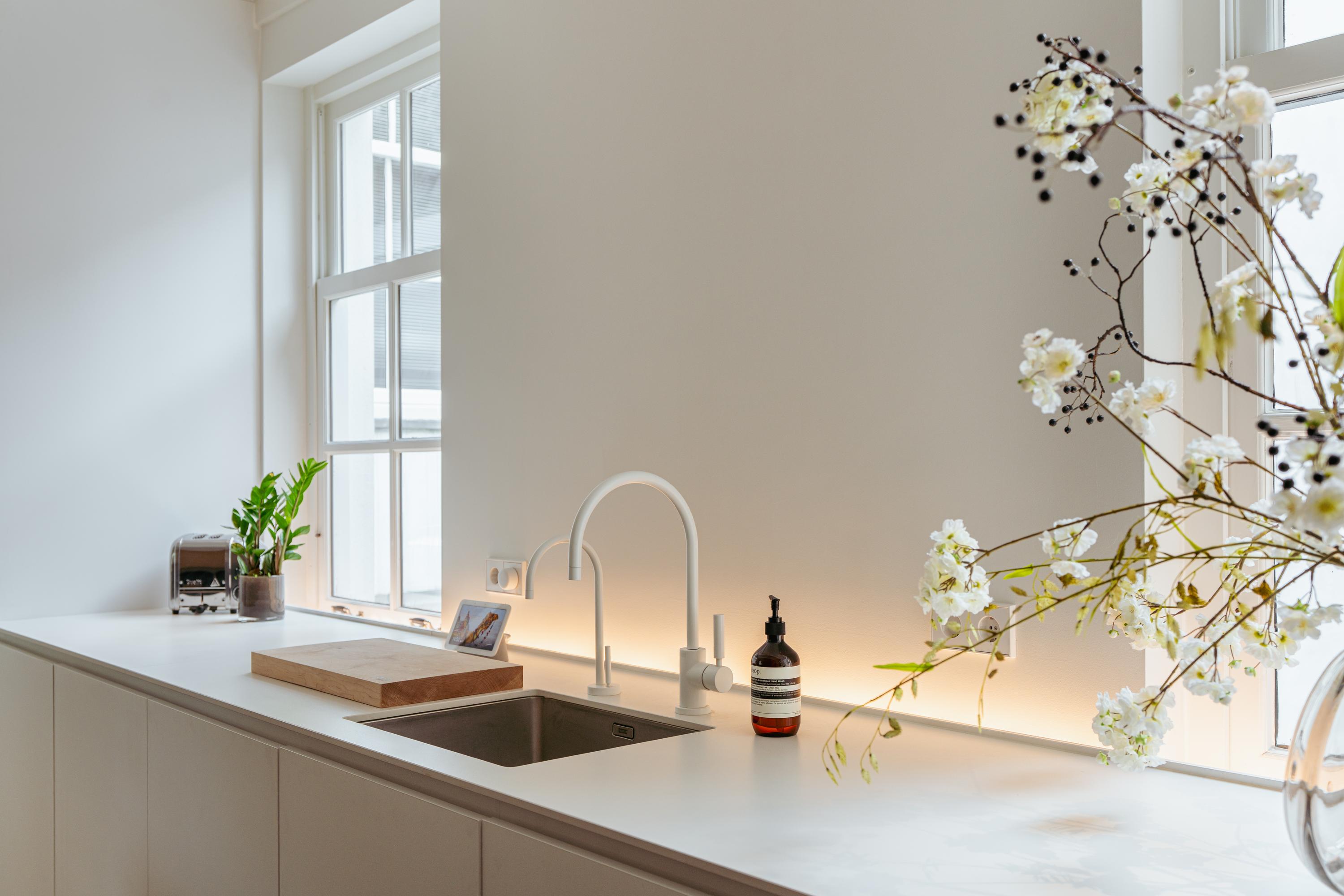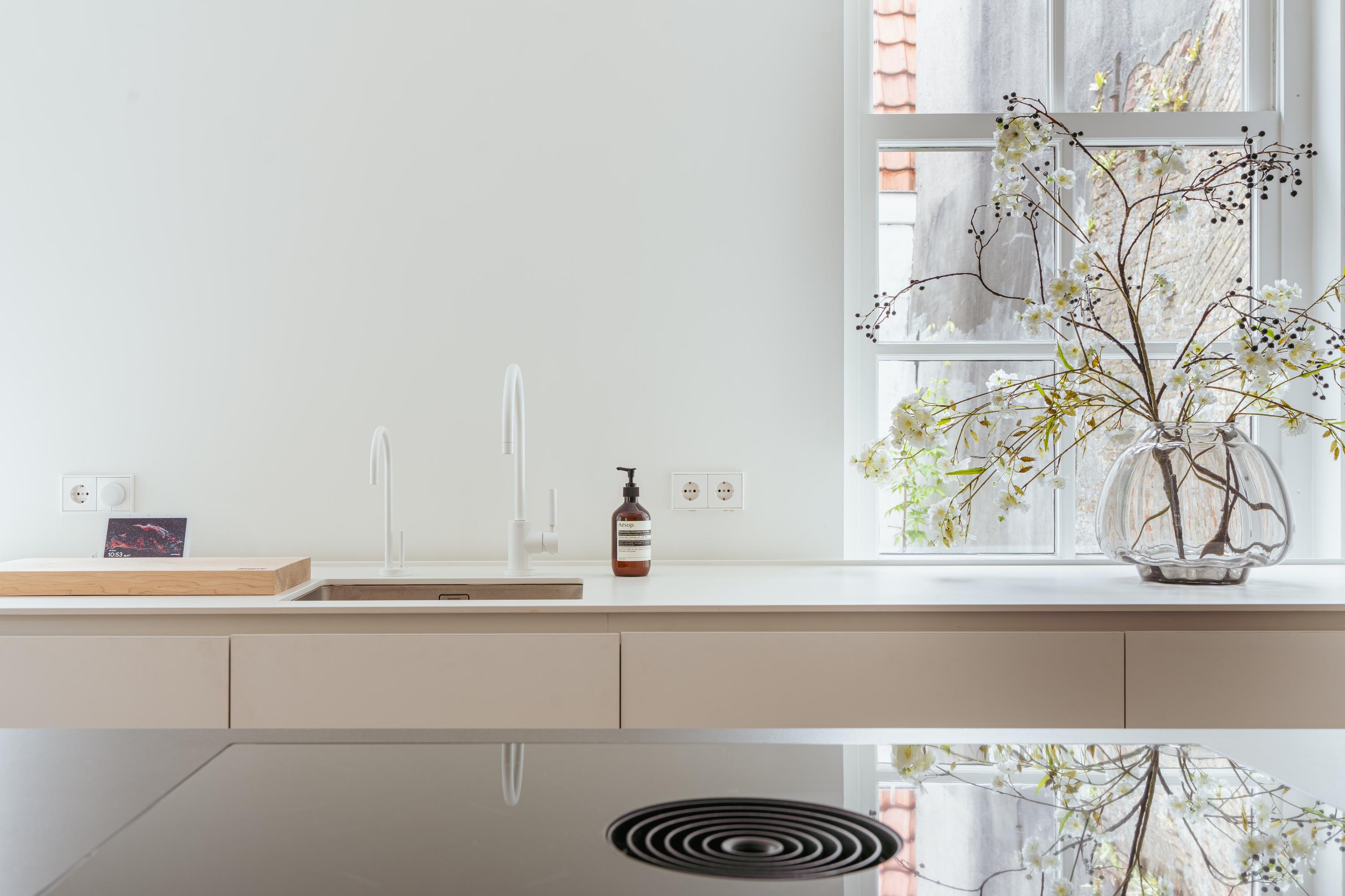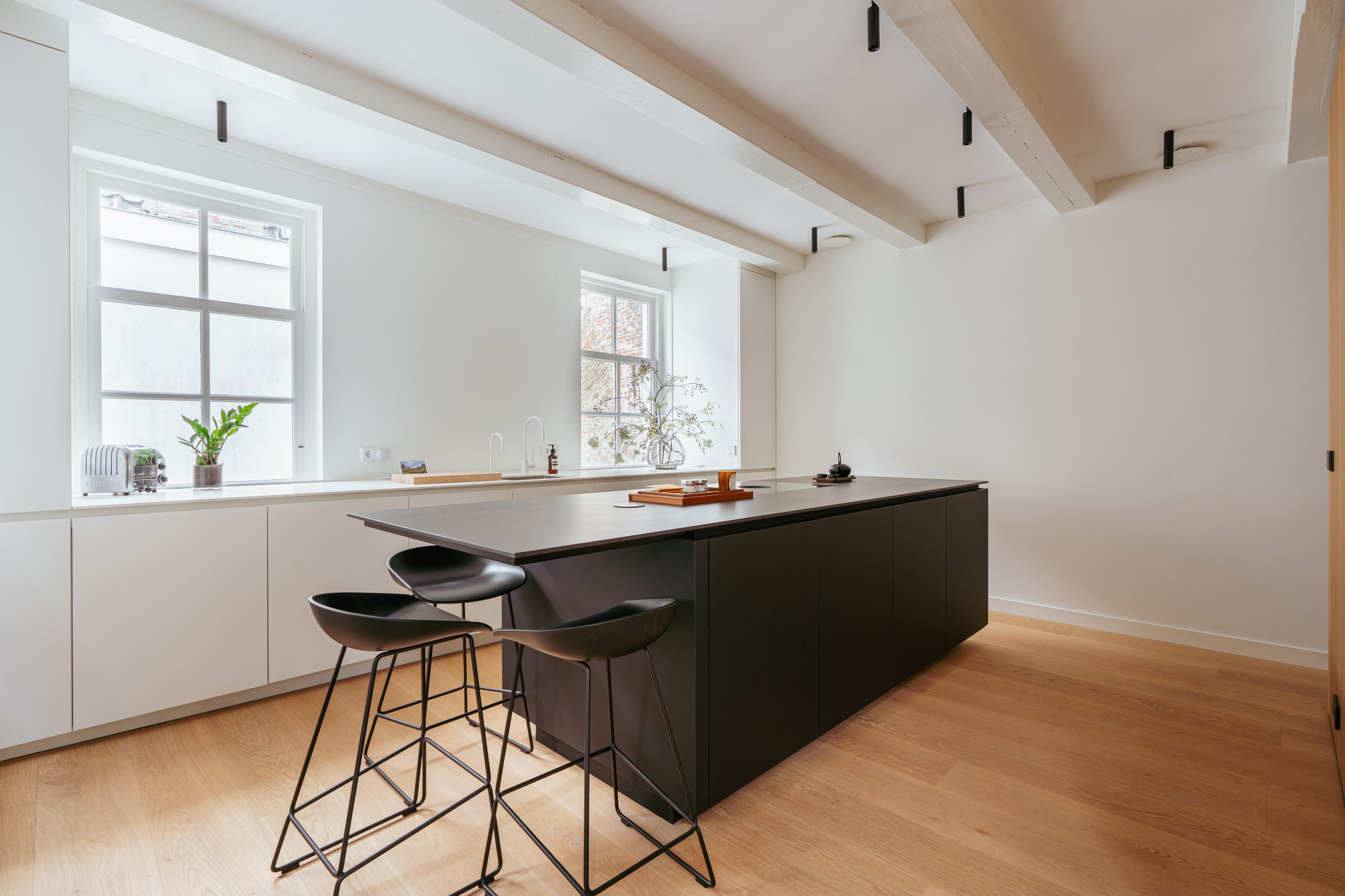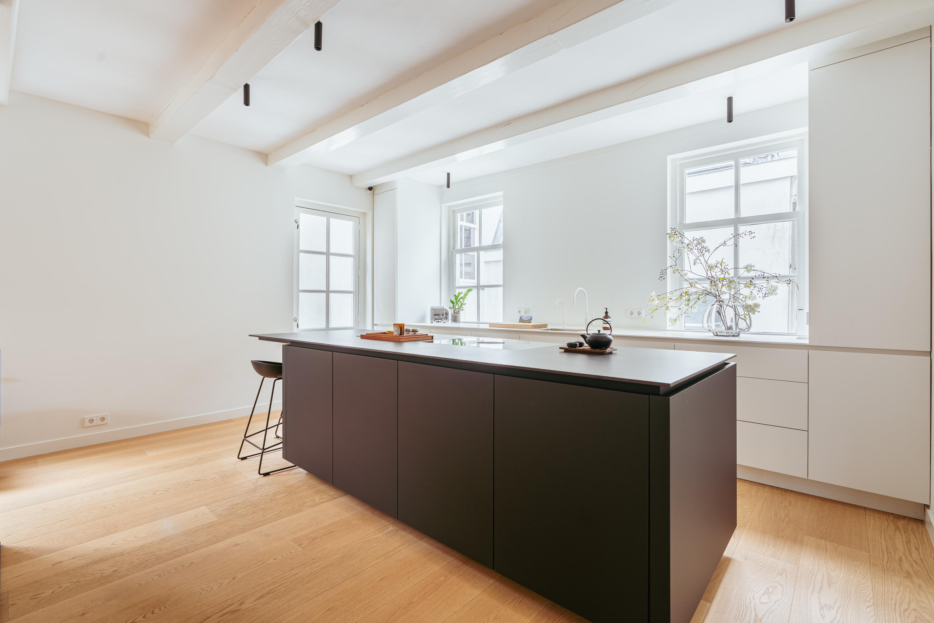 This floor is entirely dedicated to living and entertaining. At the rear is the modern kitchen — the heart of the home. It includes high-end built-in appliances: fridge, freezer, combi oven and microwave, Quooker tap, and a sleek induction cooktop with integrated extractor fan. Ample storage keeps the space minimalist and tidy. The centrally placed island includes a bar area for informal dining. At the front is the living area, where large windows offer a sweeping view over the canal. The combination of natural light, warm wooden floors, and subtle finishes create a calm, inviting ambiance. French doors open to a hallway with a separate toilet, and a staircase leads to the third floor.