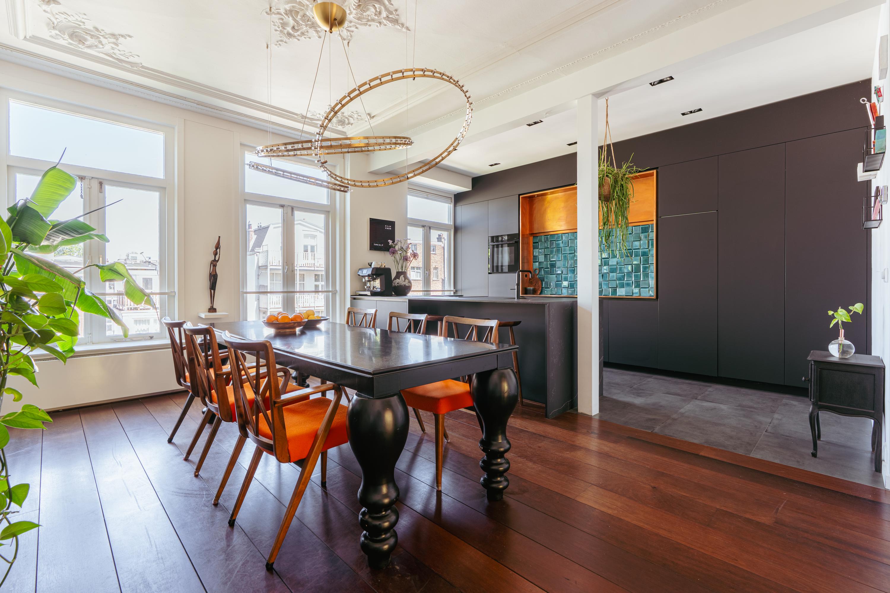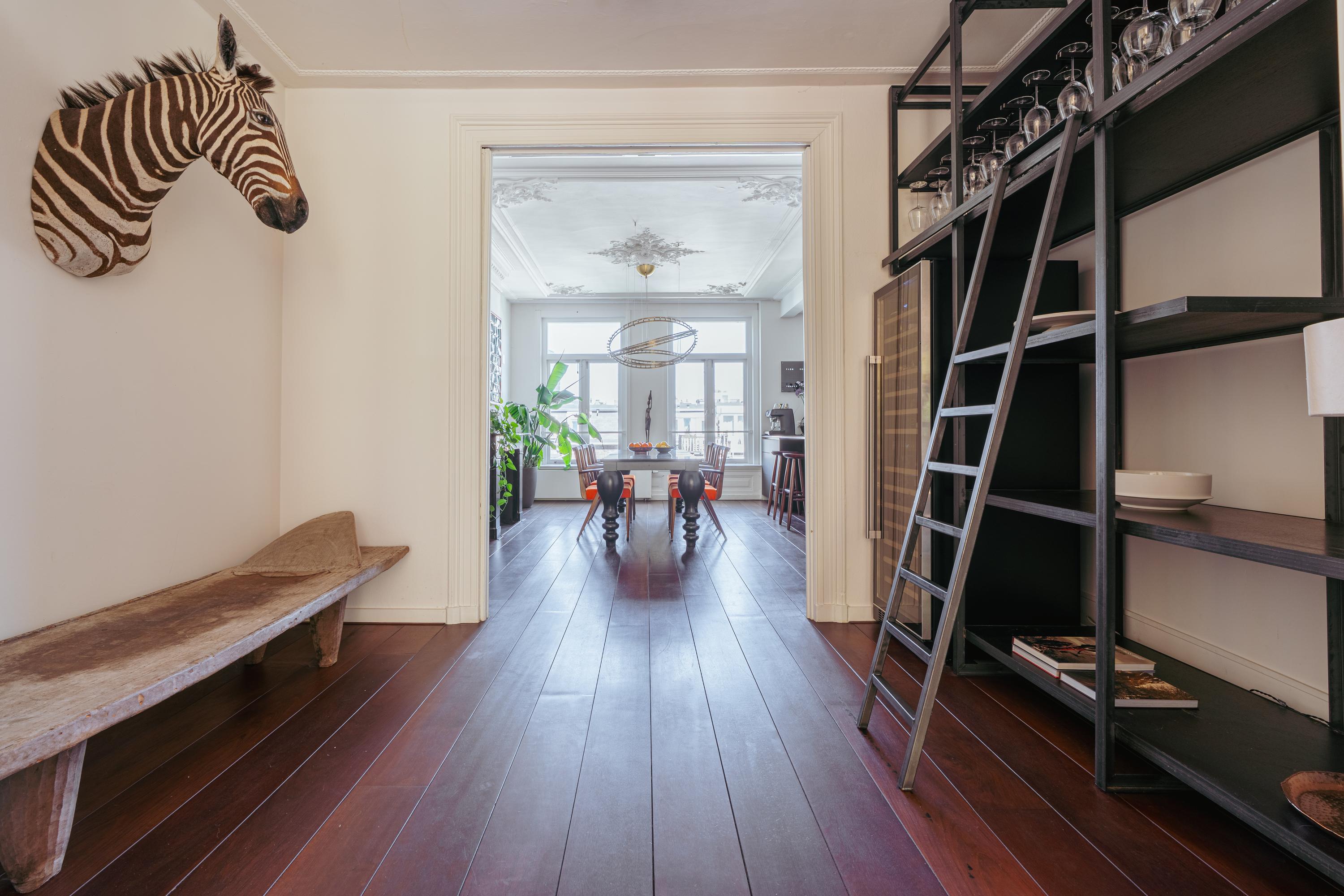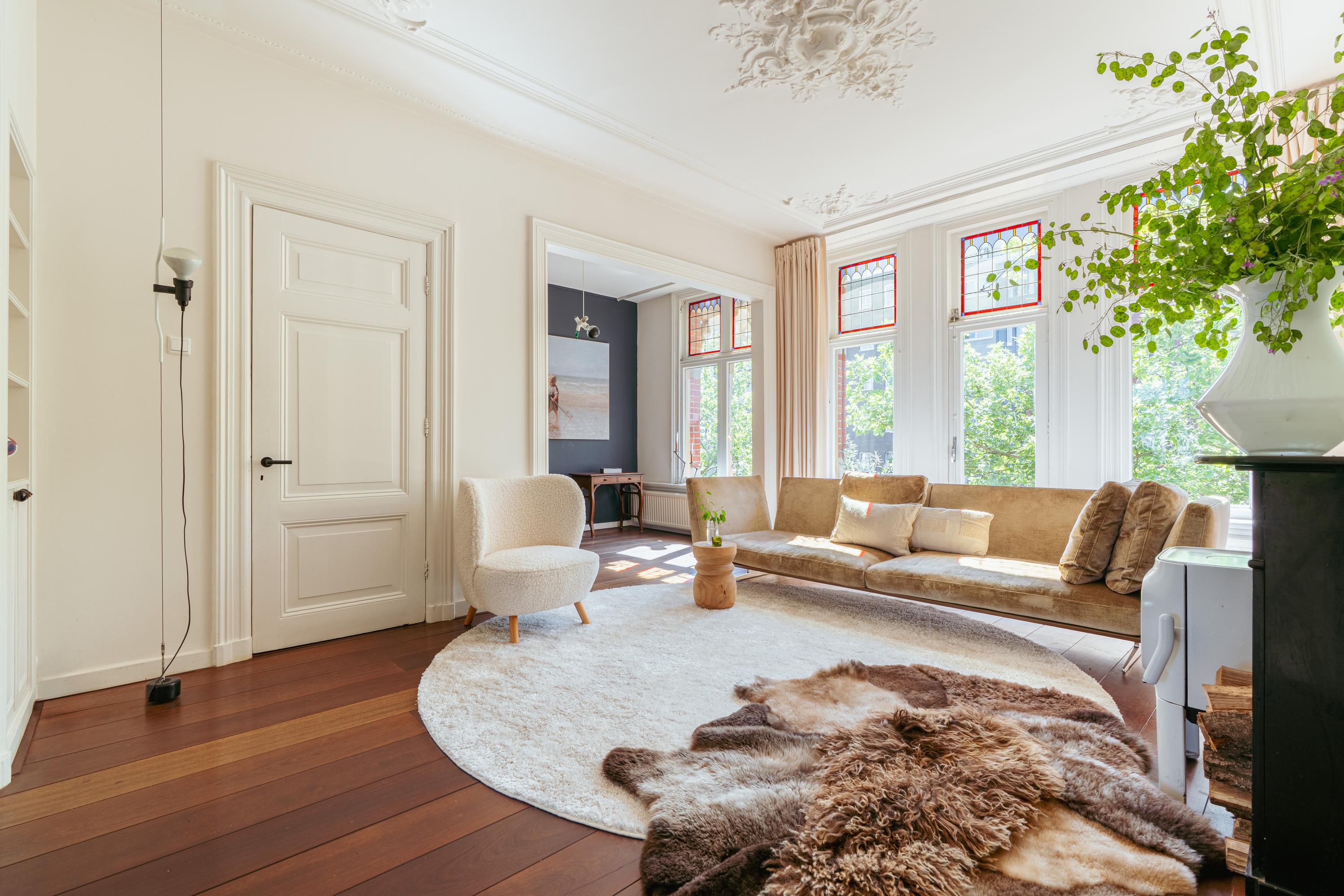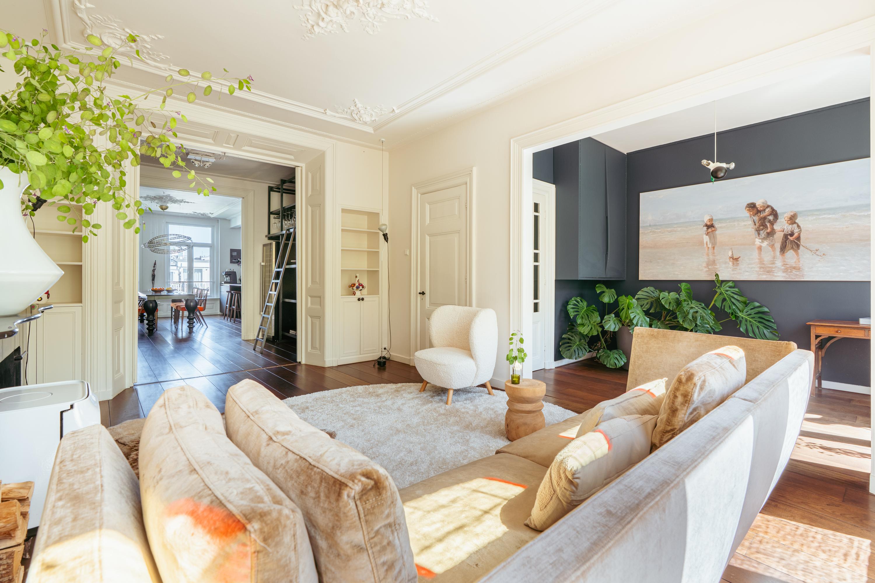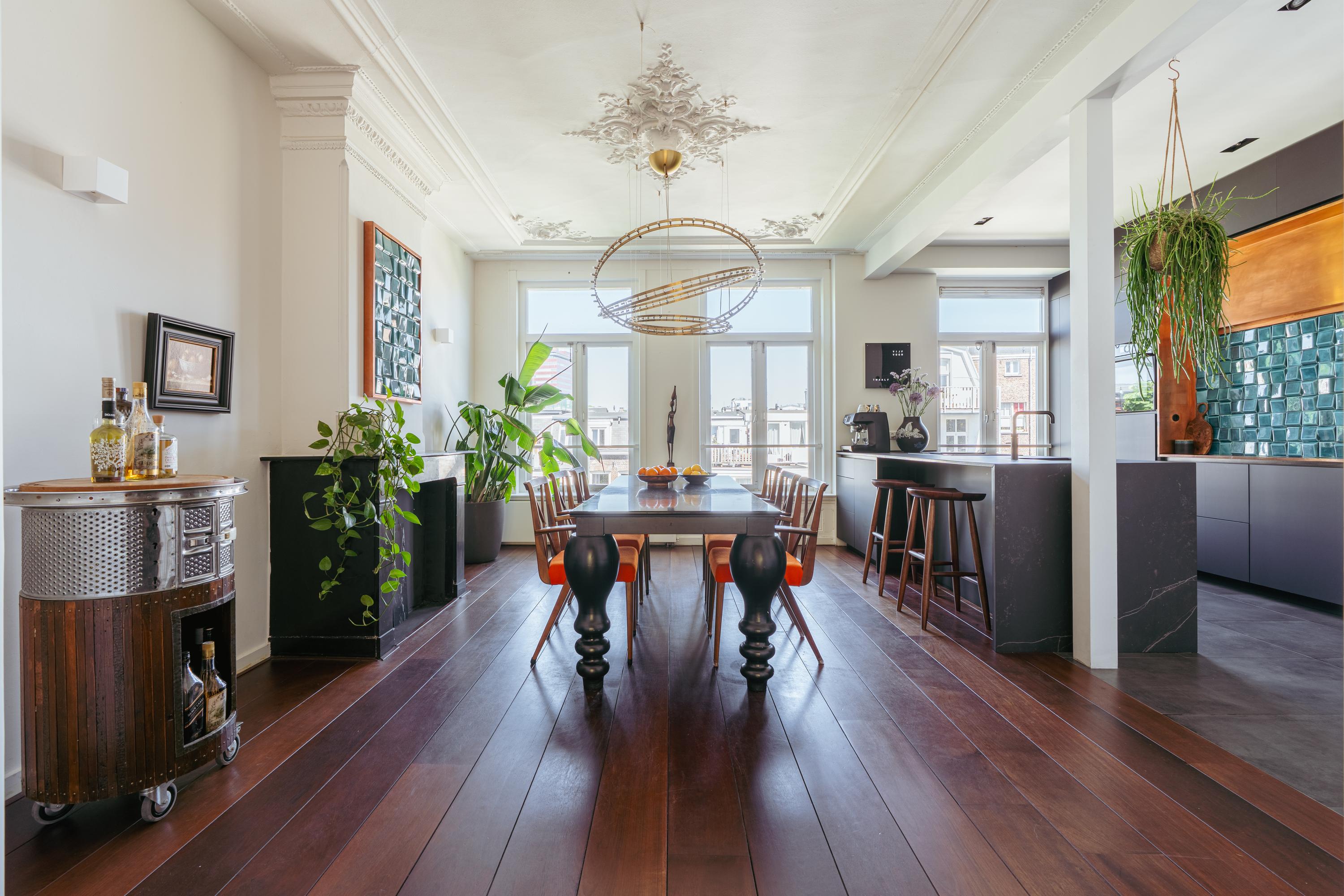 Elegant and very spacious apartment (approx. 241 m²) across the top three floors of a magnificent national monument on the Ceintuurbaan! This exceptionally spacious residence spans the top three floors of a beautifully preserved Rijksmonument and features a generous open-plan living area with wood-burning stove, four bedrooms, two bathrooms, and a wonderfully sunny south-facing balcony. Enjoy stunning views towards the Amstel River and the added benefit of owning freehold property—no leasehold involved.