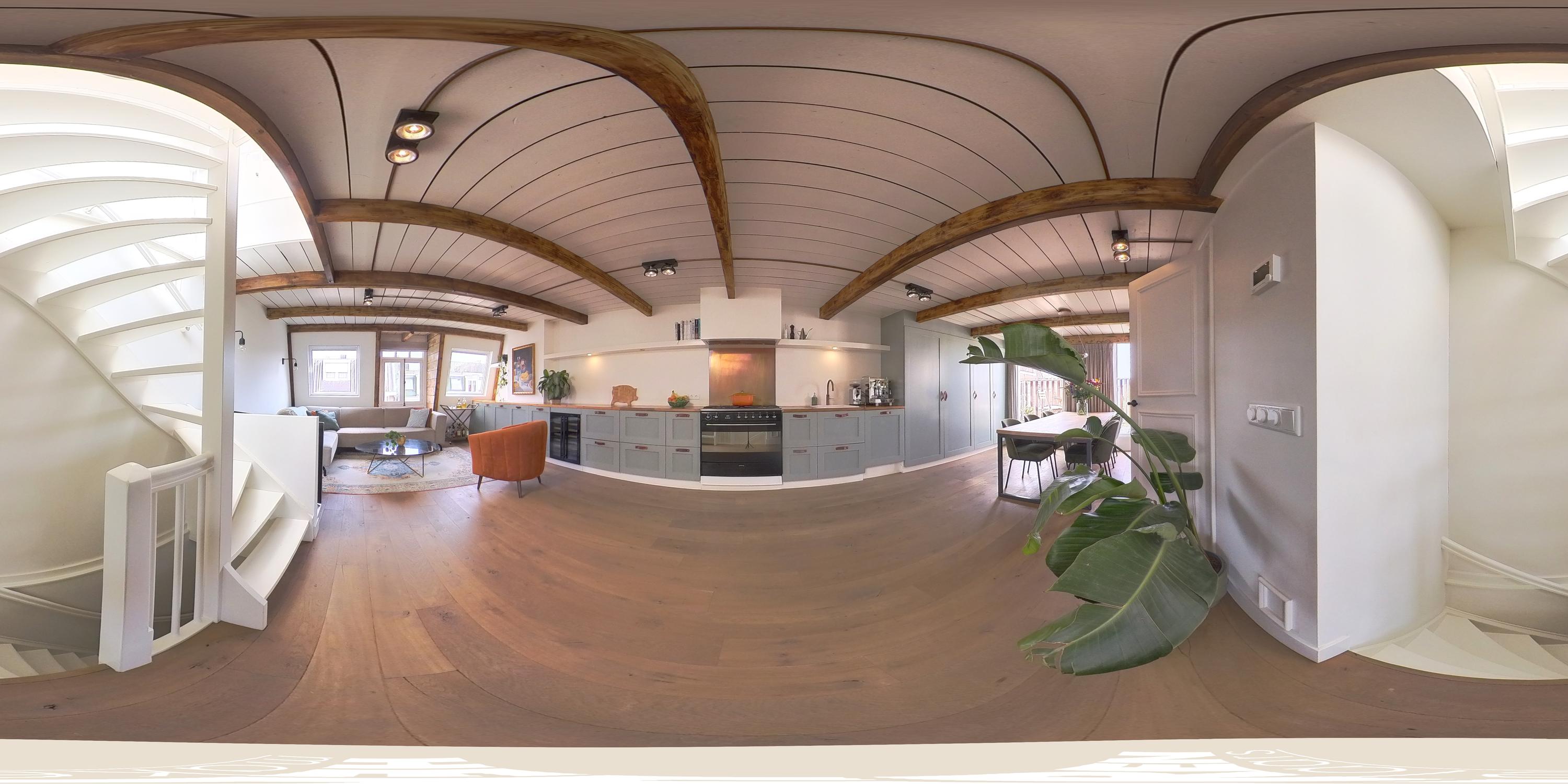 The living floor, situated on the fourth level, features a spacious and bright living room with an open-plan kitchen. The space is characterized by charming wooden beams, adding warmth and character. Large windows at both the front and rear, combined with natural light from the rooftop terrace, ensure a pleasant flow of daylight throughout the day. The open kitchen spans the full width of the wall and offers ample storage space. It is equipped with a six-burner gas stove, extractor hood, oven, dishwasher, sink with Quooker, refrigerator, freezer, and a wine climate cabinet. This floor also includes a separate toilet with double doors. From the living room, there is direct access to the west-facing balcony at the rear. A fixed staircase leads to the stunning rooftop terrace. This generous outdoor space offers complete privacy and enjoys 360-degree sun exposure, making it the perfect place to relax throughout the day. With ample room for multiple seating and lounge areas, the terrace is a true highlight of the property.