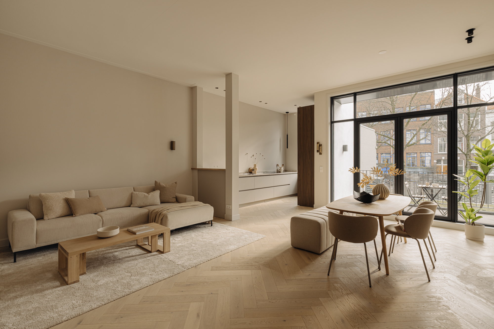 A luxury, 182-m² double ground-floor apartment with four bedrooms, two bathrooms, a balcony, terrace, internal storage space and a front and back entrance. The apartment features carefully selected, high-end materials that create a sense of warmth and comfort. Luxury herringbone floors, high ceilings, subtle tones in the kitchen and bathrooms and a well-thought-out lighting plan create a harmonious and inviting ambiance. The kitchen, with its clean lines and ample storage space, is a perfect combination of style and practical functionality. The building itself is a freehold property.