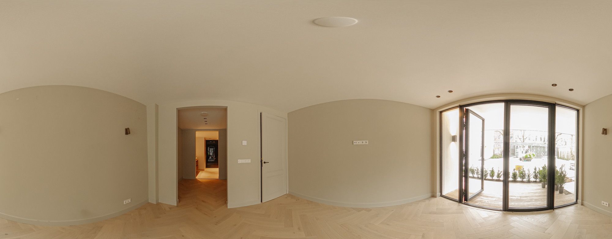 The apartment’s front door opens into a hall that is centrally located and gives access to all the rooms on this floor, including a separate toilet room and a storage room. There is a large, bright living room and an open-plan kitchen of Italian design at the front of this floor. The luxury kitchen is equipped with a comprehensive range of built-in appliances and balances style and functionality perfectly. The sophisticated combination of white units with marble worktops and large units with the warm shade of walnut give the space a beautiful, atmospheric feel. French doors open out onto the south-facing, recessed balcony. The first large bedroom is at the back of the apartment.