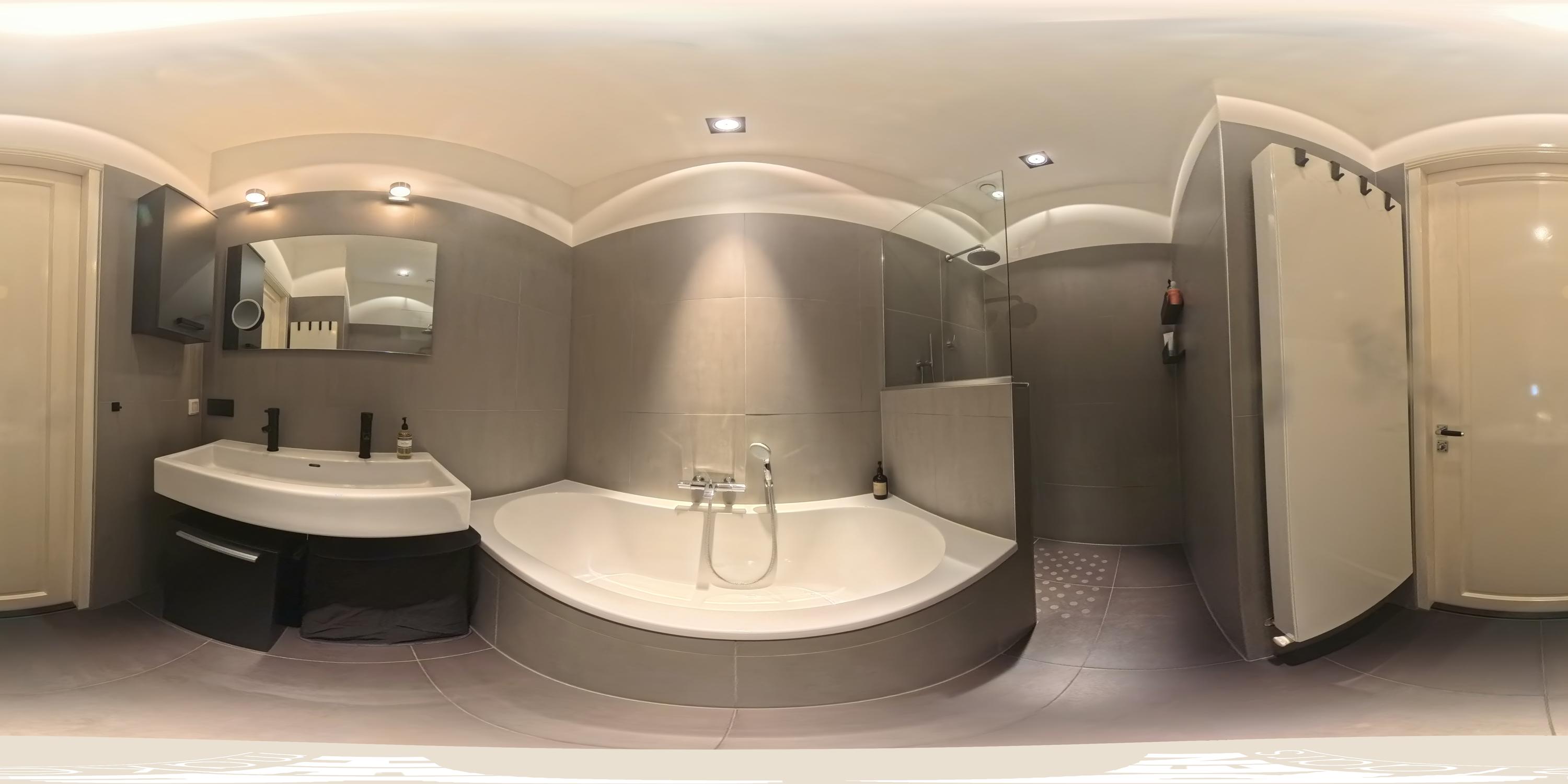 The layout presents a generous living space and an open kitchen equipped with a kitchen island, modern appliances including a 5 burner gas hob, combi oven, dishwasher, fridge freezer, additional freezer and Quooker. There are three bedrooms and a centrally located bathroom featuring a bathtub, double washbasin unit and walk in shower. High ceilings of approximately 3 meters throughout most rooms enhance the sense of space and openness.