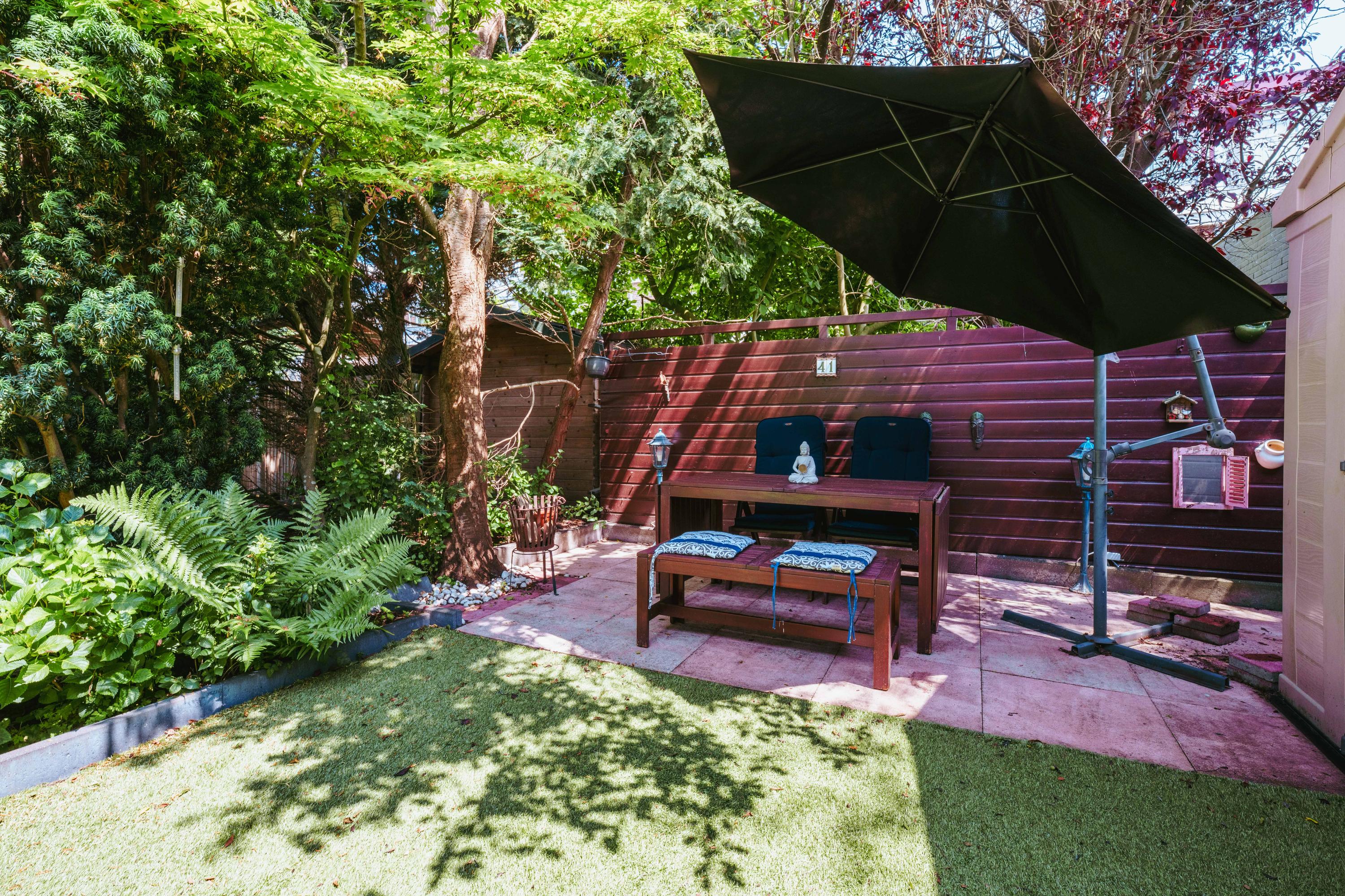 The living room opens to the gardens and is anchored by a gas fireplace, while the semi-open kitchen—fully equipped with modern appliances—extends to a utility space and a sunlit east-facing rear garden of approximately 51m². The ground floor arrangement encourages ease of gathering and daily rhythm. Upstairs, four double bedrooms are arranged around a central bathroom, and the top floor offers two more generous bedrooms and a second bathroom with double rain shower. Both floors provide flexibility for evolving family needs or discreet guest accommodation.