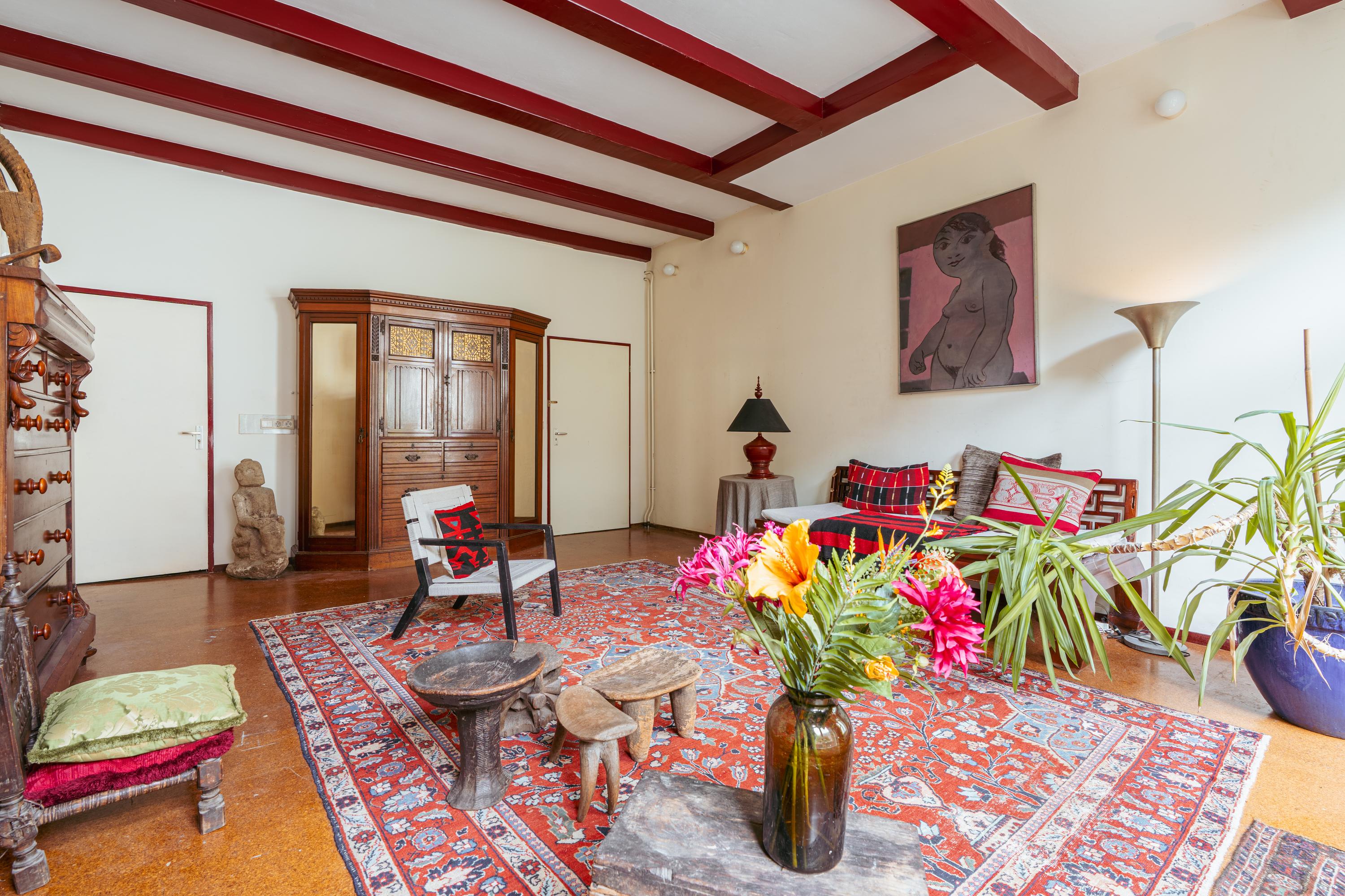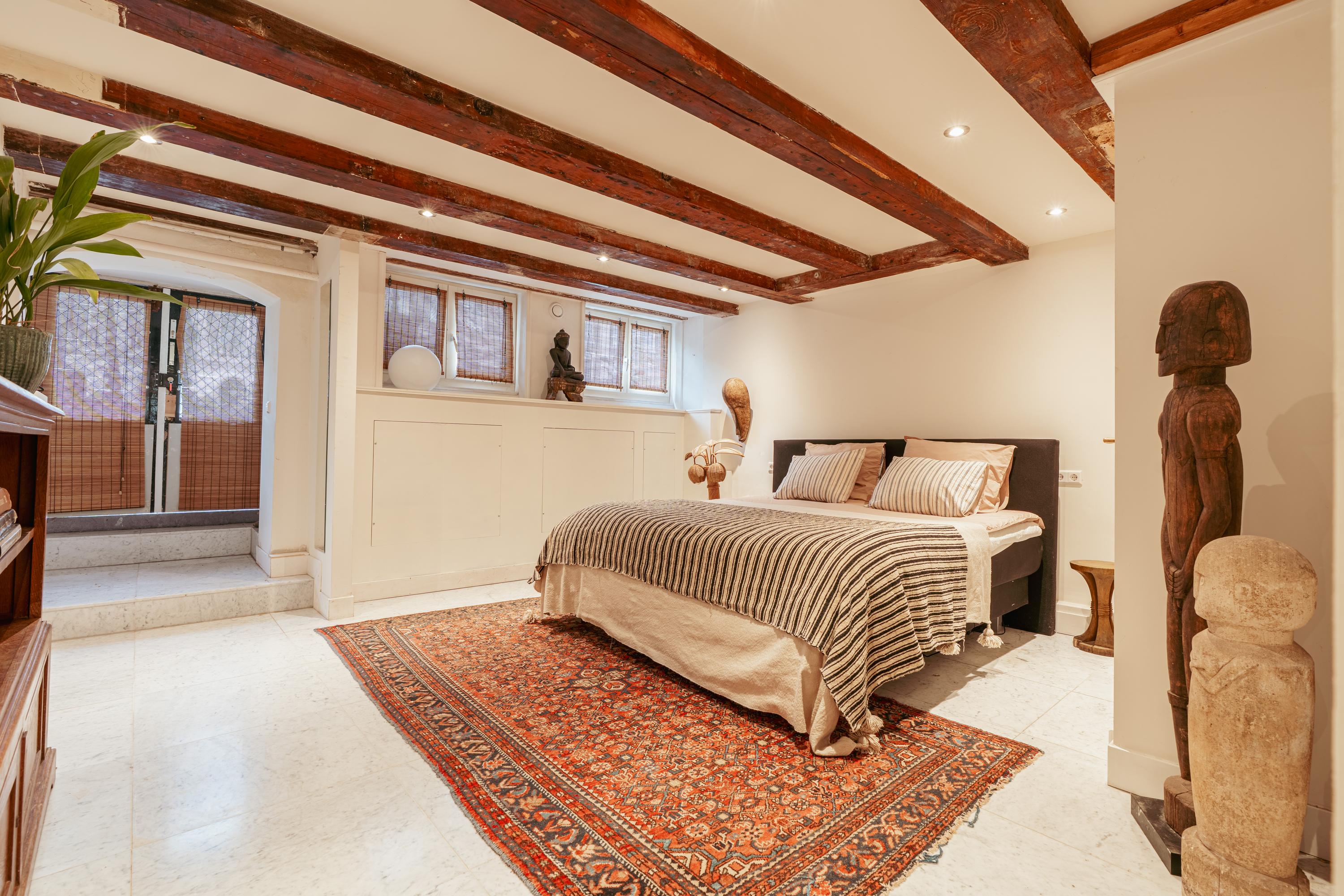 At the front of the apartment is a spacious room, ideal as a home office or separate dining room. This room also has its own private entrance from the communal hallway. At the rear is the living room overlooking the inner garden. Both rooms feature characteristic wooden beams and high windows, creating a pleasant influx of daylight.