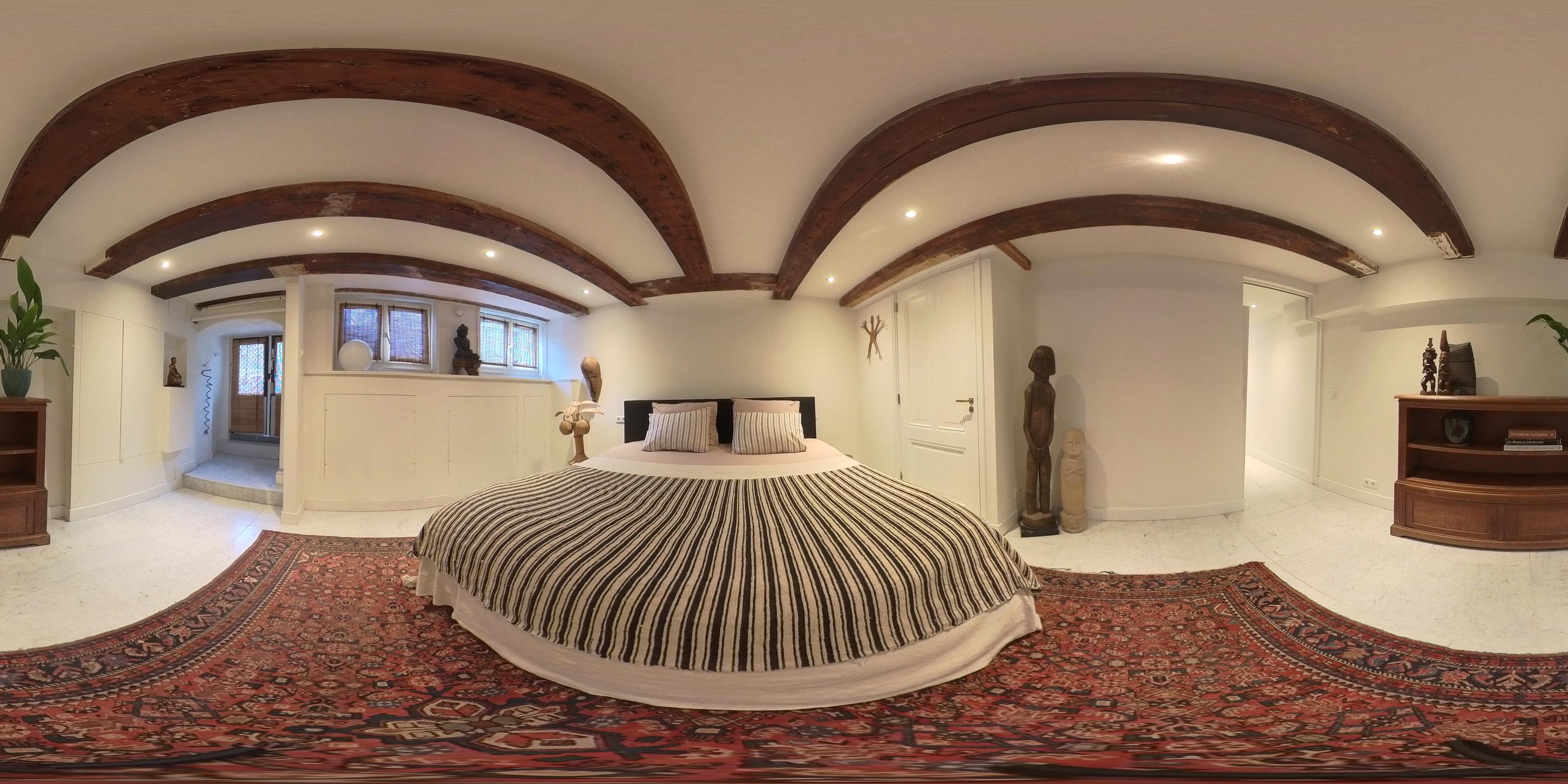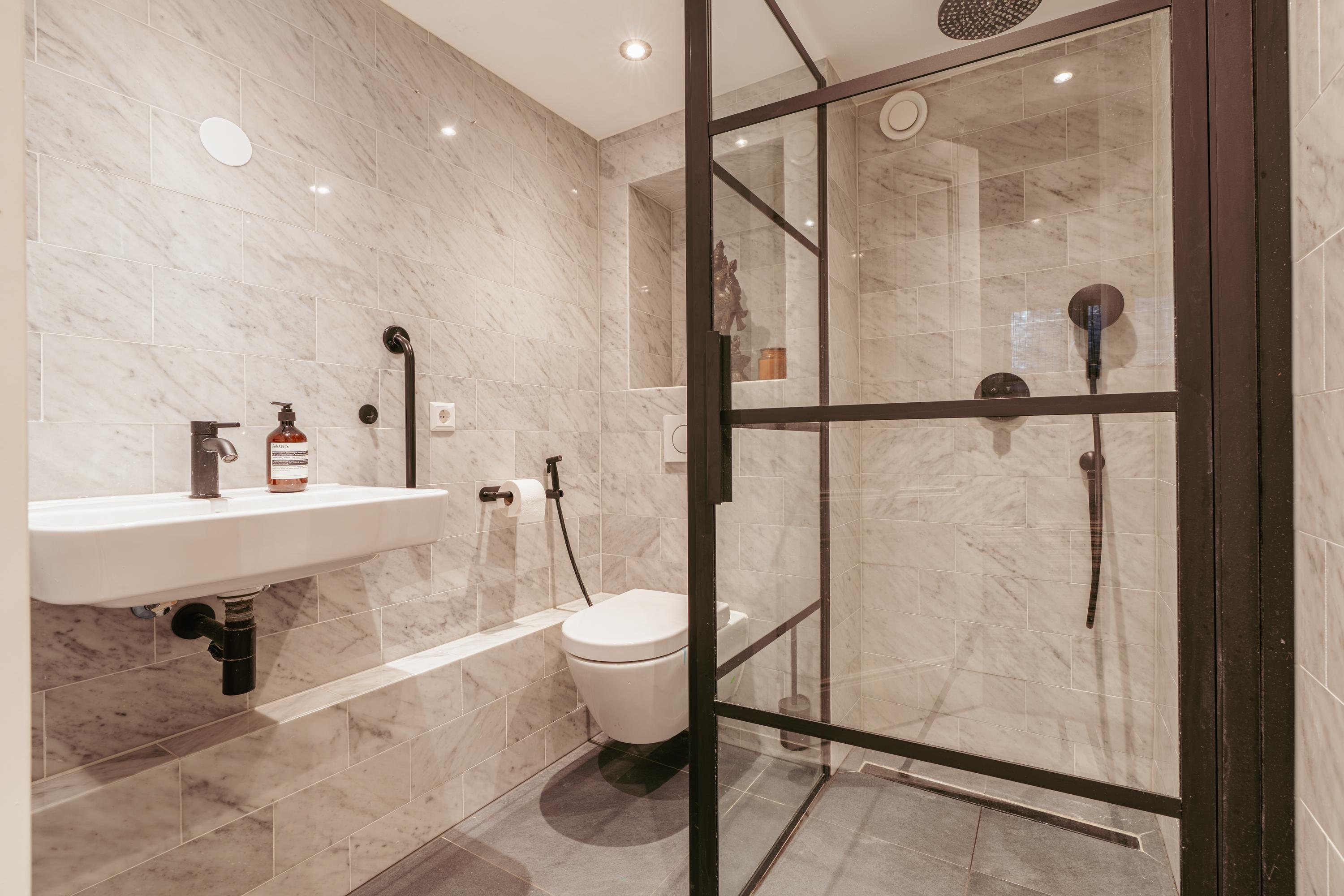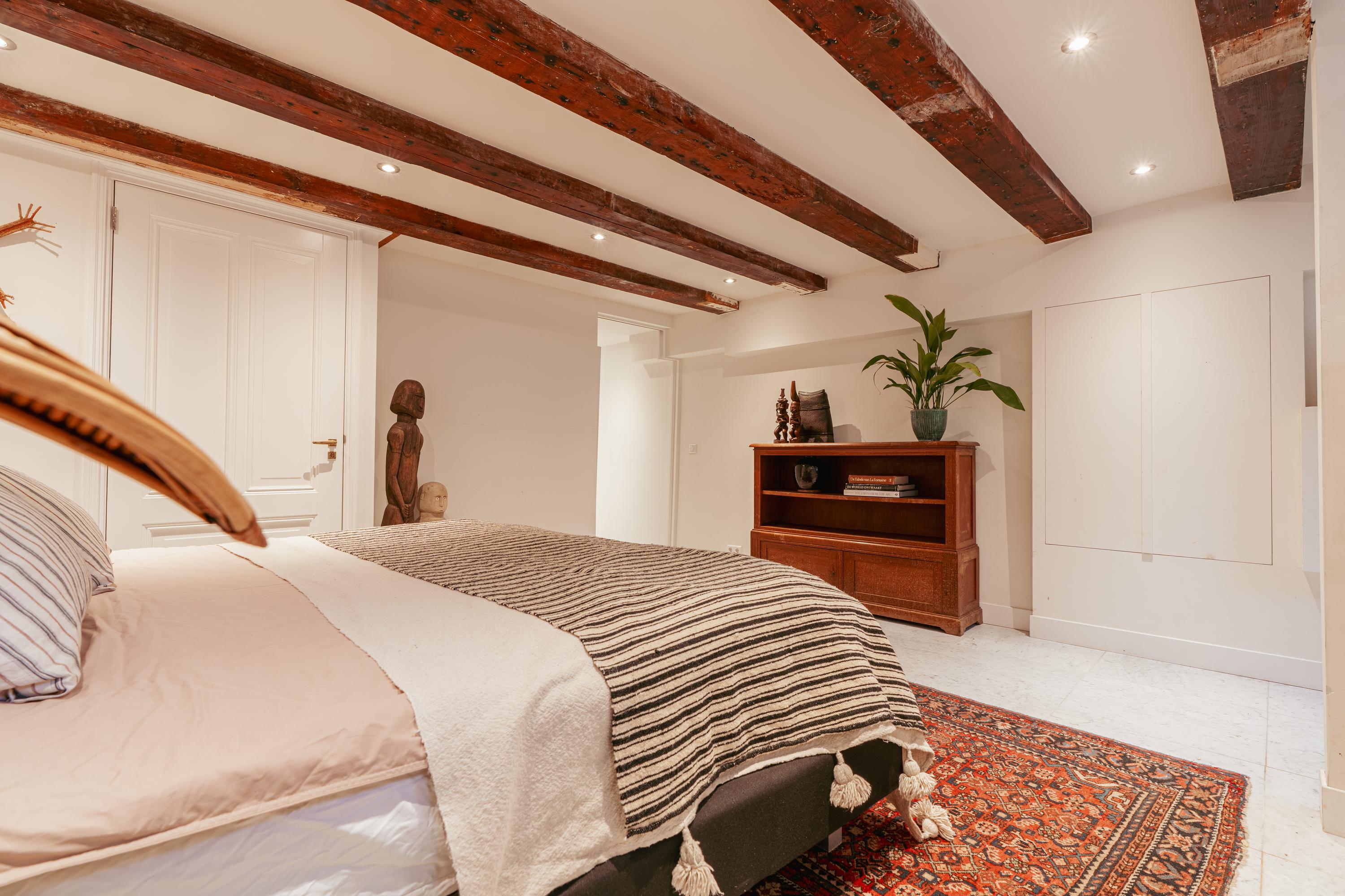 At the front of the basement is the spacious bedroom. This room is quietly located and offers sufficient space for a large bed and a wall of wardrobes. The bedroom also has direct access to the bathroom.