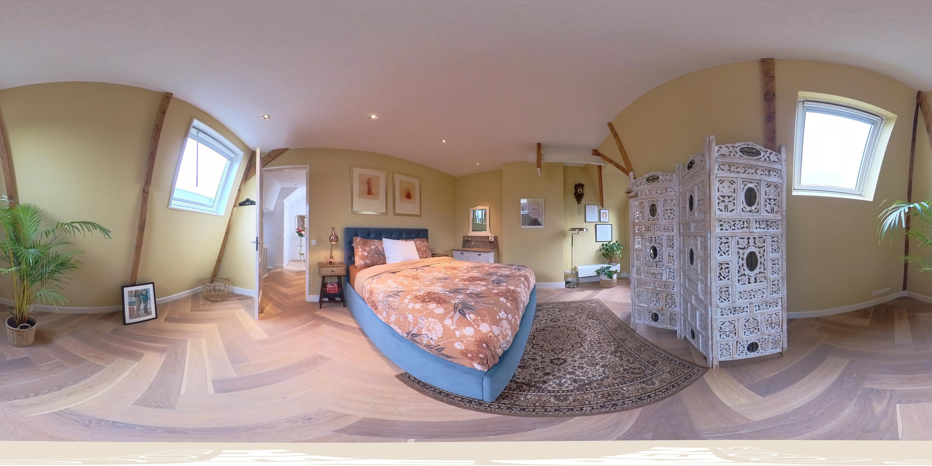 At the front, the generous master bedroom is finished in warm tones with exposed wooden beams. The charming arched window and dormers flood the room with natural light and provide a beautiful view of Artis. There is ample space for a king-size bed, wardrobe, and a sitting or working area.