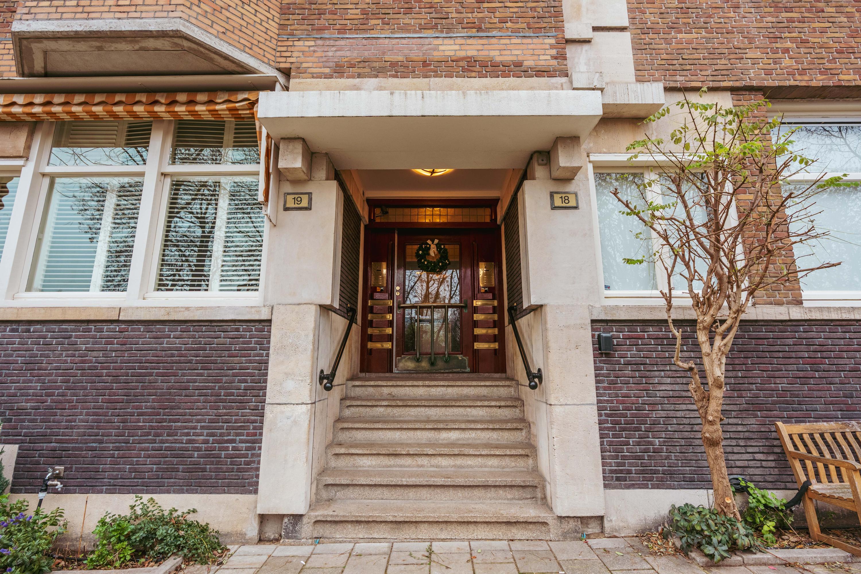 The communal entrance is neat and well maintained. You reach the second floor via the staircase or the elevator, where the private entrance to the apartment is located.