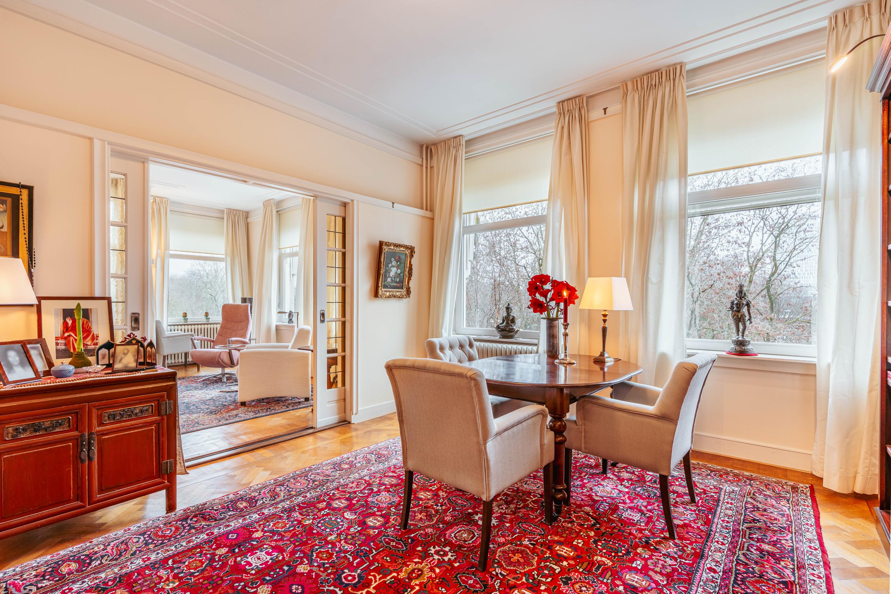 Adjacent to the living room is the dining room, a charming space offering ample room for a large dining table. Thanks to its connection to the living room, the layout forms one cohesive living area, while still allowing both rooms to be used separately if desired.