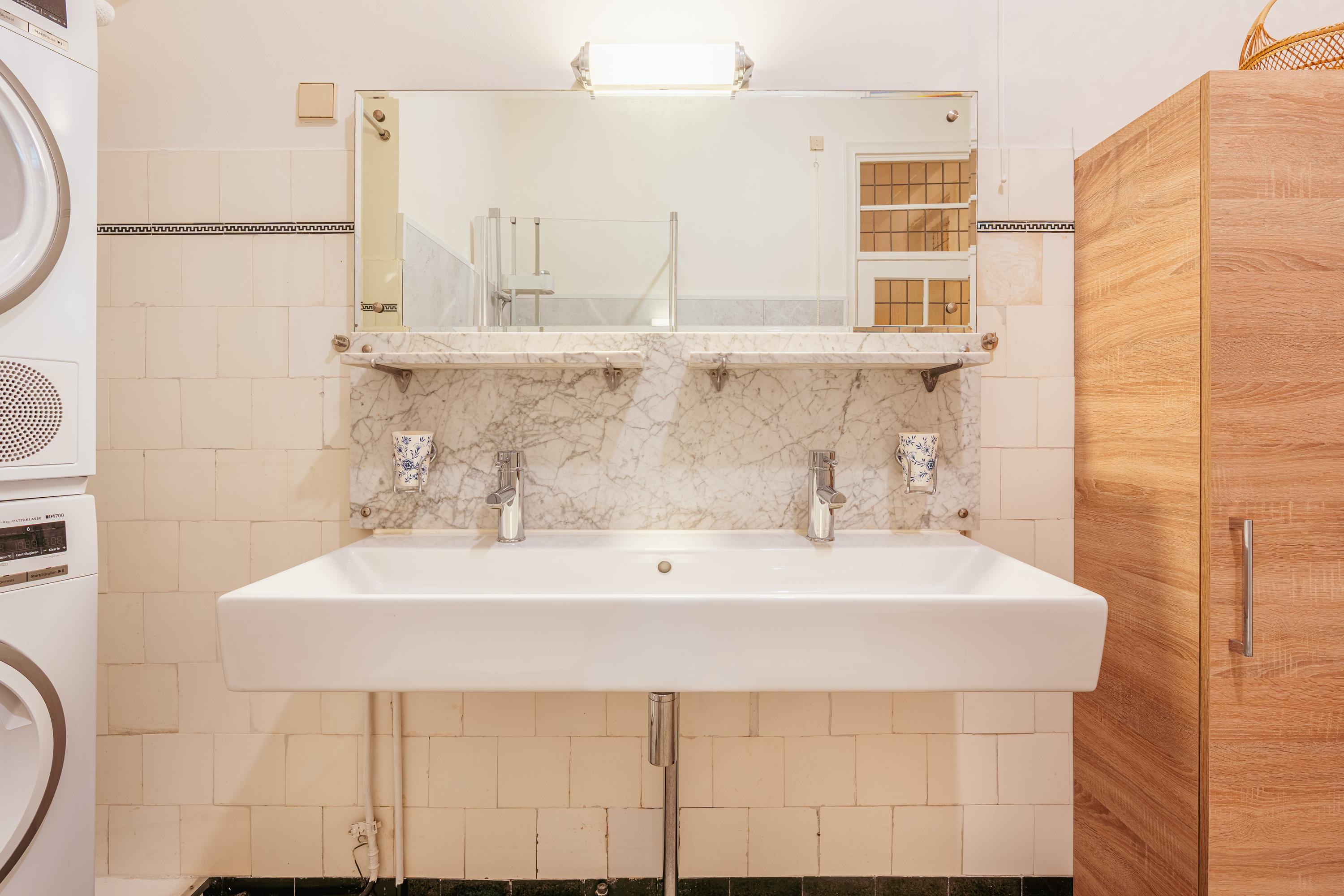 The bathroom is centrally positioned within the apartment and is neatly finished and practically arranged, featuring a walk-in shower, double washbasin and toilet. Furthermore, there is space for a washing machine and dryer setup, ensuring maximum convenience.